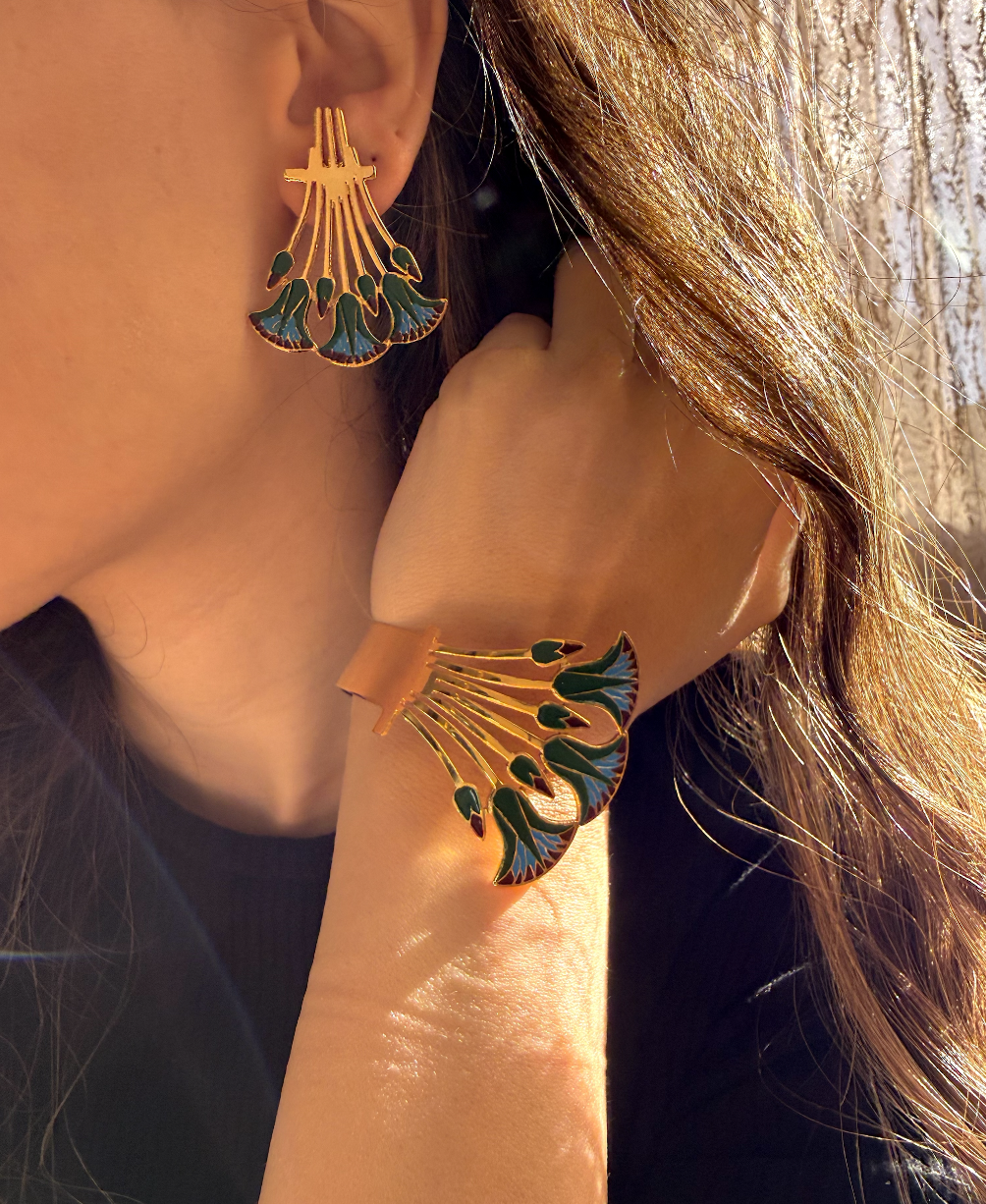he Coloured Bouquet earring is a gold-plated statement piece blooming with fan-shaped enamel petals in rich green, turquoise, and deep red, elegantly wrapping the wrist like a vibrant floral arrangement.