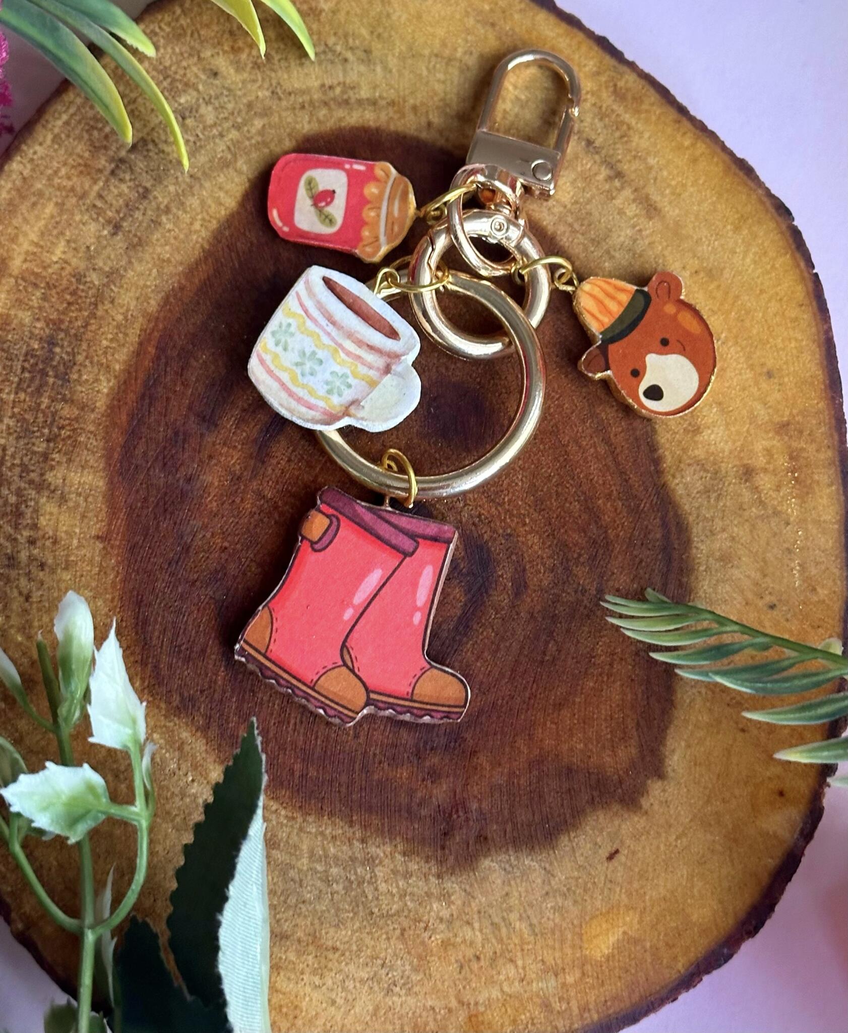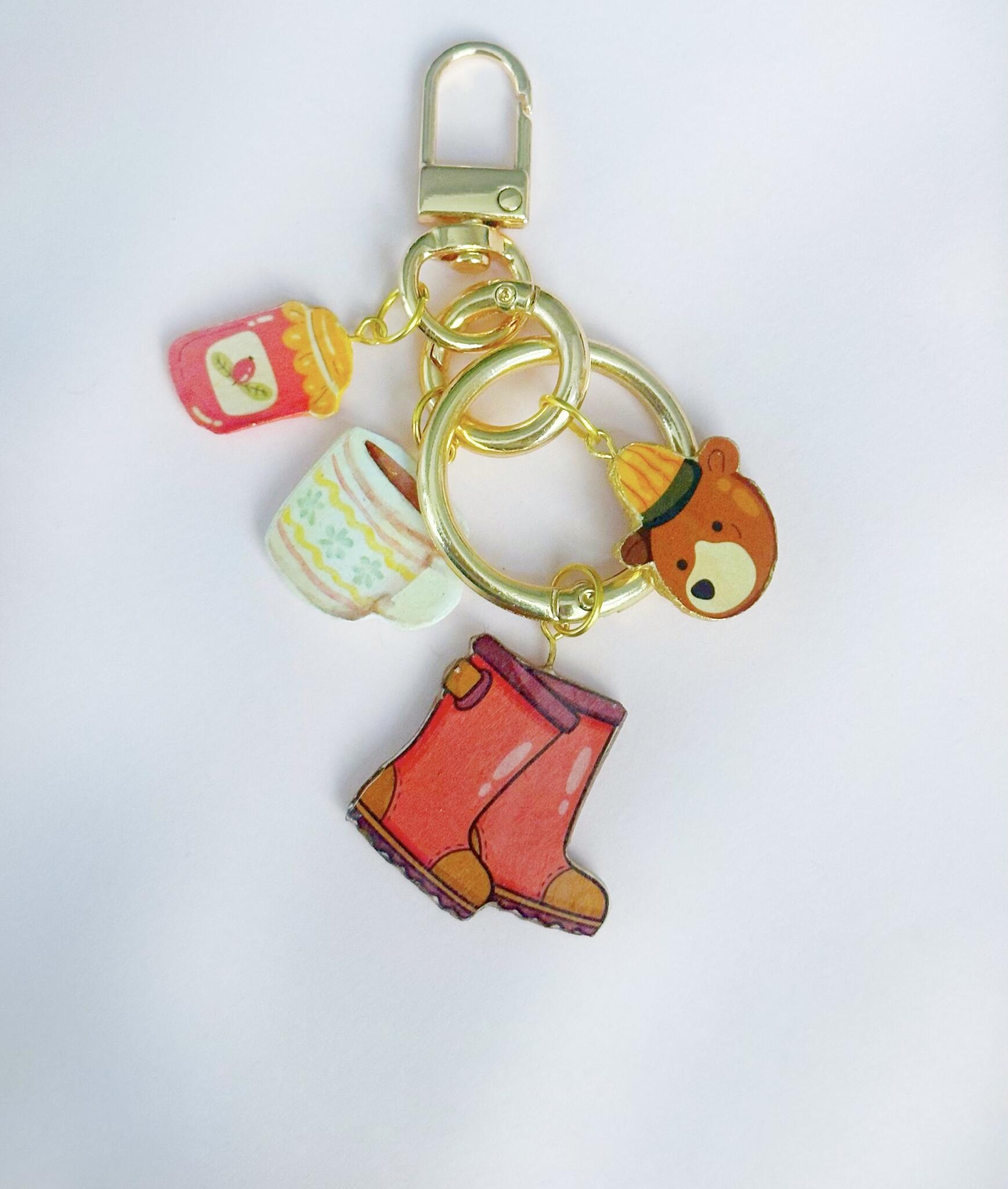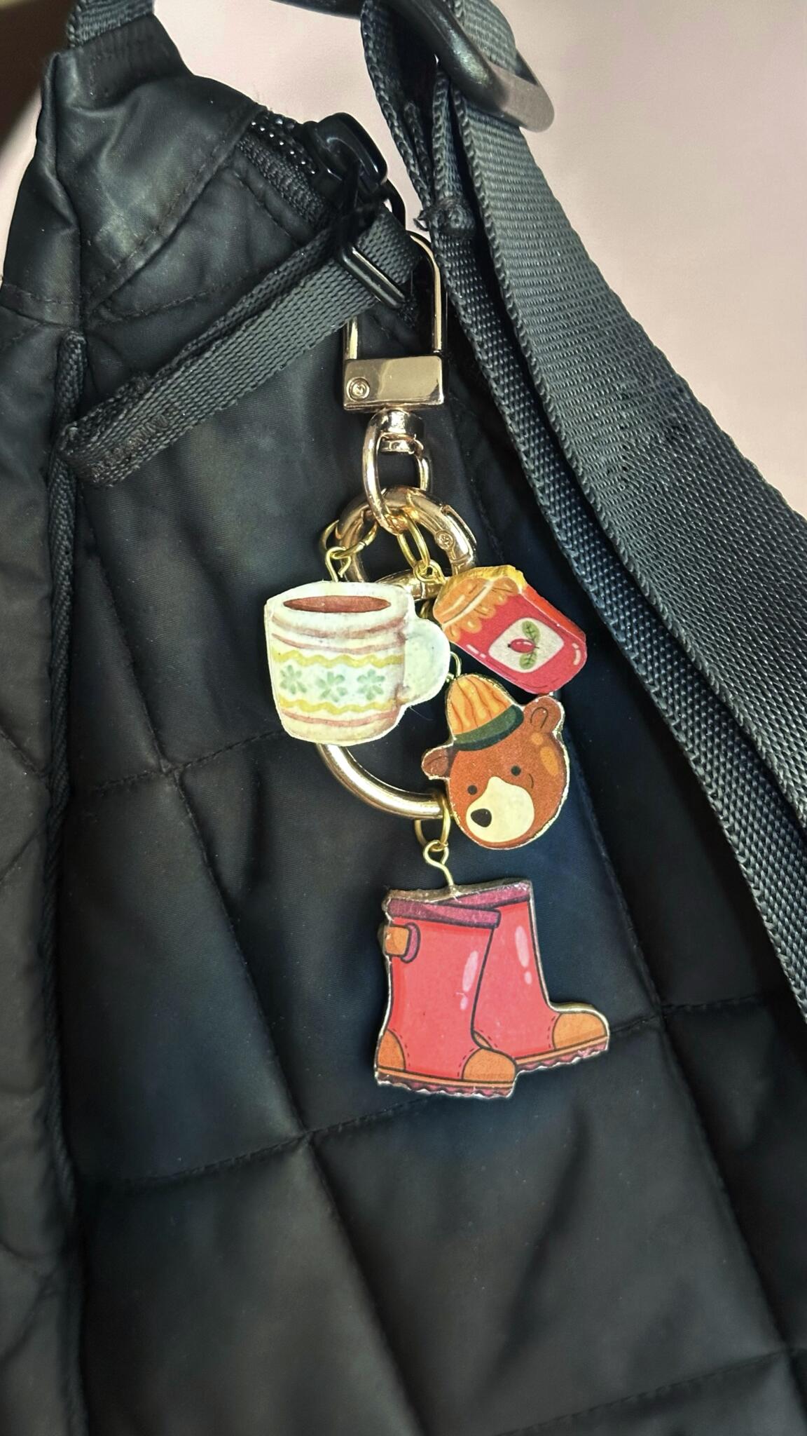 A bag charm or keychain features four autumn-inspired charms (Boots, teddy bear, mug and jam jar) adding a warm and cozy touch to your bag or keys.