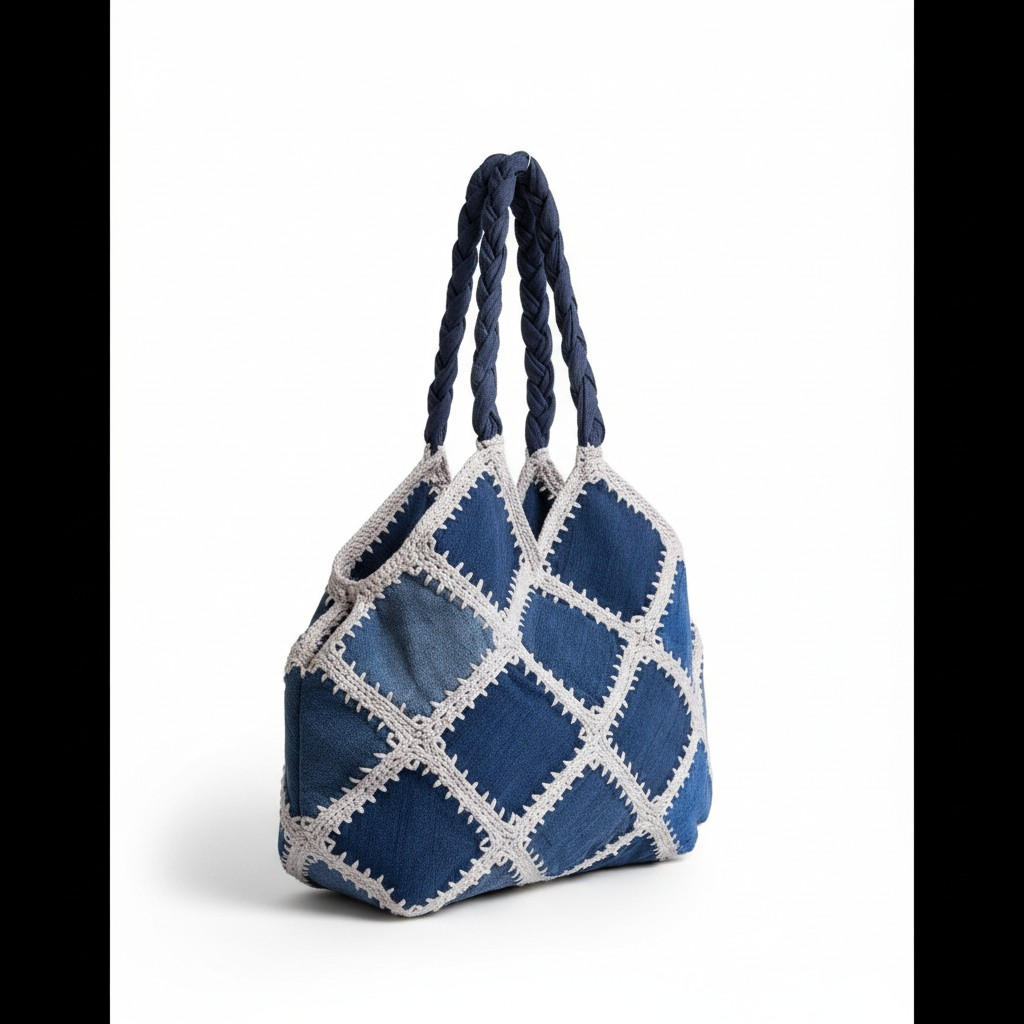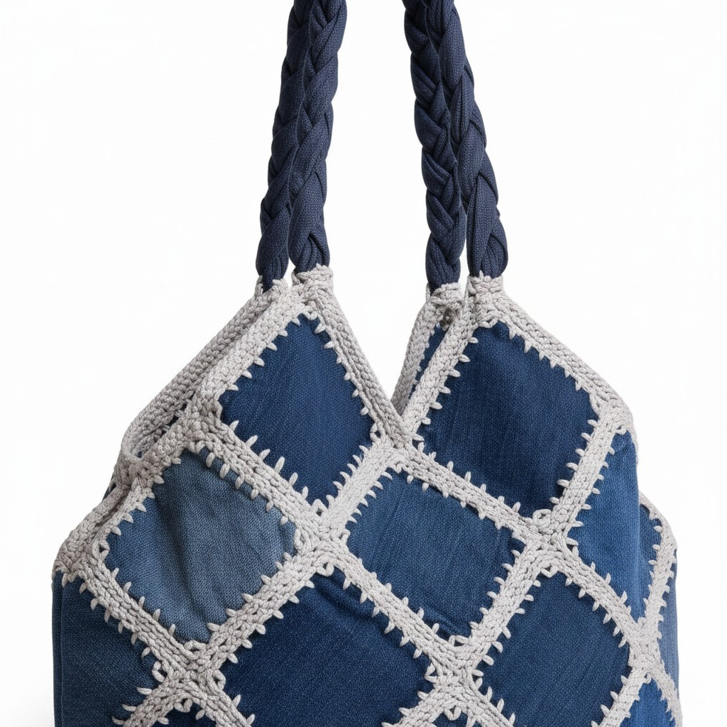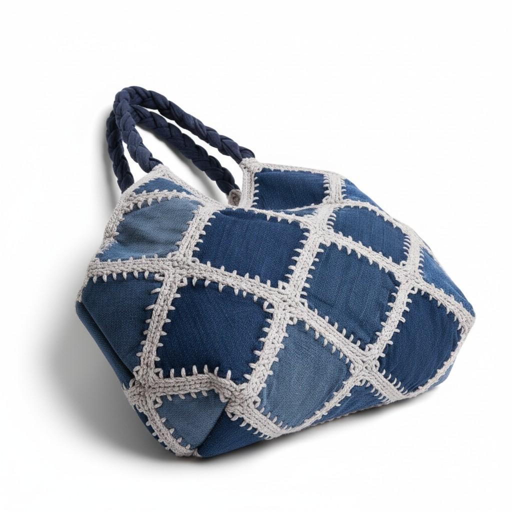 Tote crochet bag mixed with jeans patches, inner lining with pockets and zipper.