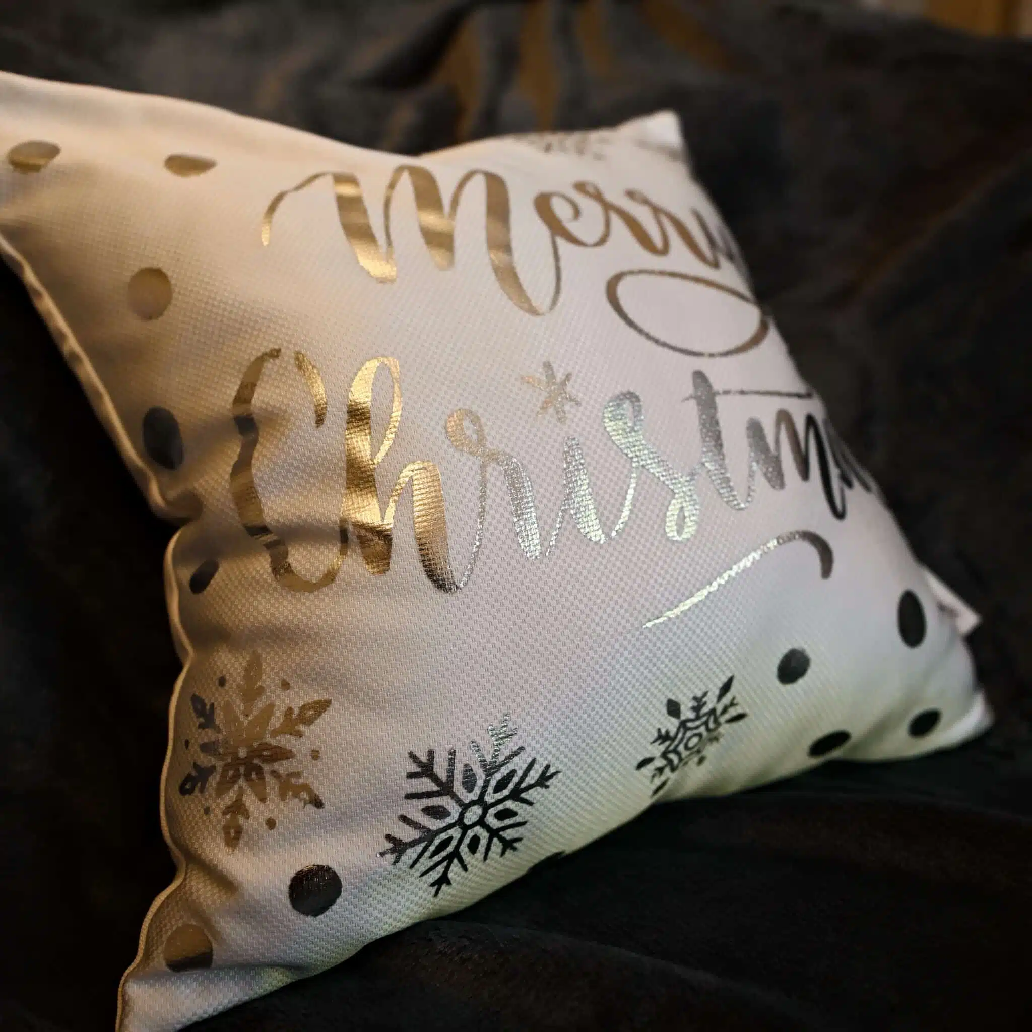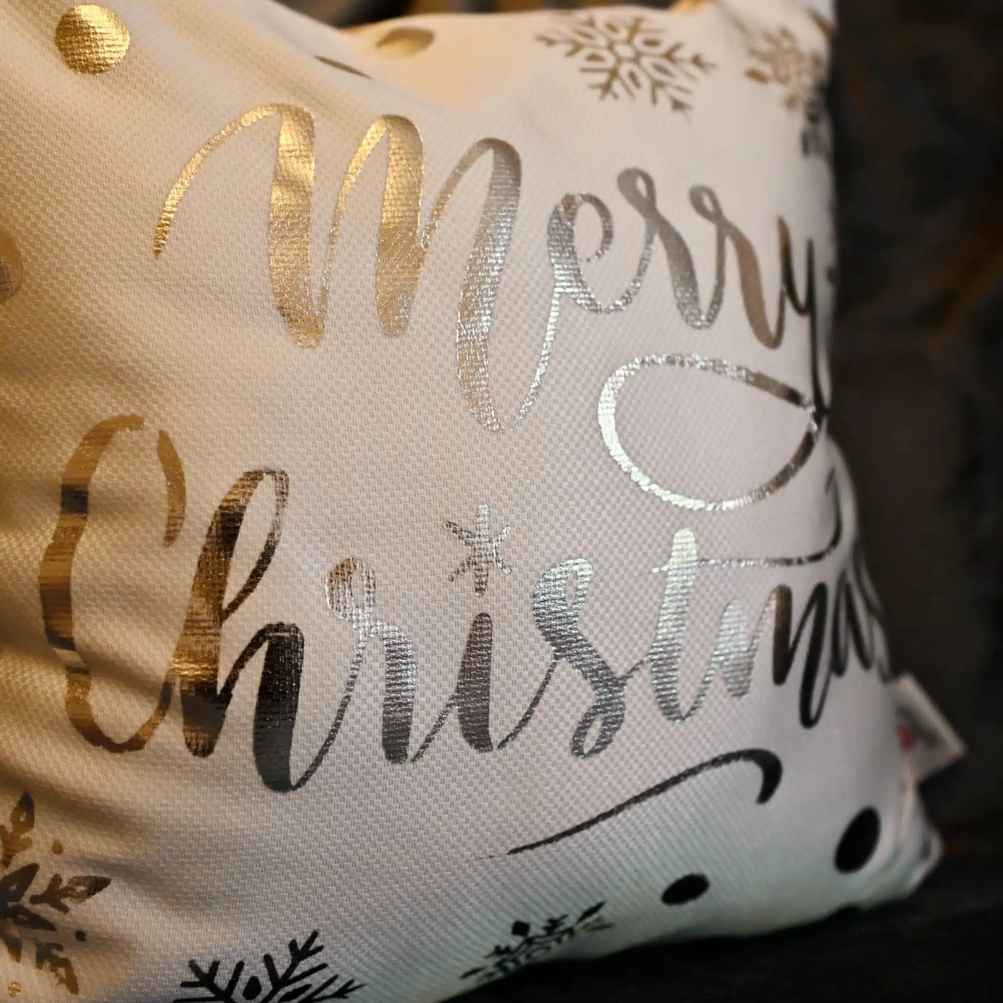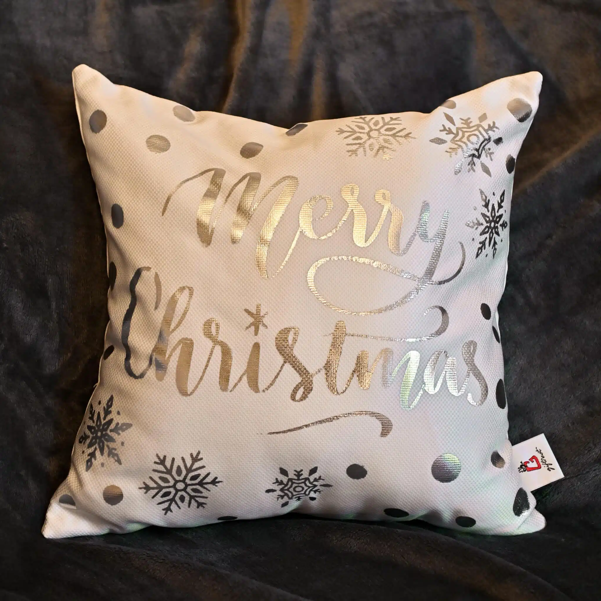 Silver Foil Printed Cushion ,size 45*45 with caption merry christmas, and plain white back.The cushion is with zipper and filling ,hand wash is recommended ,no rinse or spin and no dryer