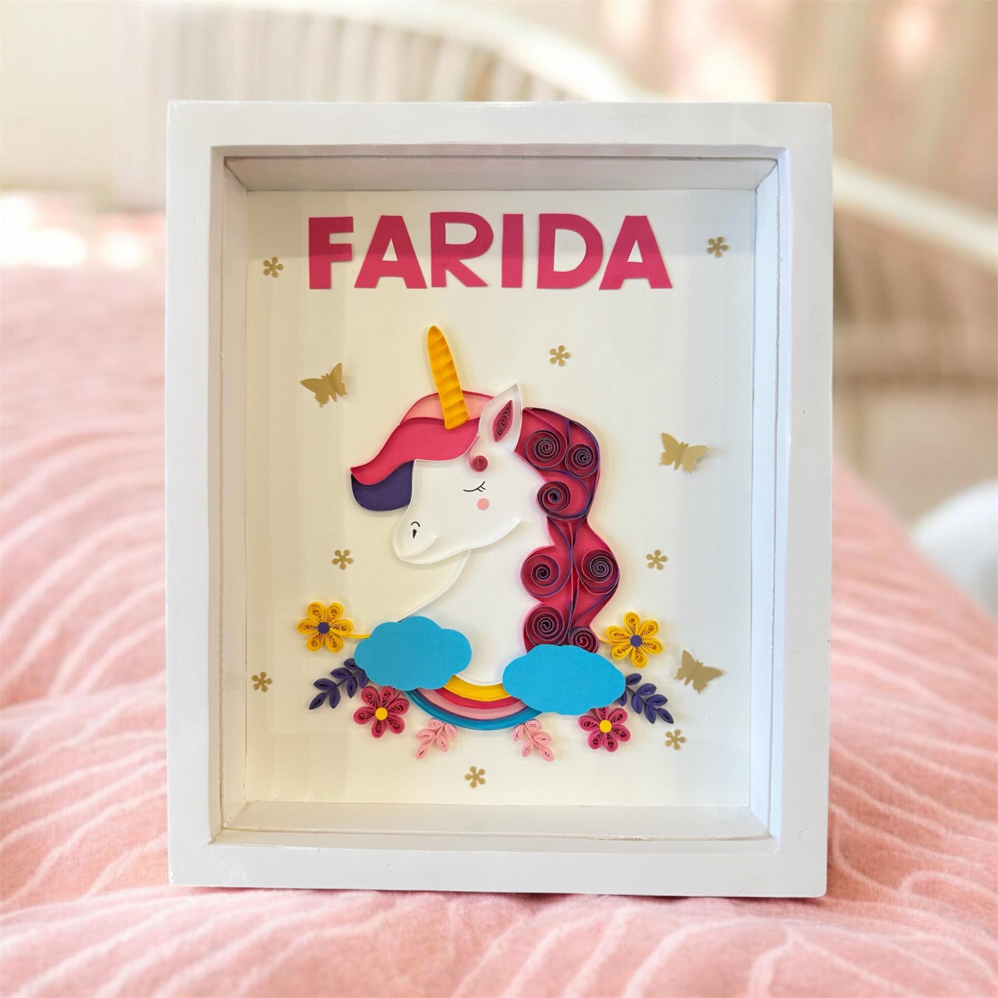 Customized handmade paper quilling frame for your kid’s room.