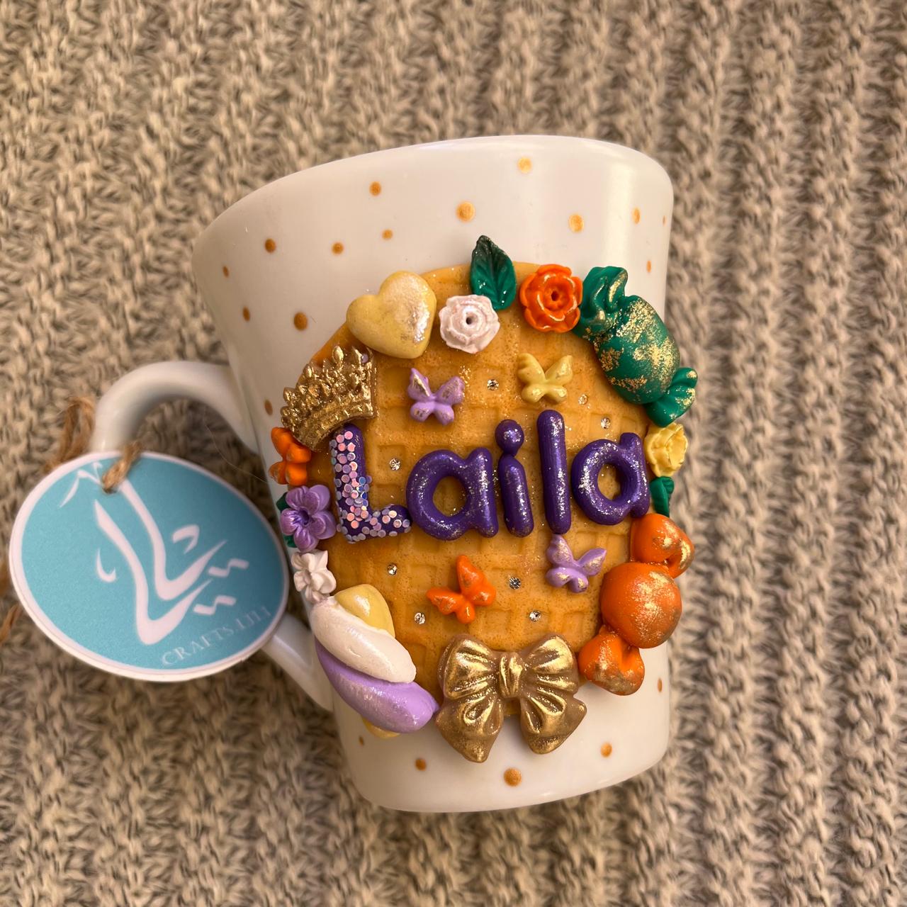 This unique handmade mug is carefully decorated with sculpted clay details and a personalized name, making it a perfect gift for birthdays, special occasions, or everyday use.