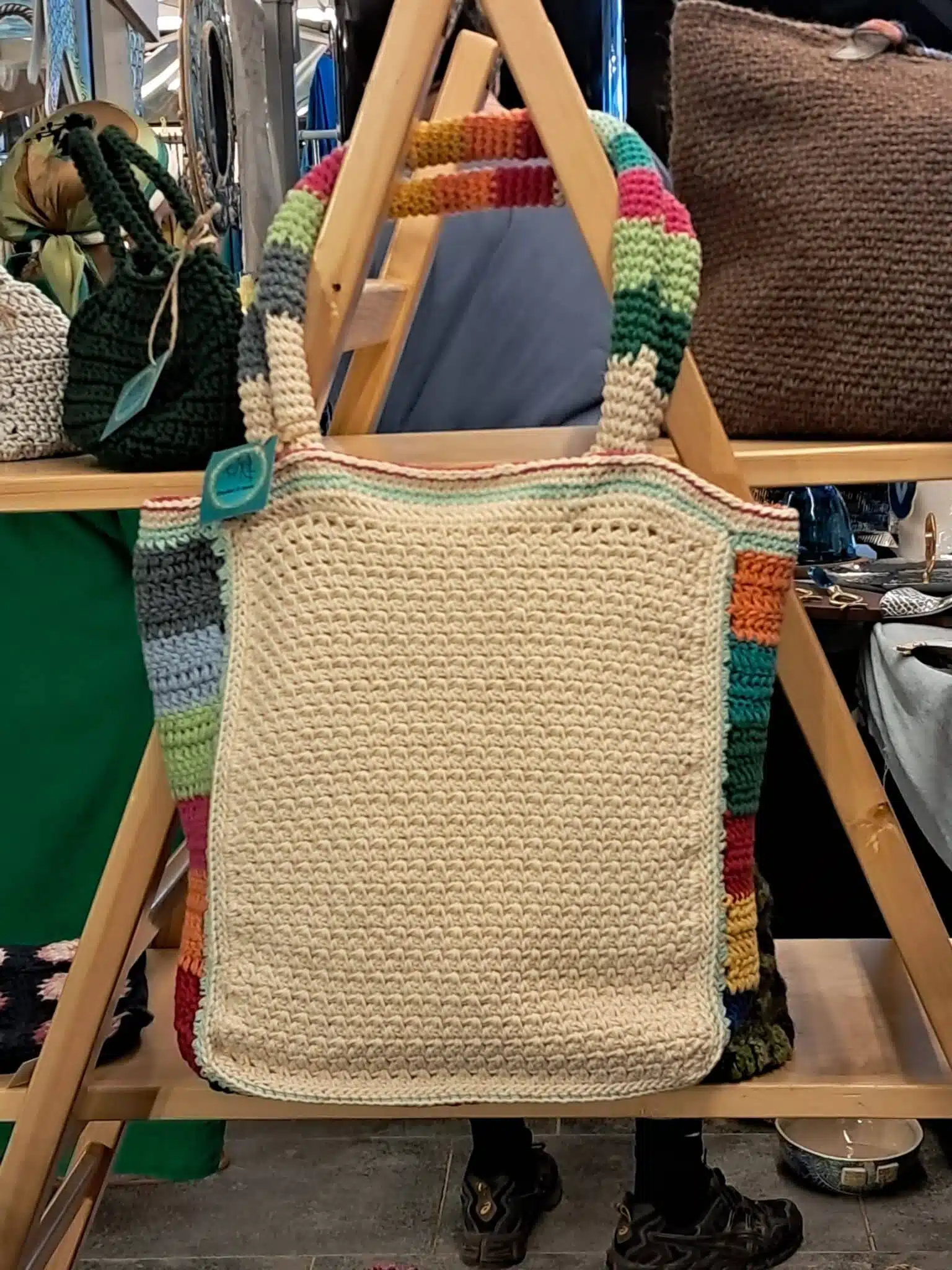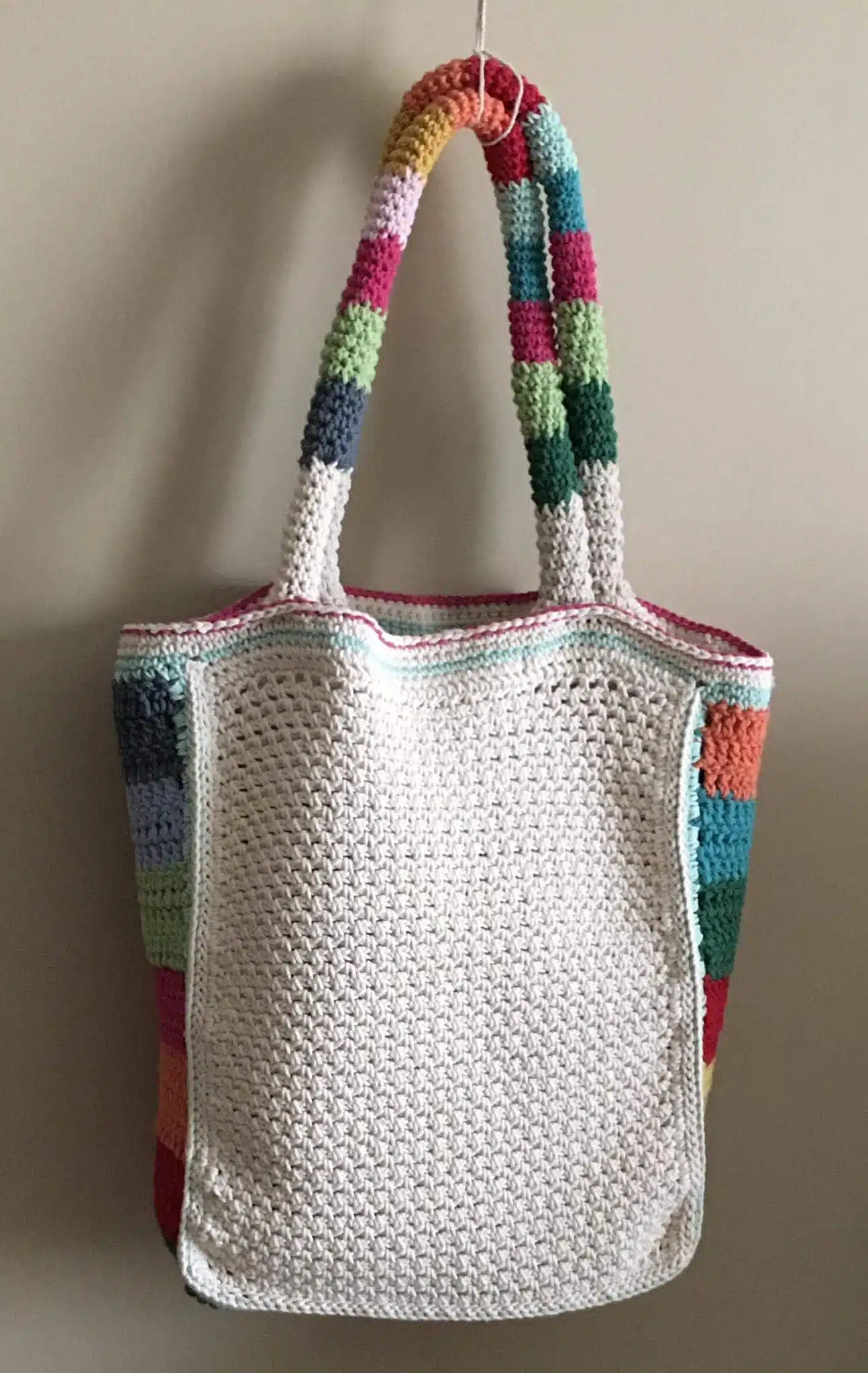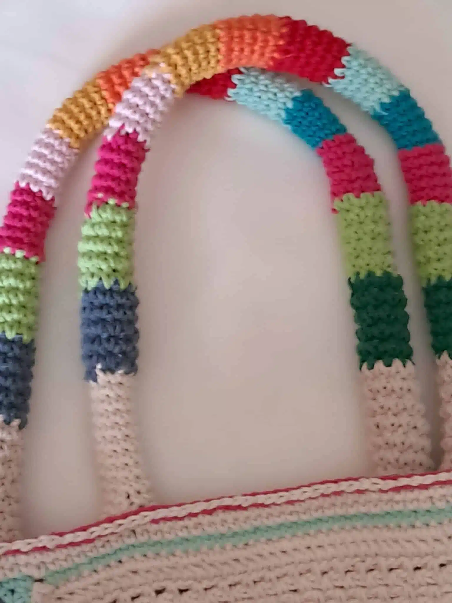 Handmade crochet bag, off white made of cotton with colorful handles