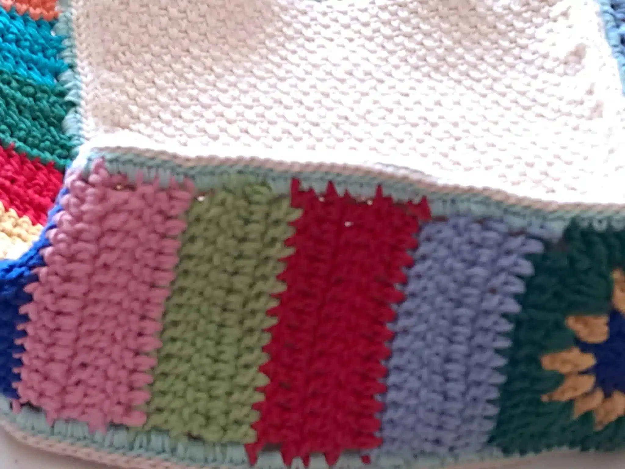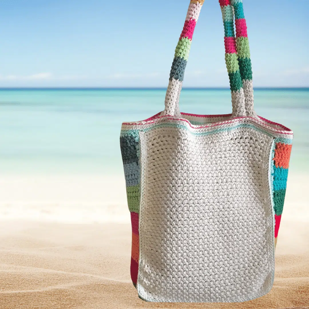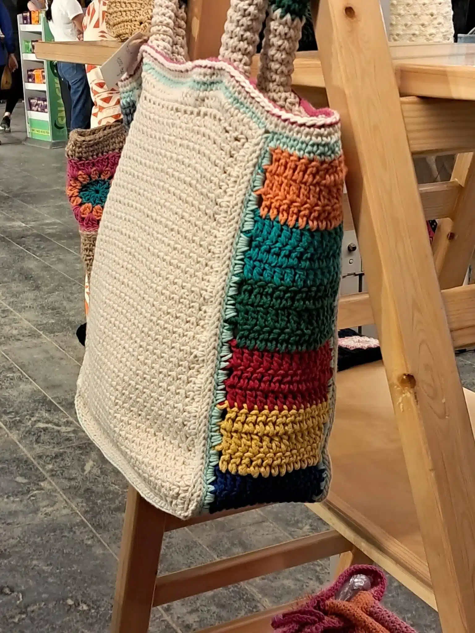 Handmade crochet bag, off white made of cotton with colorful handles