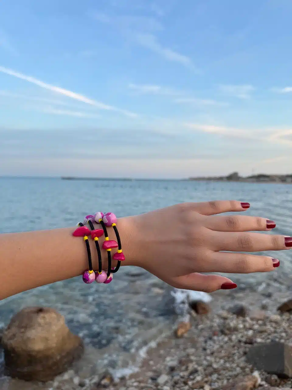 Stylish spiral bracelet in cheerful colors made of velvet covered wire and colorful beads made of polymer clay.