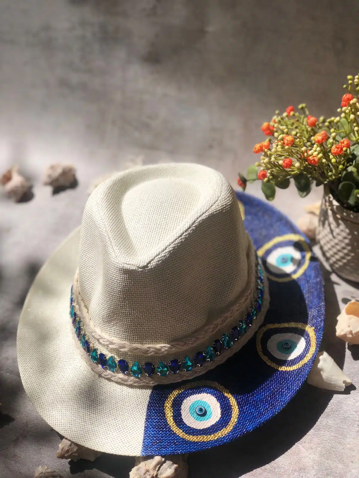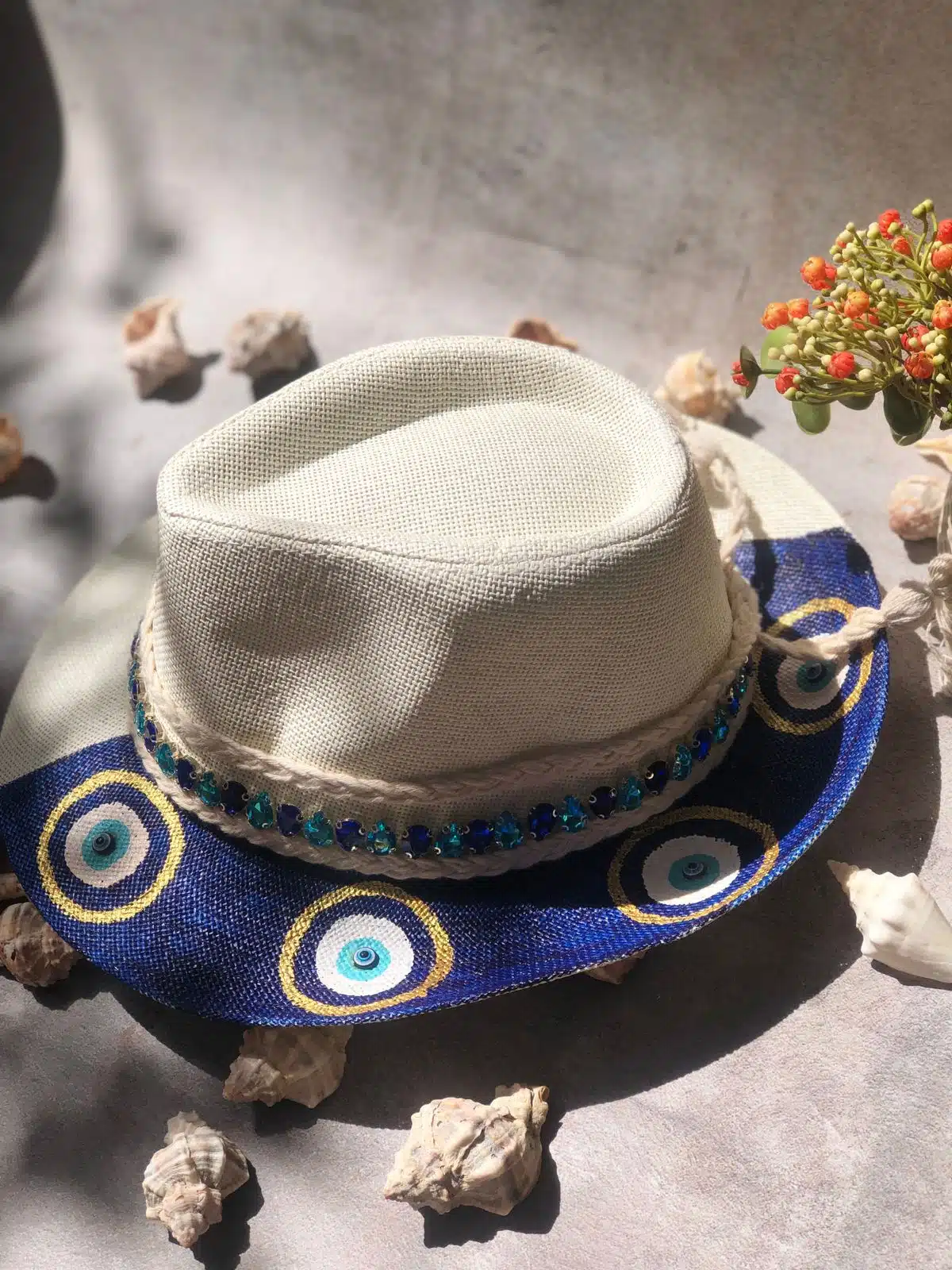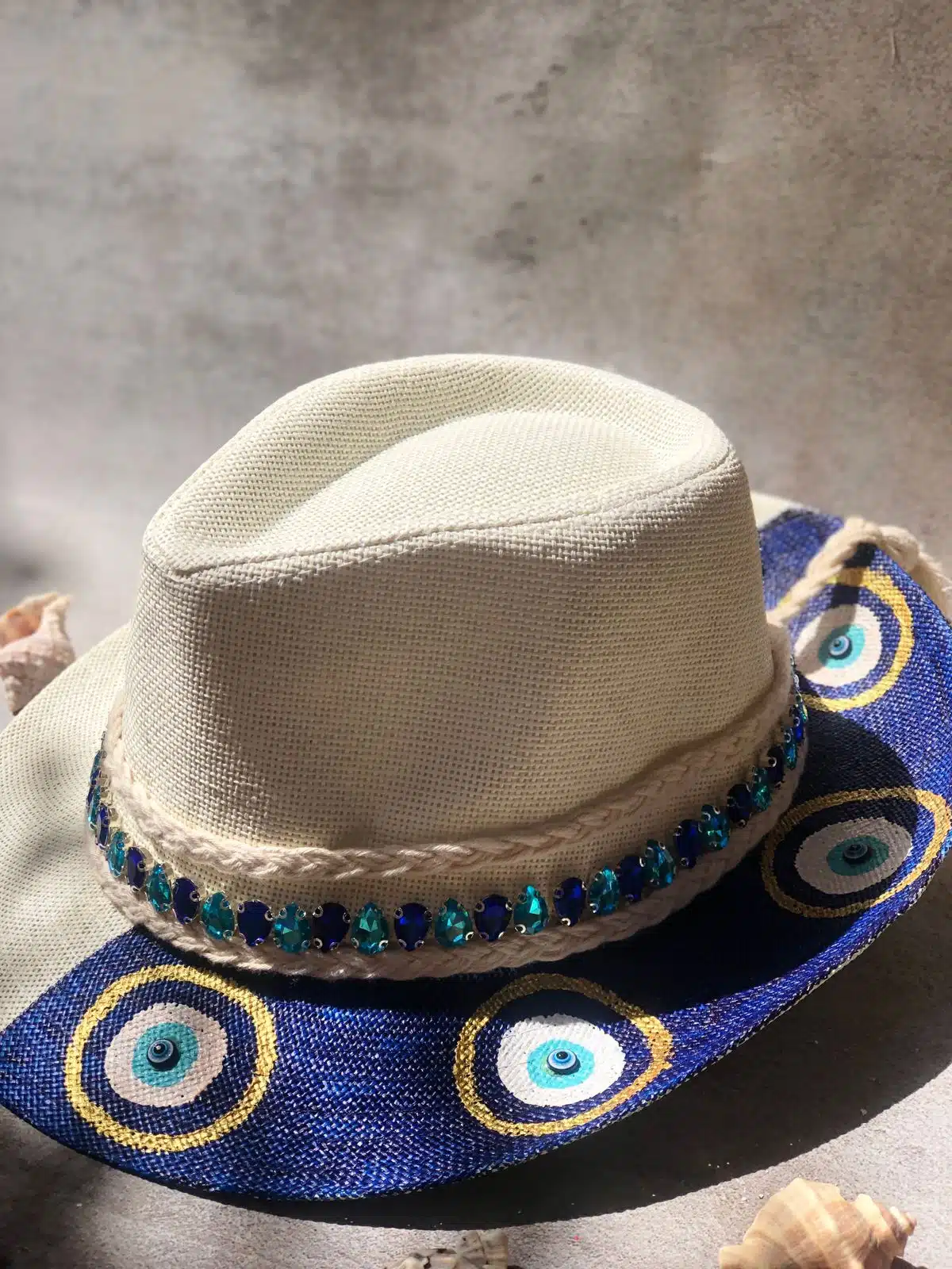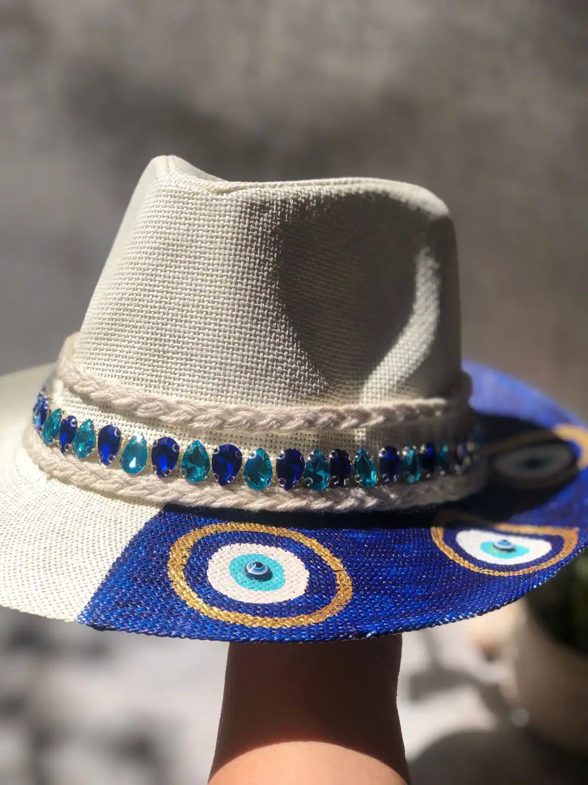 Hand painted dark blue eyes on one side of hat hand decorated with shiny blue stones