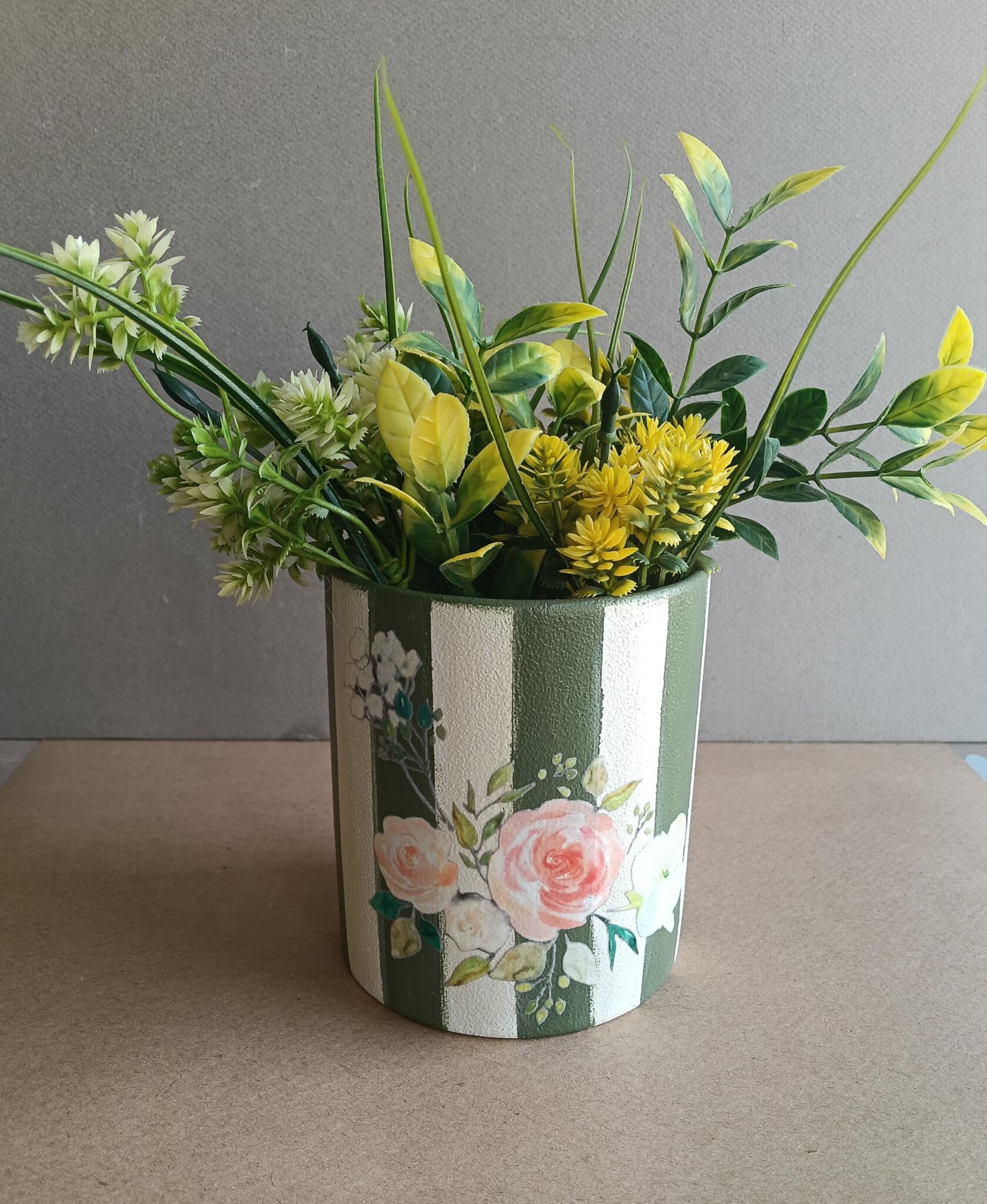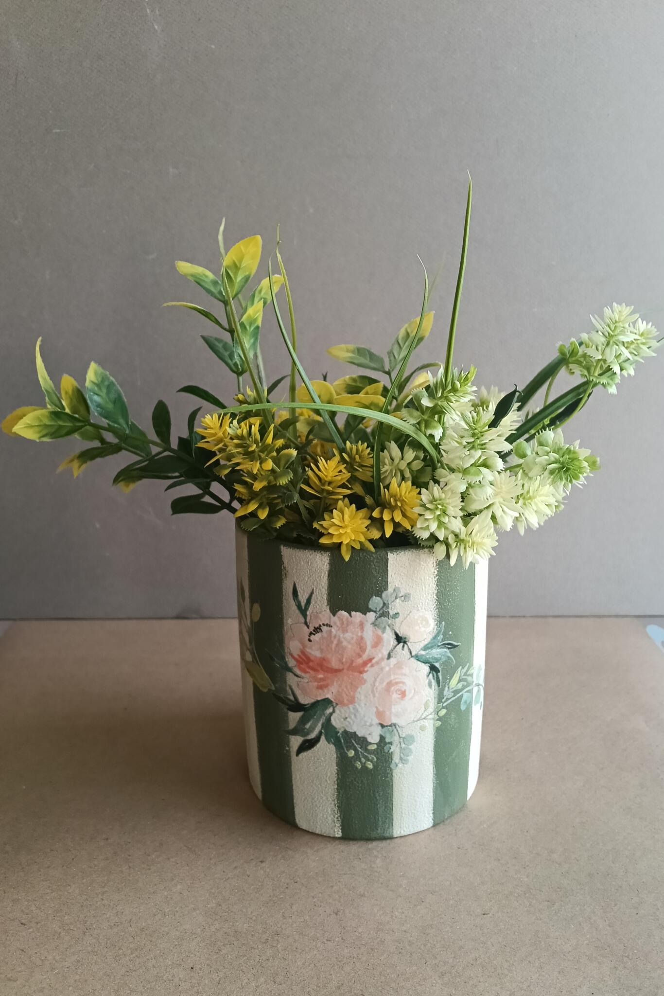 Porcelain pot 12cm high painted and decorated with a peach flower and comes with artificial green leaves