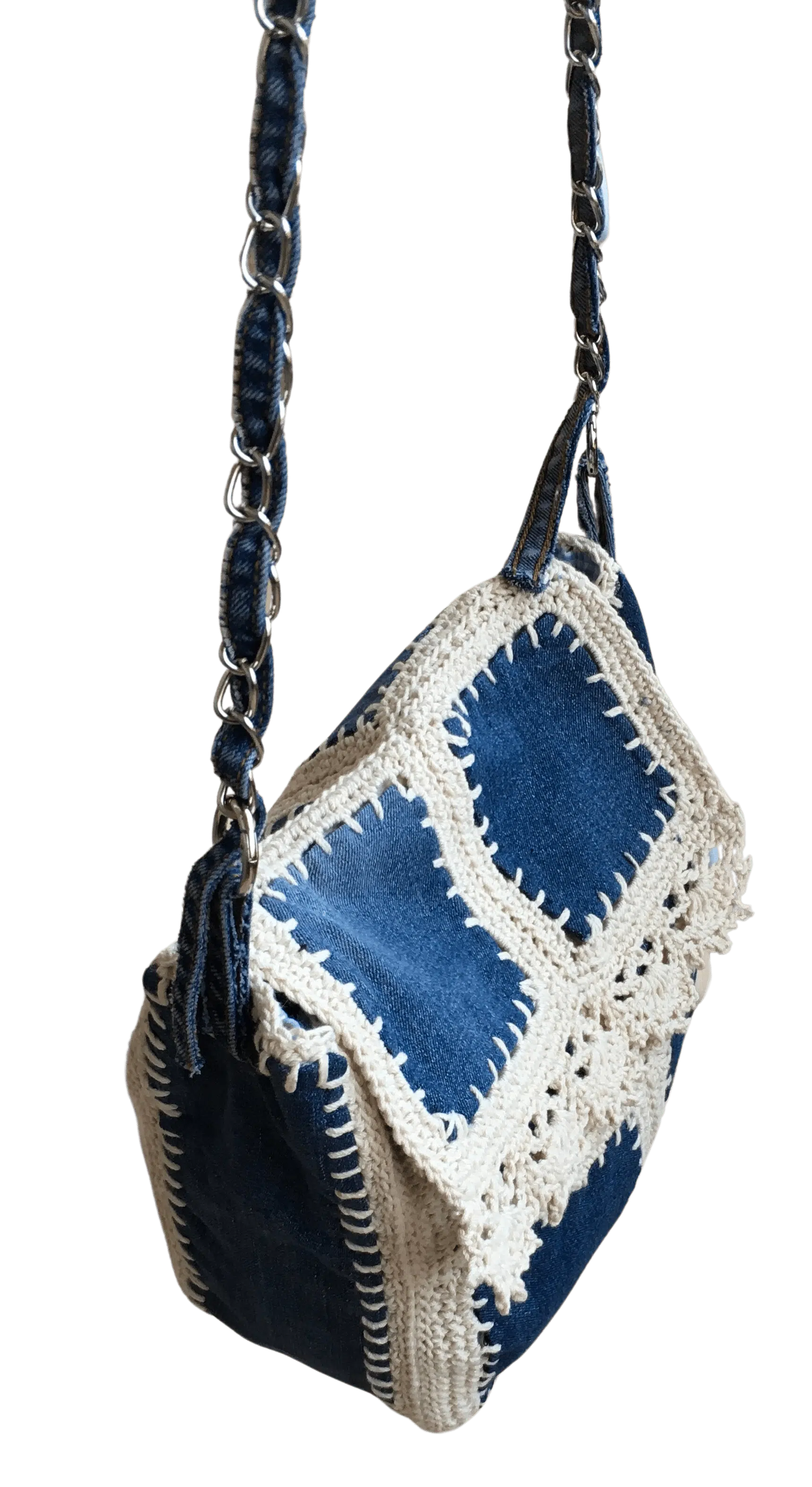 Handmade crochet bag made by mixing off white cotton yarn with blue denim jeans