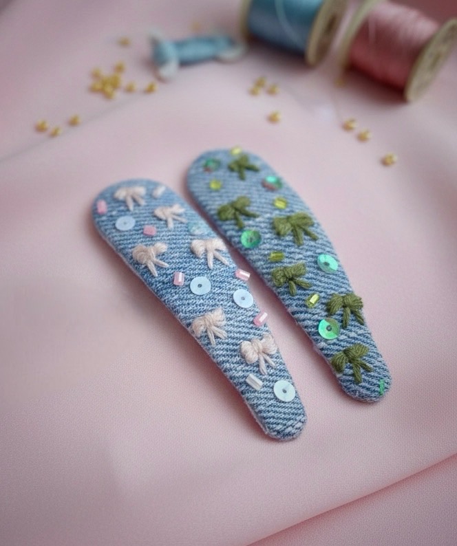 Hand-embroidered denim hair clip with thread and shiny sequins. 100% handmade with love.