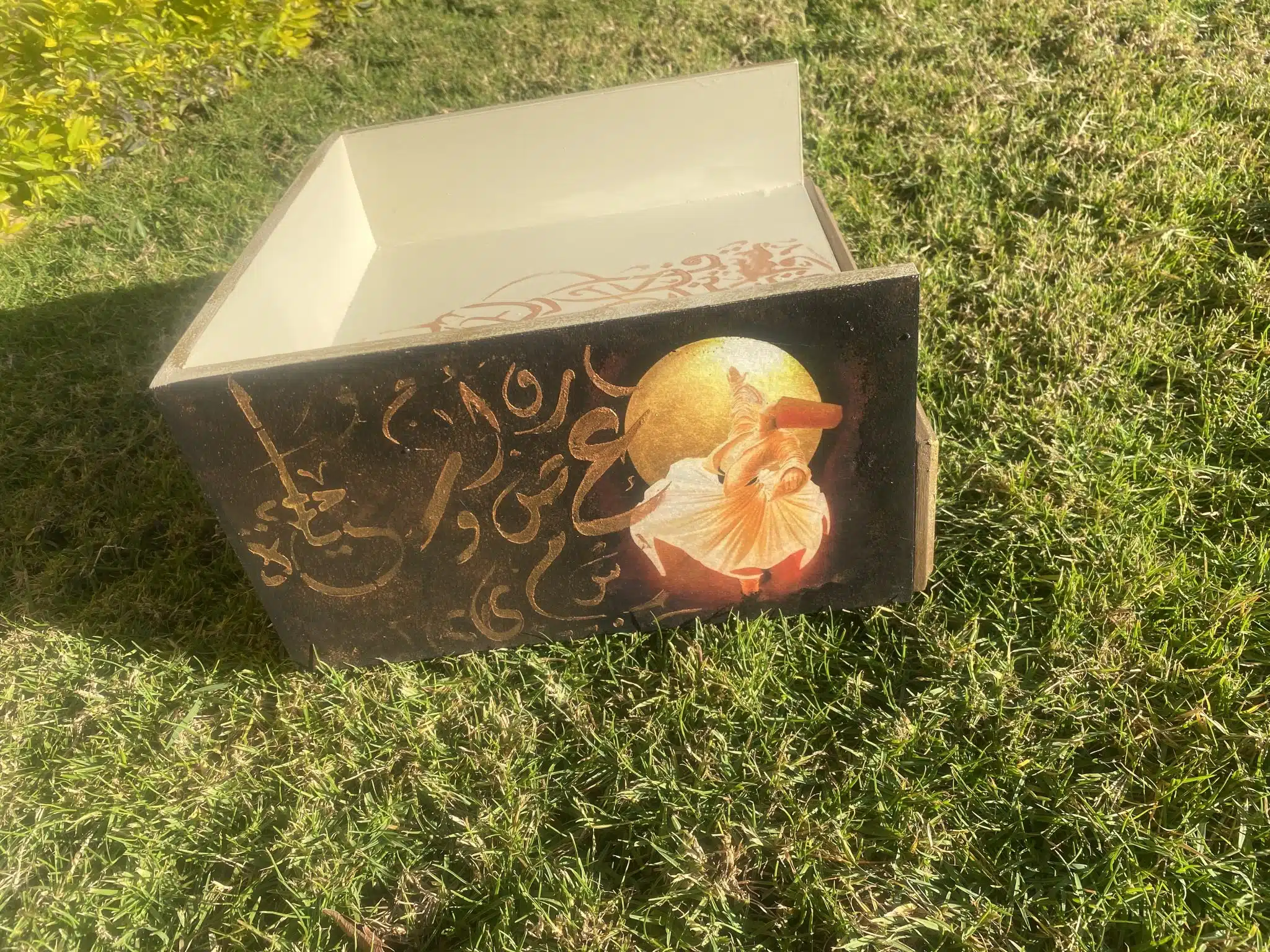 Wooden box for plates and cutlery organization in arabic calligraphy and dervish design