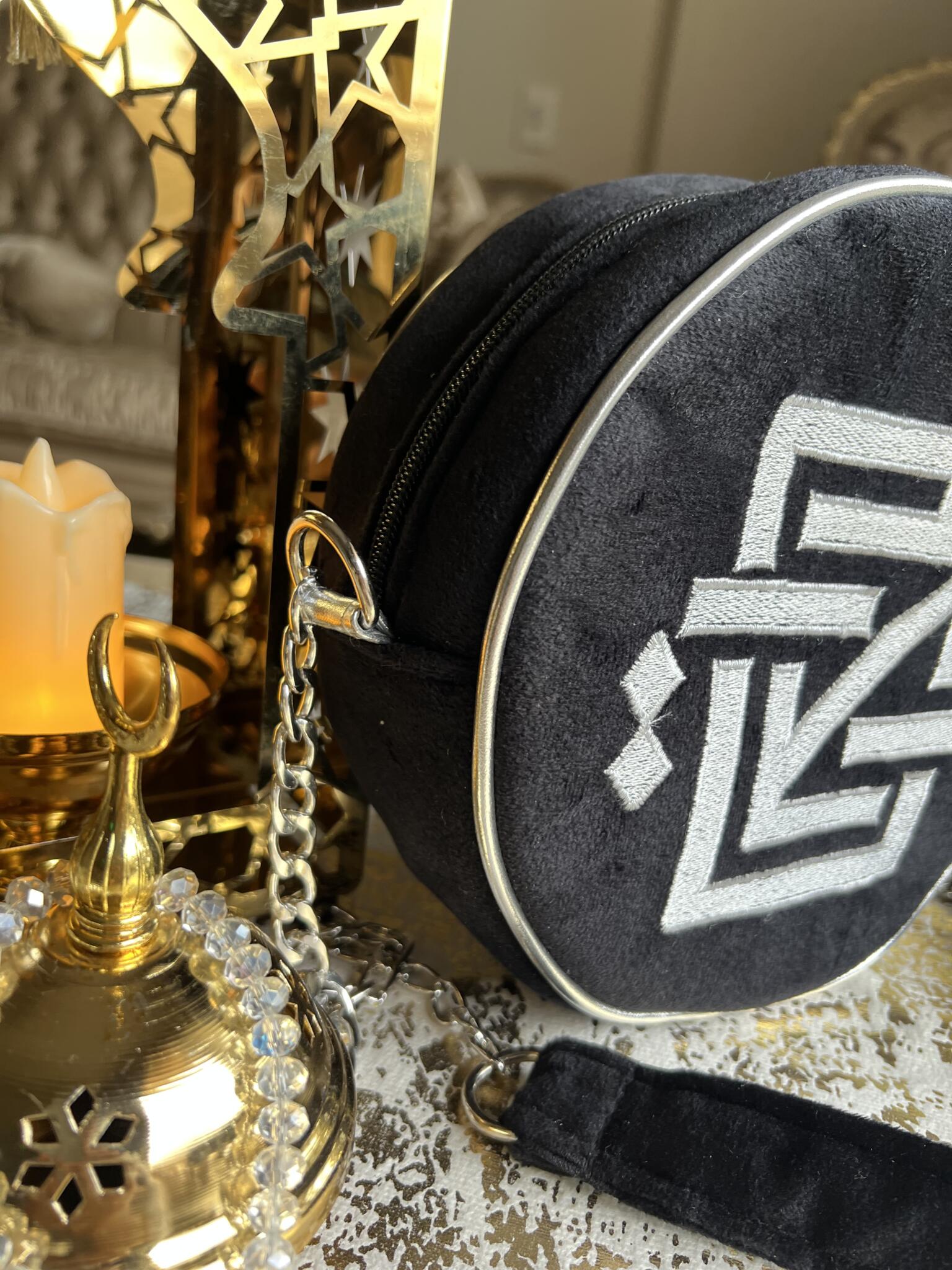 A bold geometric crossbody bag influenced by Kufic art, crafted to make a sophisticated