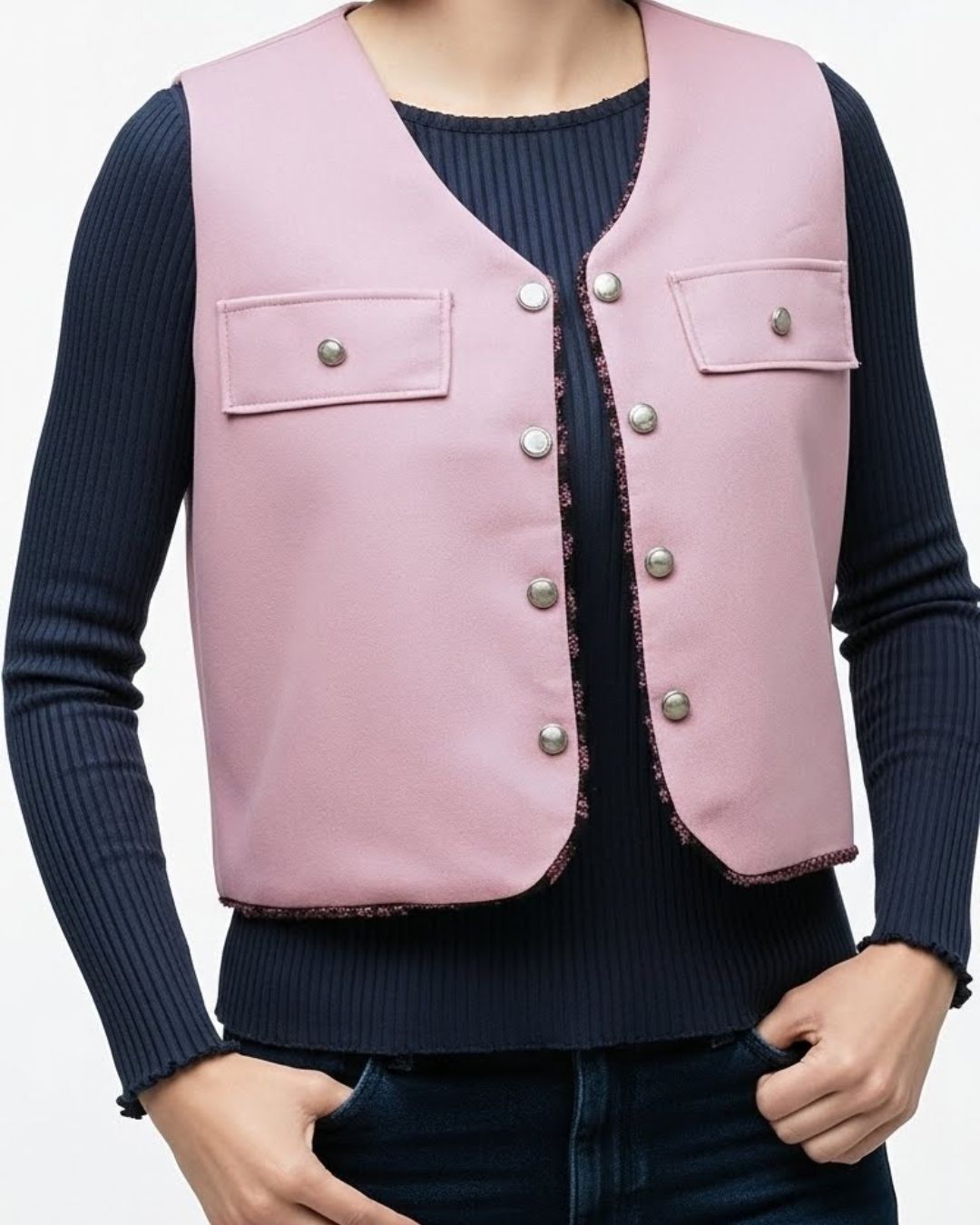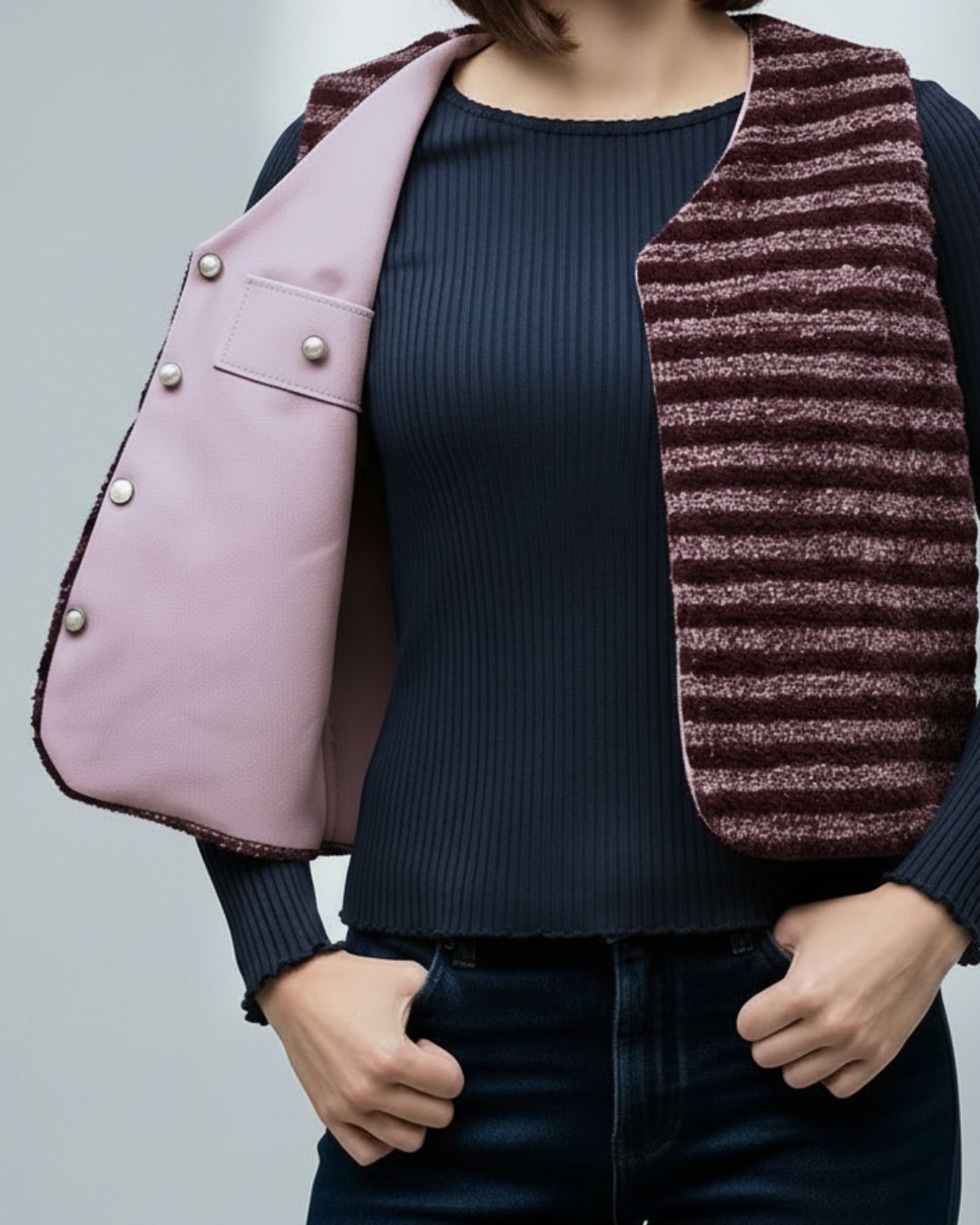 This double-face pink vest is designed for women who love practical winter layering with a stylish twist. One face features soft pink wool with functional buttons and pockets, while the reverse side comes in a textured burgundy–pink tweed for a warmer, richer look. With a 40 cm length, it adds a modern and polished touch to sweaters, tops, and winter basics. A versatile piece that elevates modest winter outfits instantly.