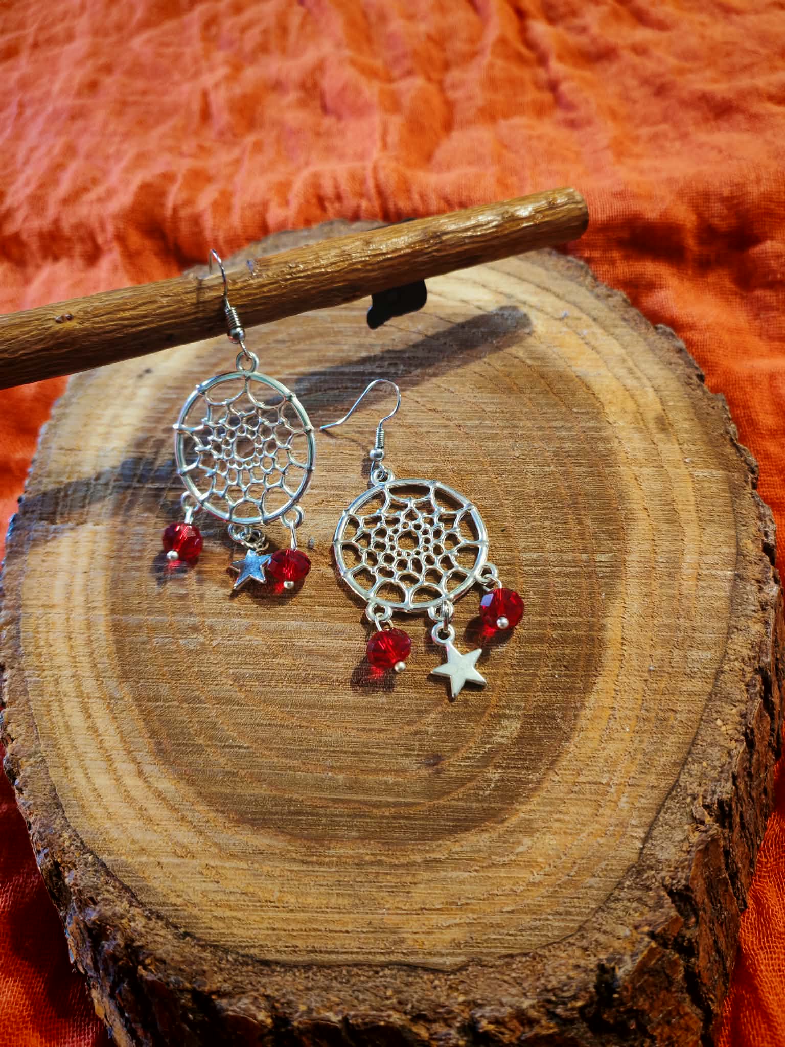 الوصف: زوج من الأقراط المتدلية ذات اللون الفضي، تتميز بتصميم دائري مجوف يشبه شبكة صائد الأحلام. تزينها خرزات حمراء