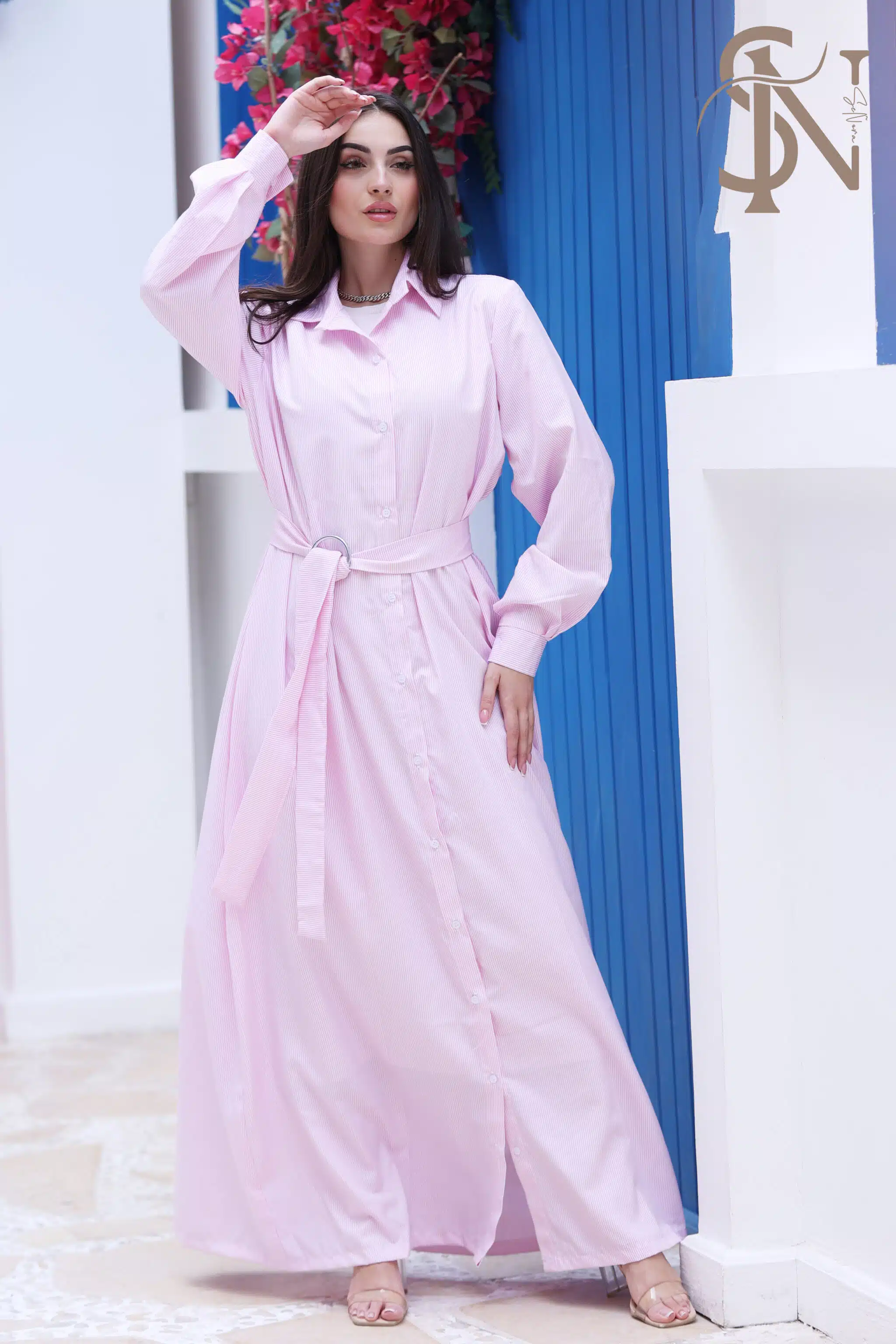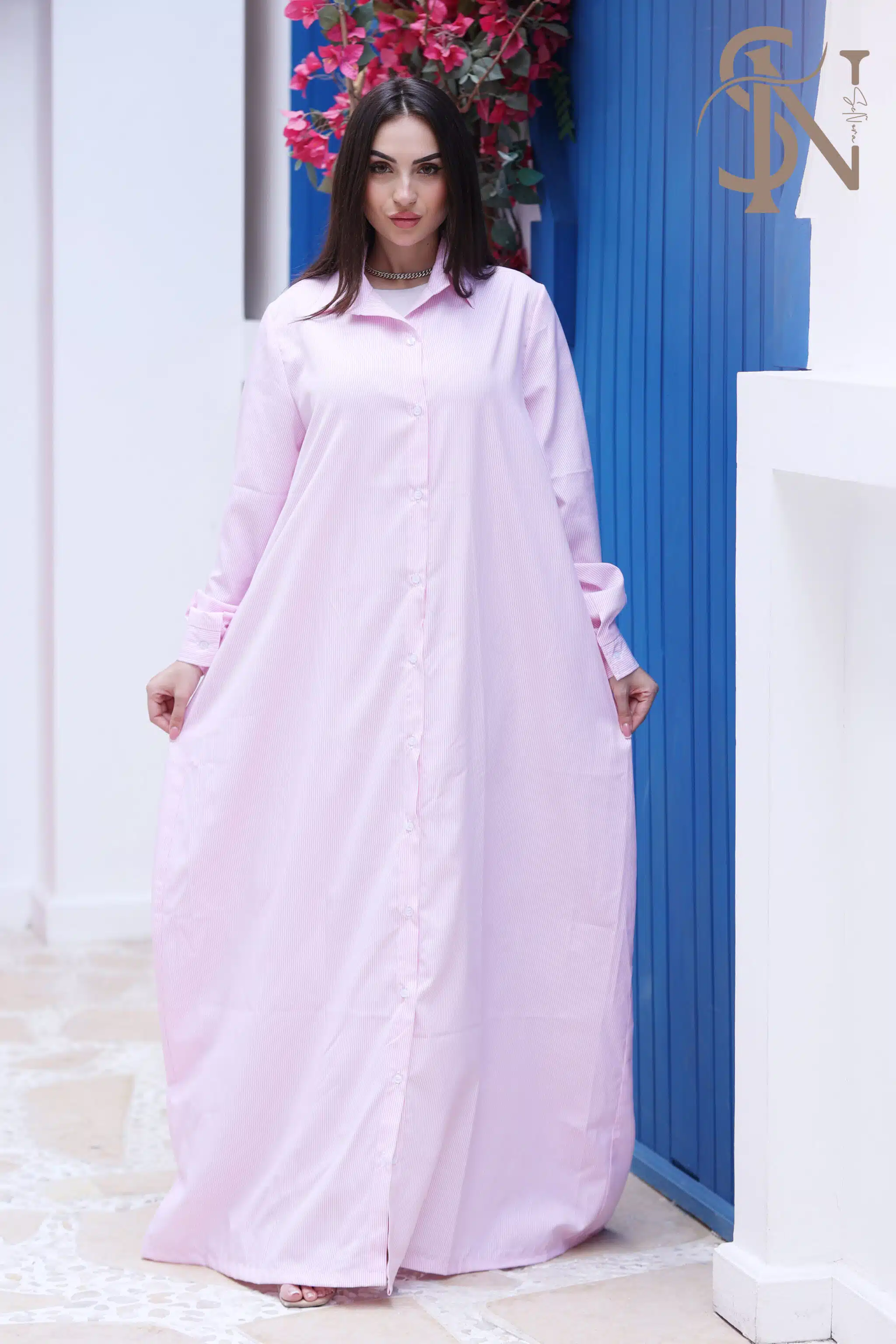 stripped long dress with long sleeves and front buttons.