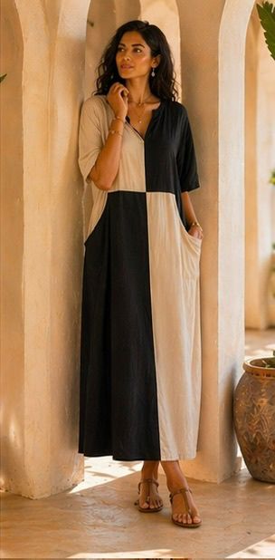 Design: Relaxed maxi dress with bold dual-tone color blocking and side pockets