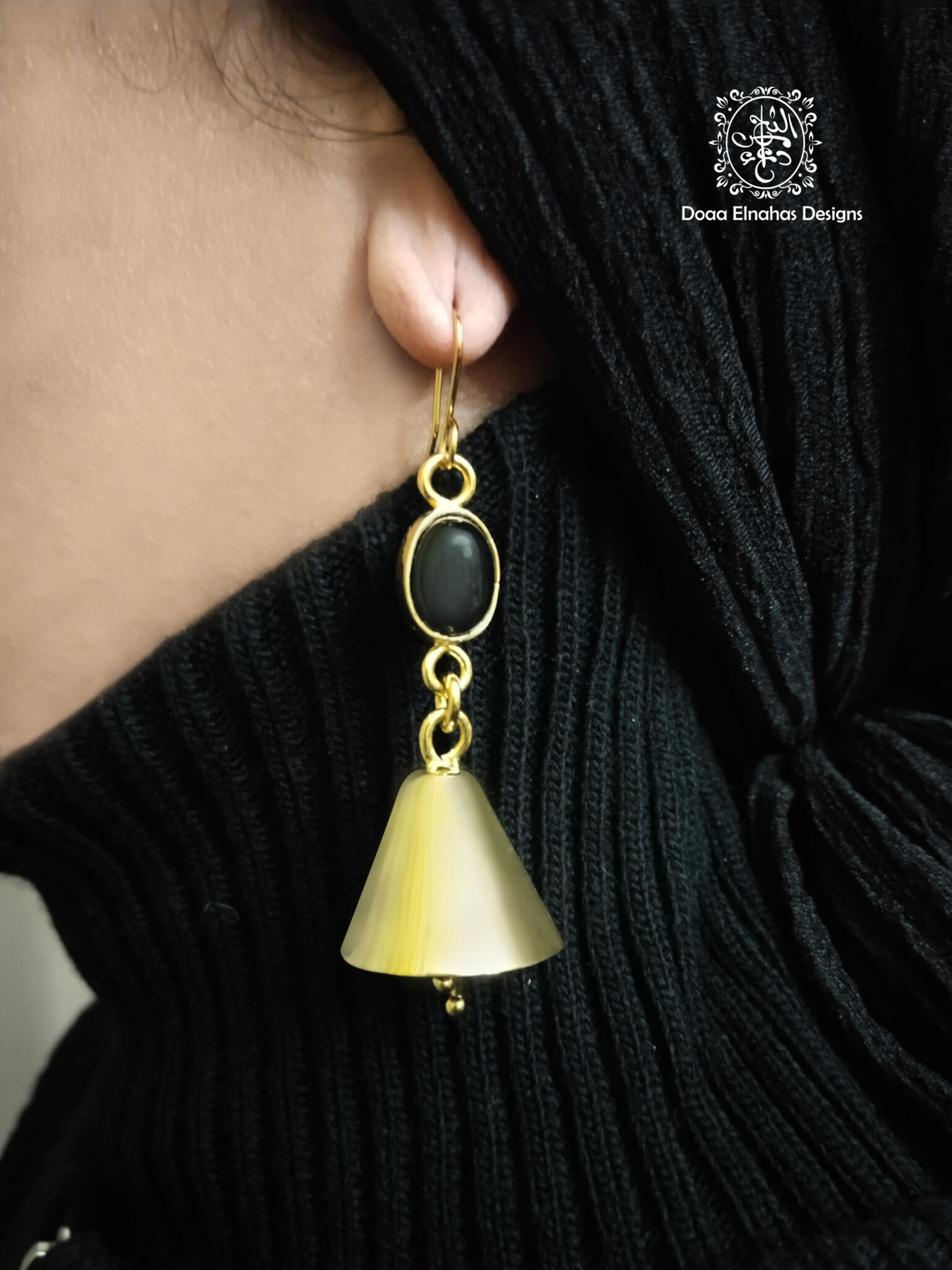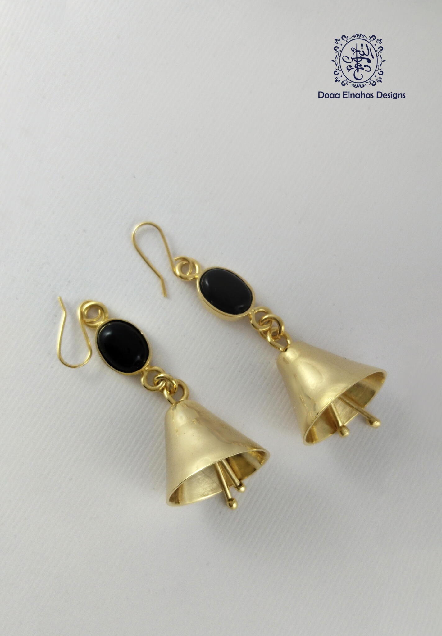 Gold-plated brass earrings, bell shape with Onyx stones