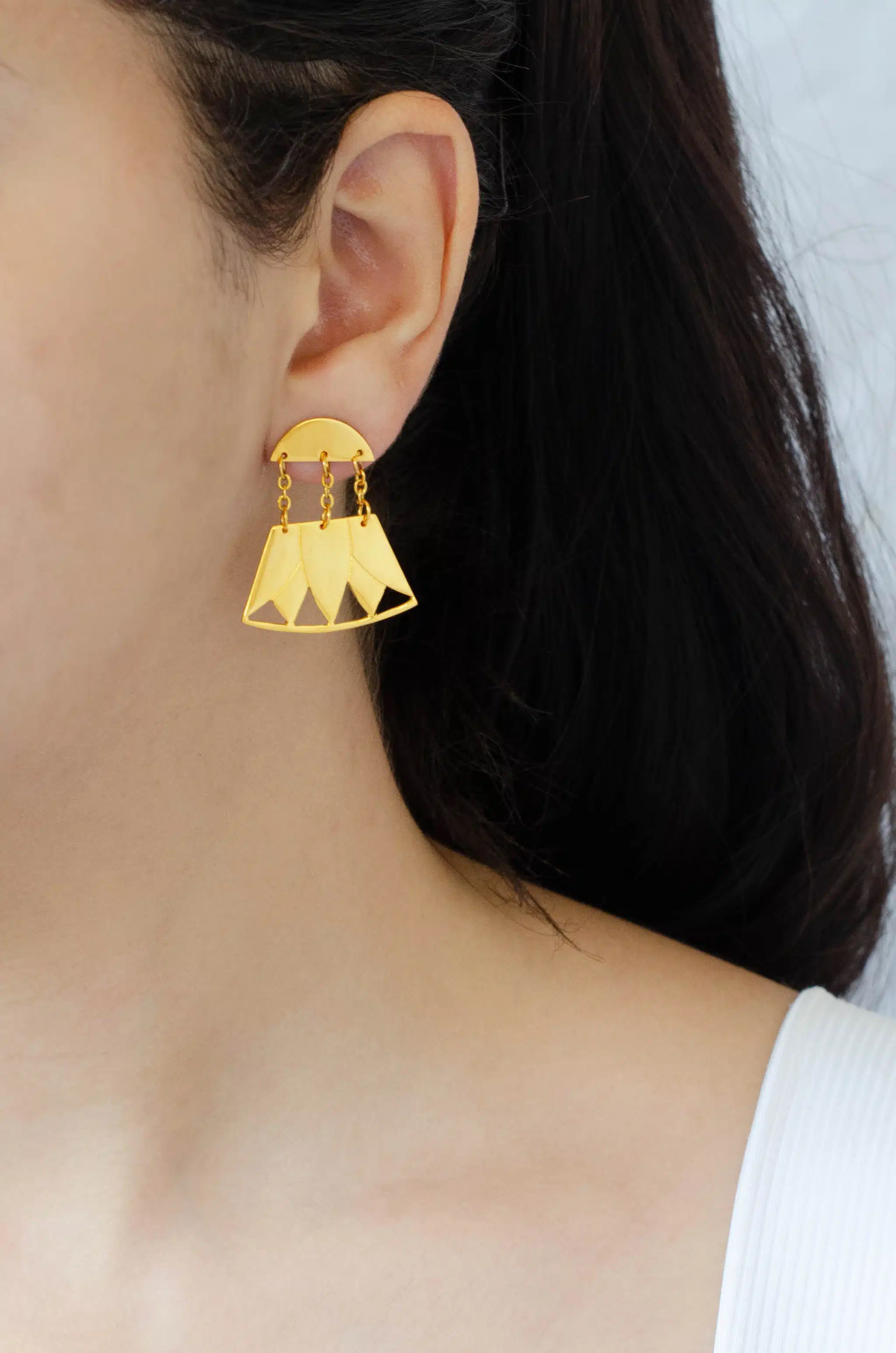 The Grace earrings, Inspired by The Lotus Flower ancient Egyptian Symbol by the designer “Toka Nabil”. Material: Brass 21K Gold plated with a very high quality. hand made. Pre order will Take from 3-8 Days. No REFUND or EXCHANGE.