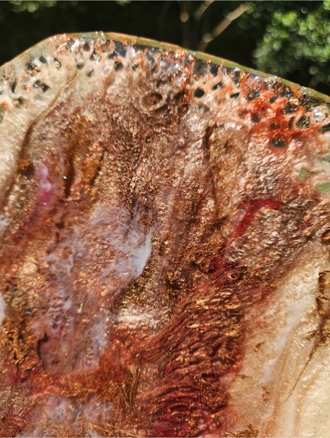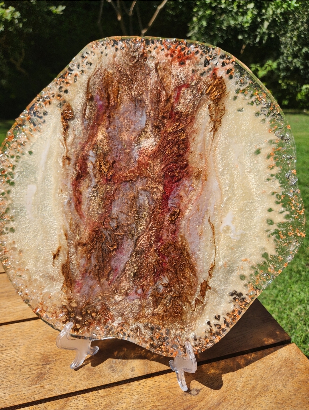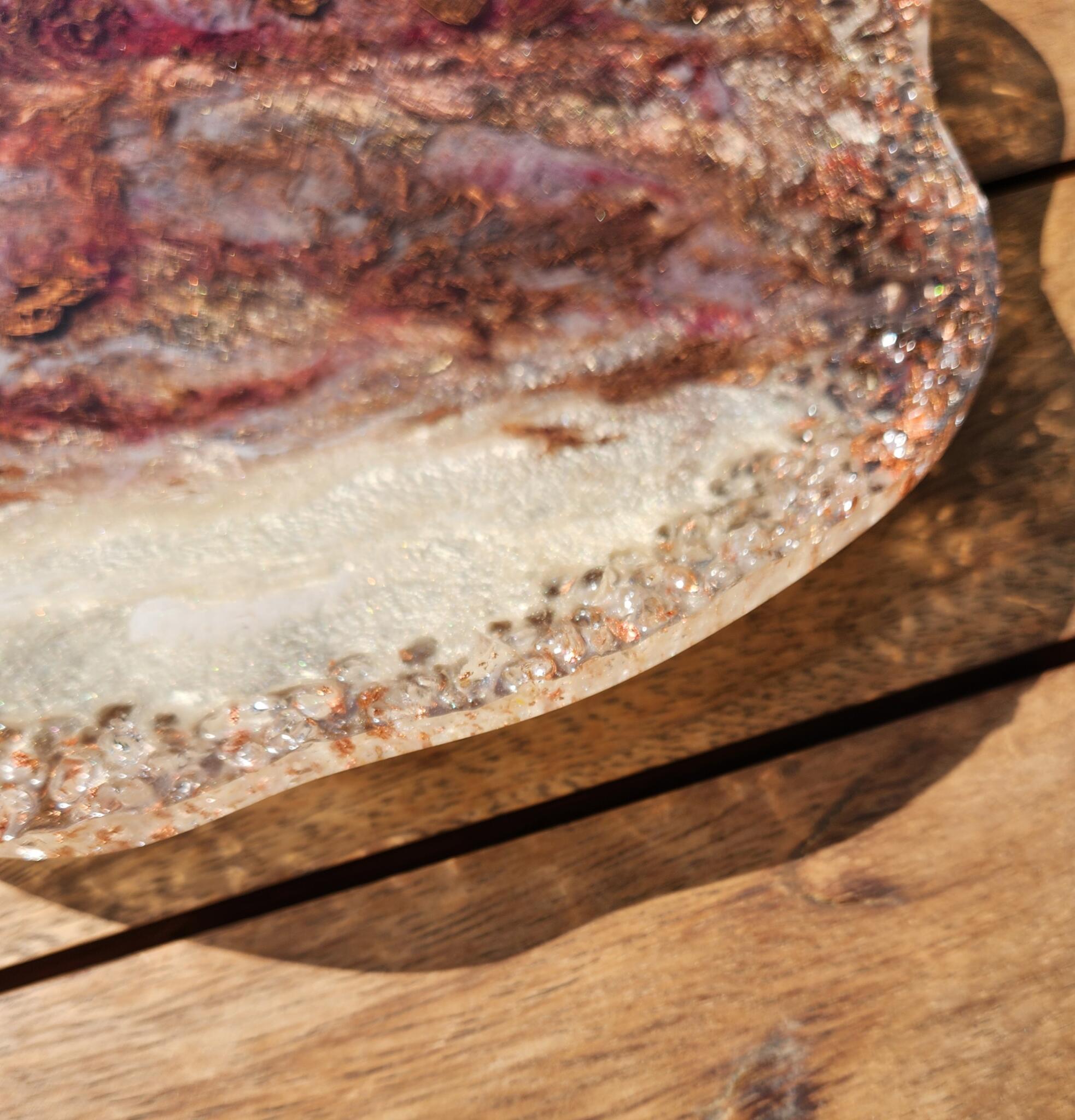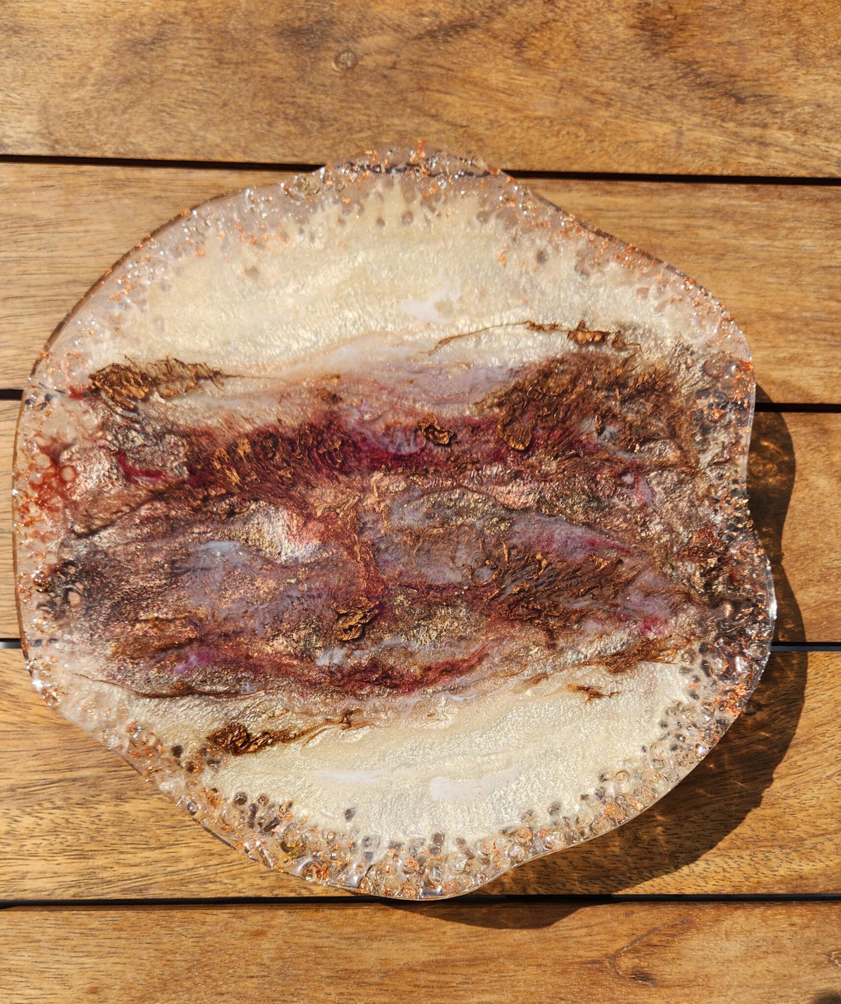 Elevate your decor with this handcrafted resin statement platter—an organic piece that bridges the beauty of nature with bold artistic expression. Inspired by the textures of raw gemstones and desert sands, this one-of-a-kind piece blends earthy tones of copper, burgundy, and creamy beige, with shimmering veins of gold.
