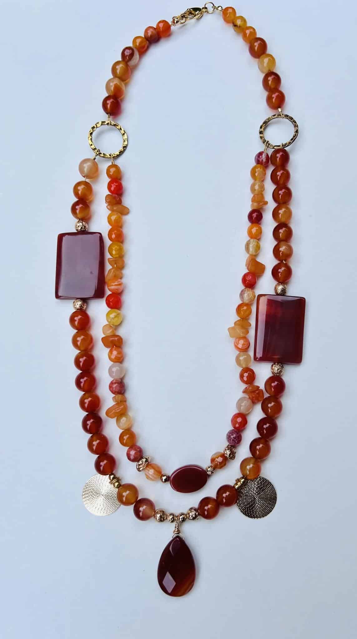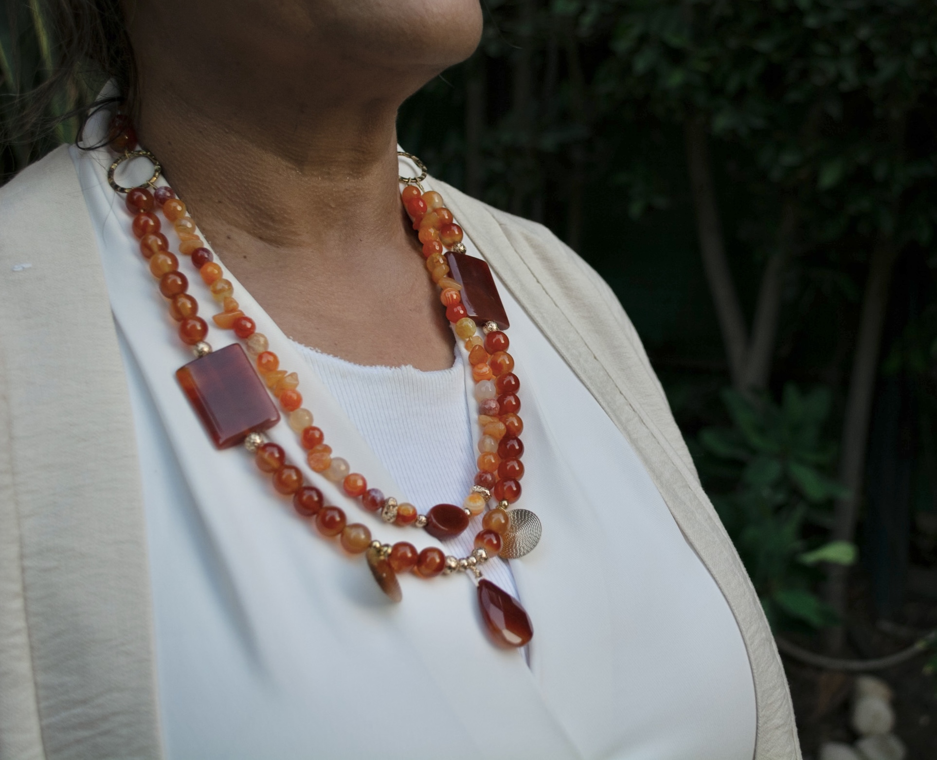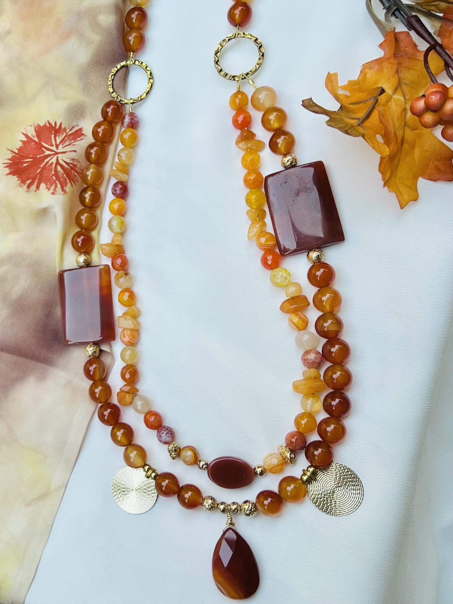 Bold, earthy & elegant with deep orange agate , lava gold & gold tones, great for Autumn as statement piece.