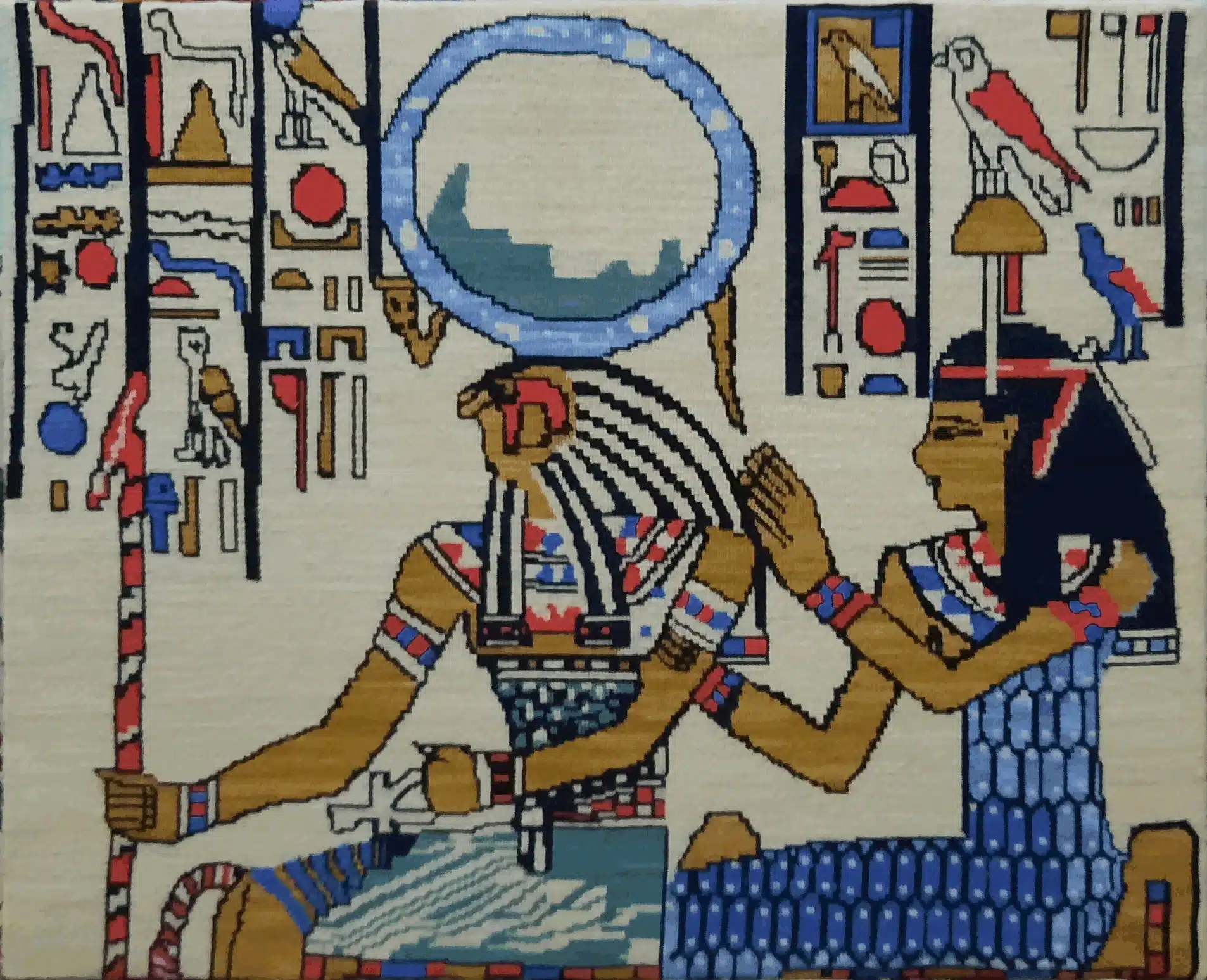 This exquisite handmade tapestry vividly depicts an iconic scene of Egyptian deities, intricately designed with hieroglyphics in the background. The use of bold colors and precise weaving techniques brings out the divine symbolism and historic charm, making it a perfect choice for those passionate about ancient Egyptian culture.