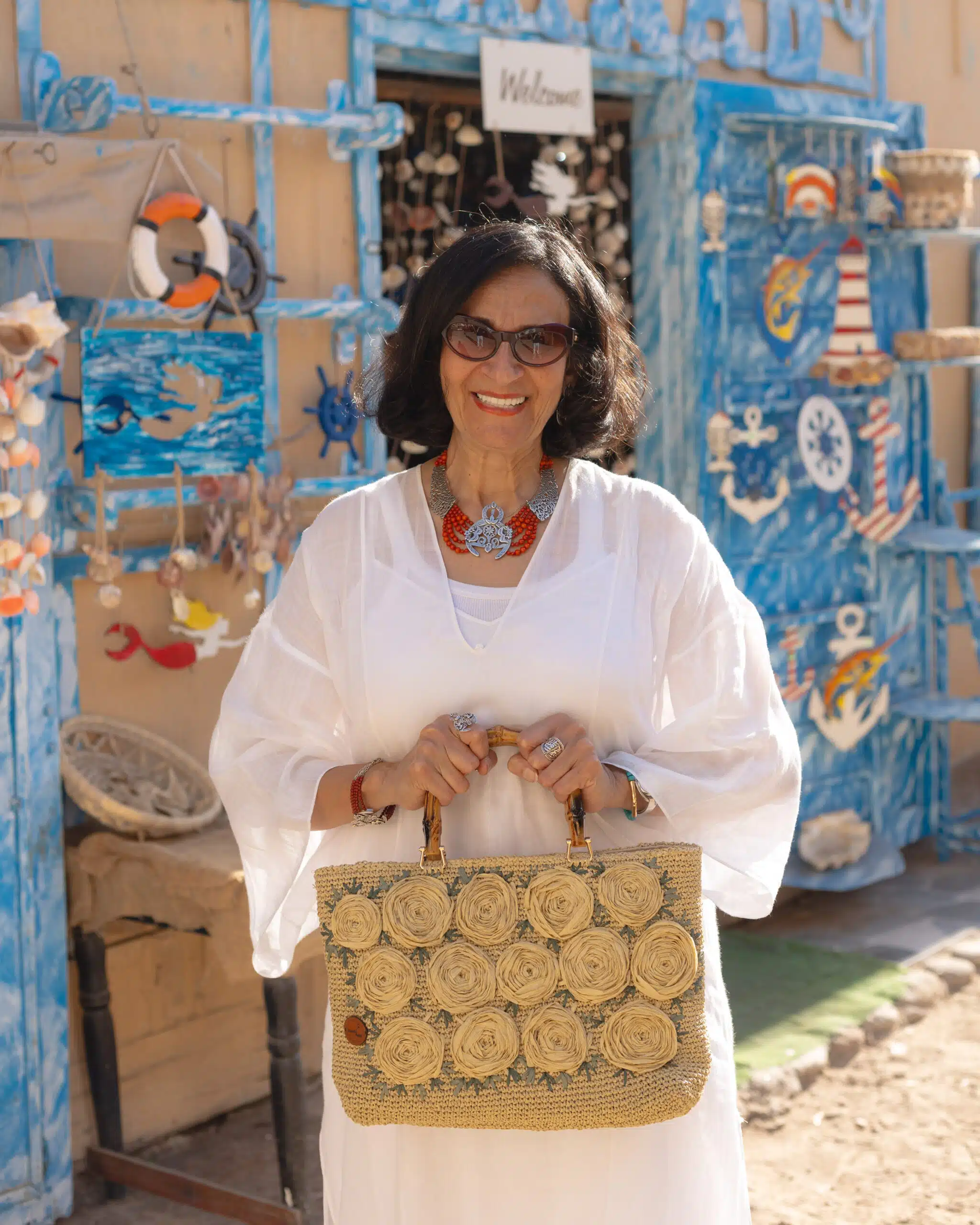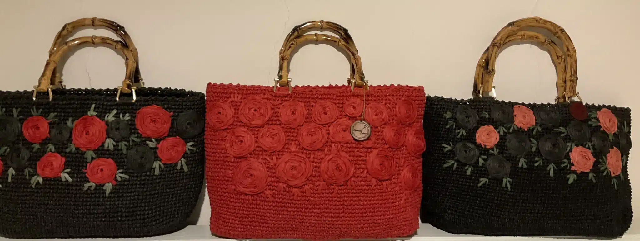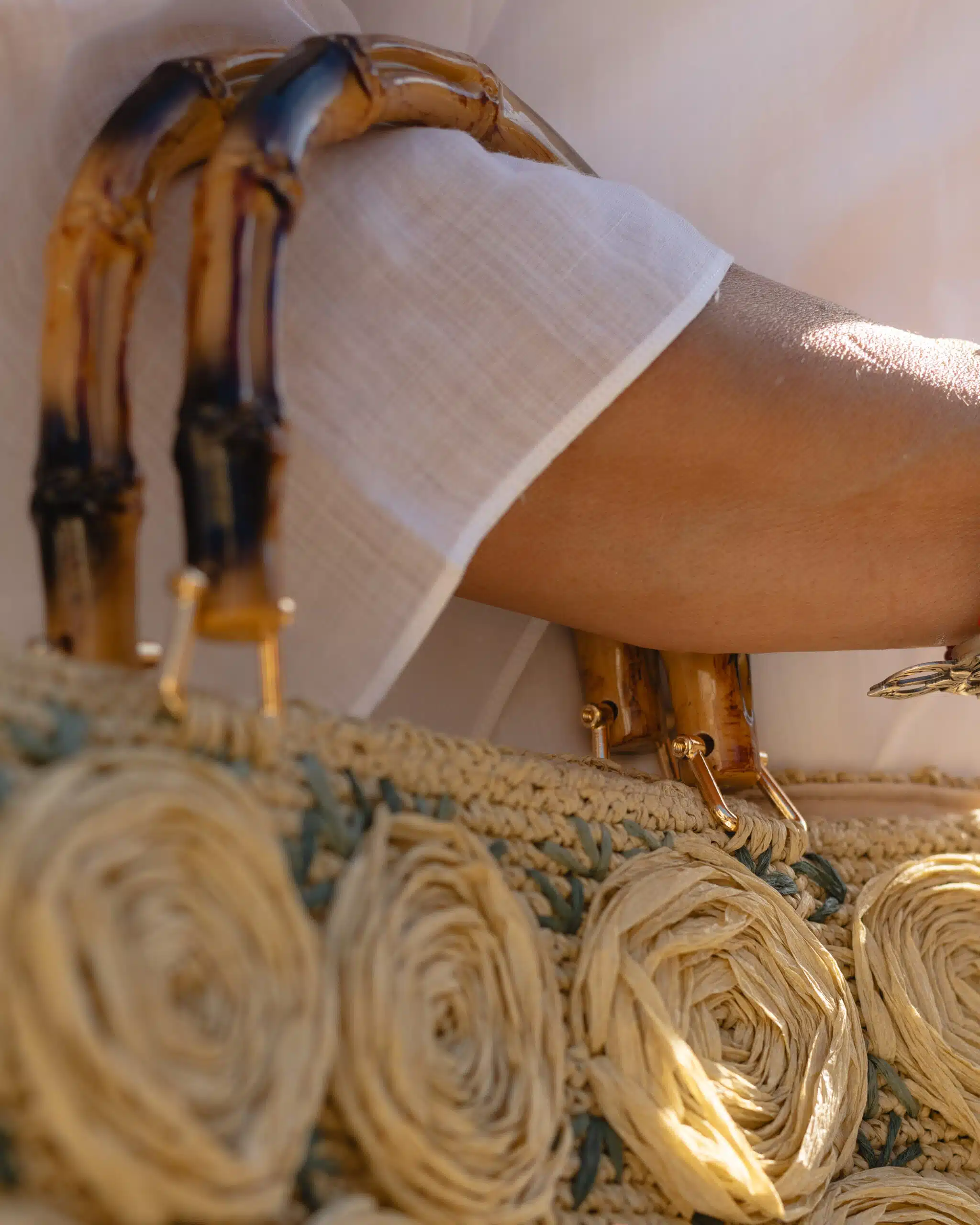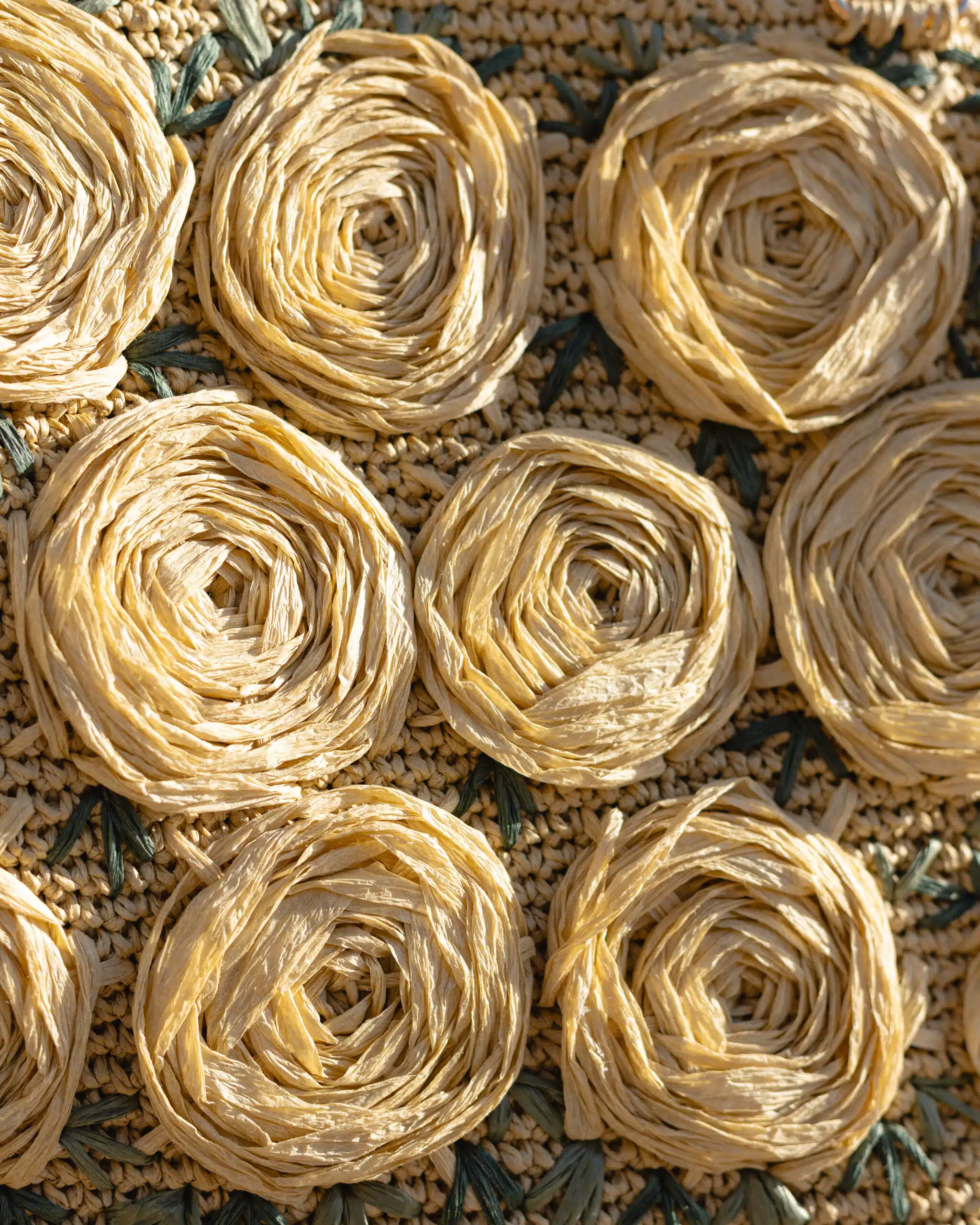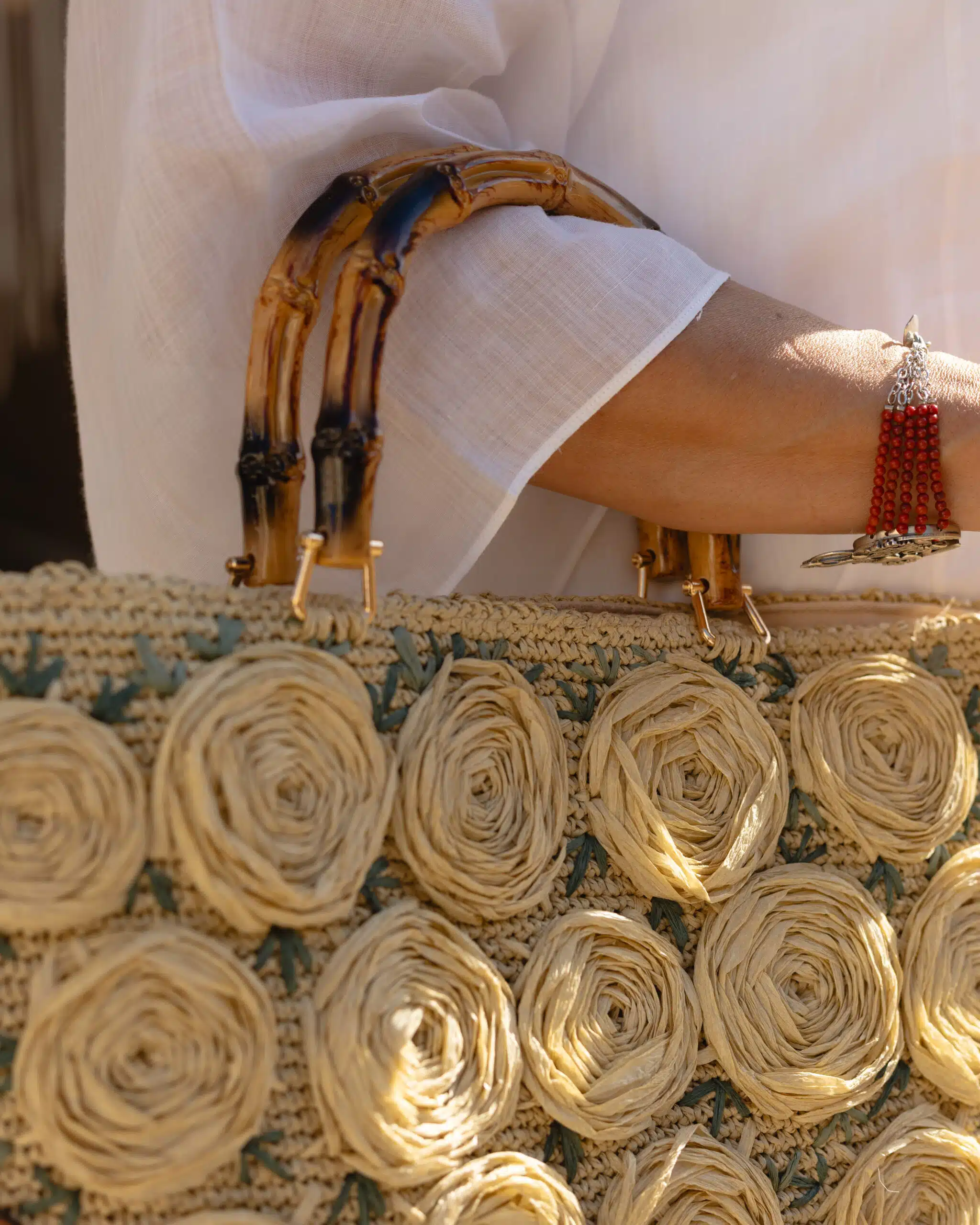 - Step into elegance with our handcrafted black raffia bag, delicately embroidered with black roses.