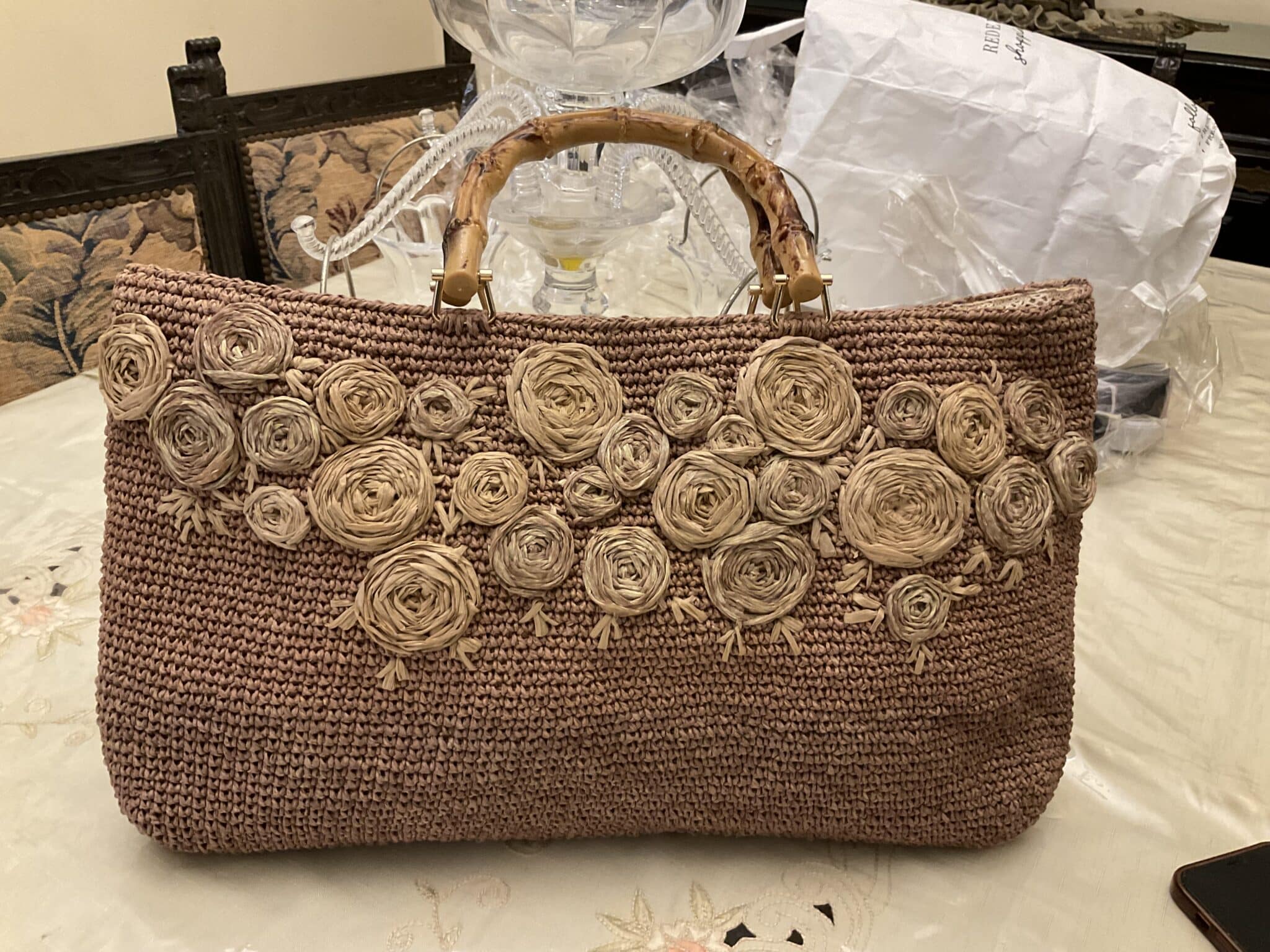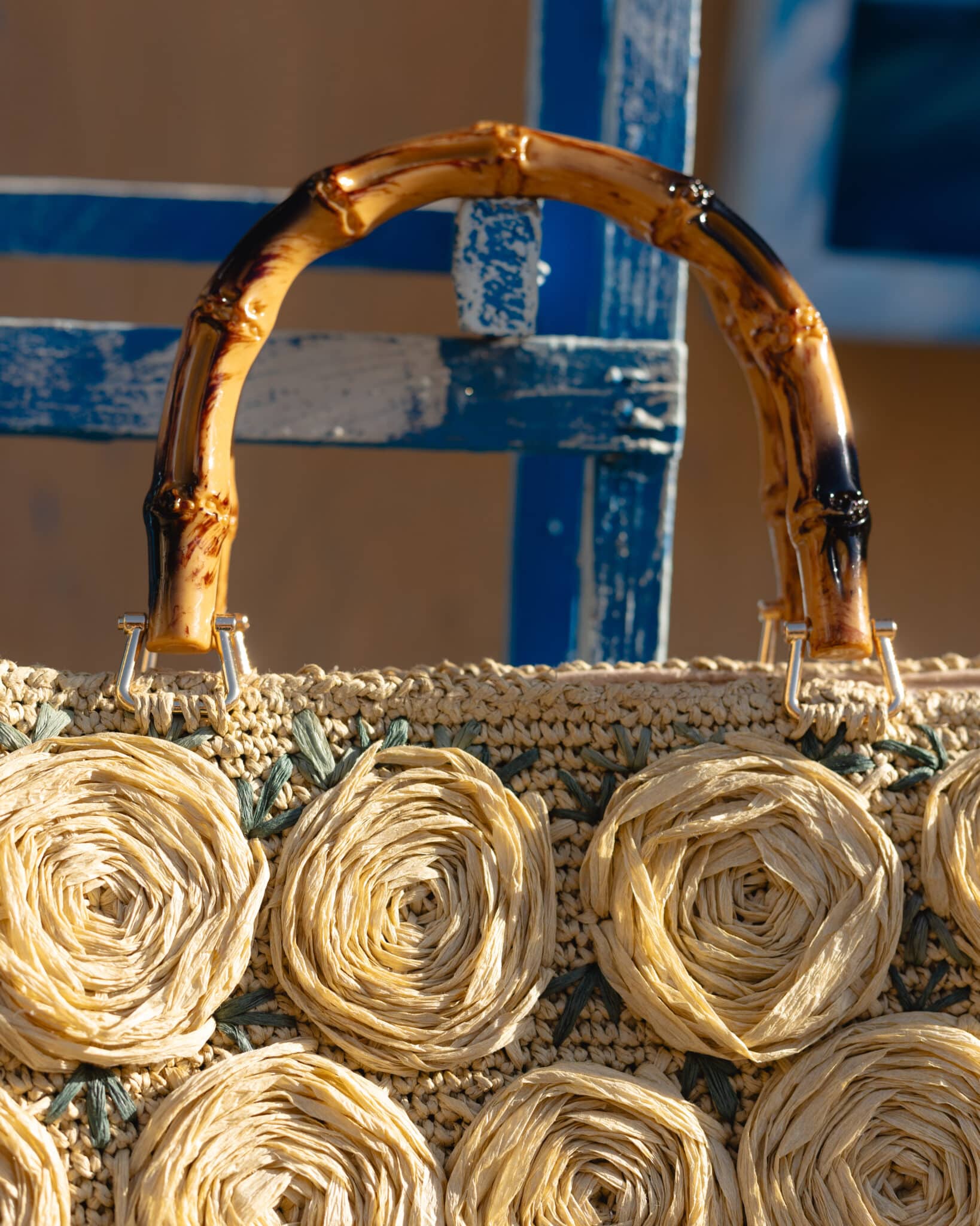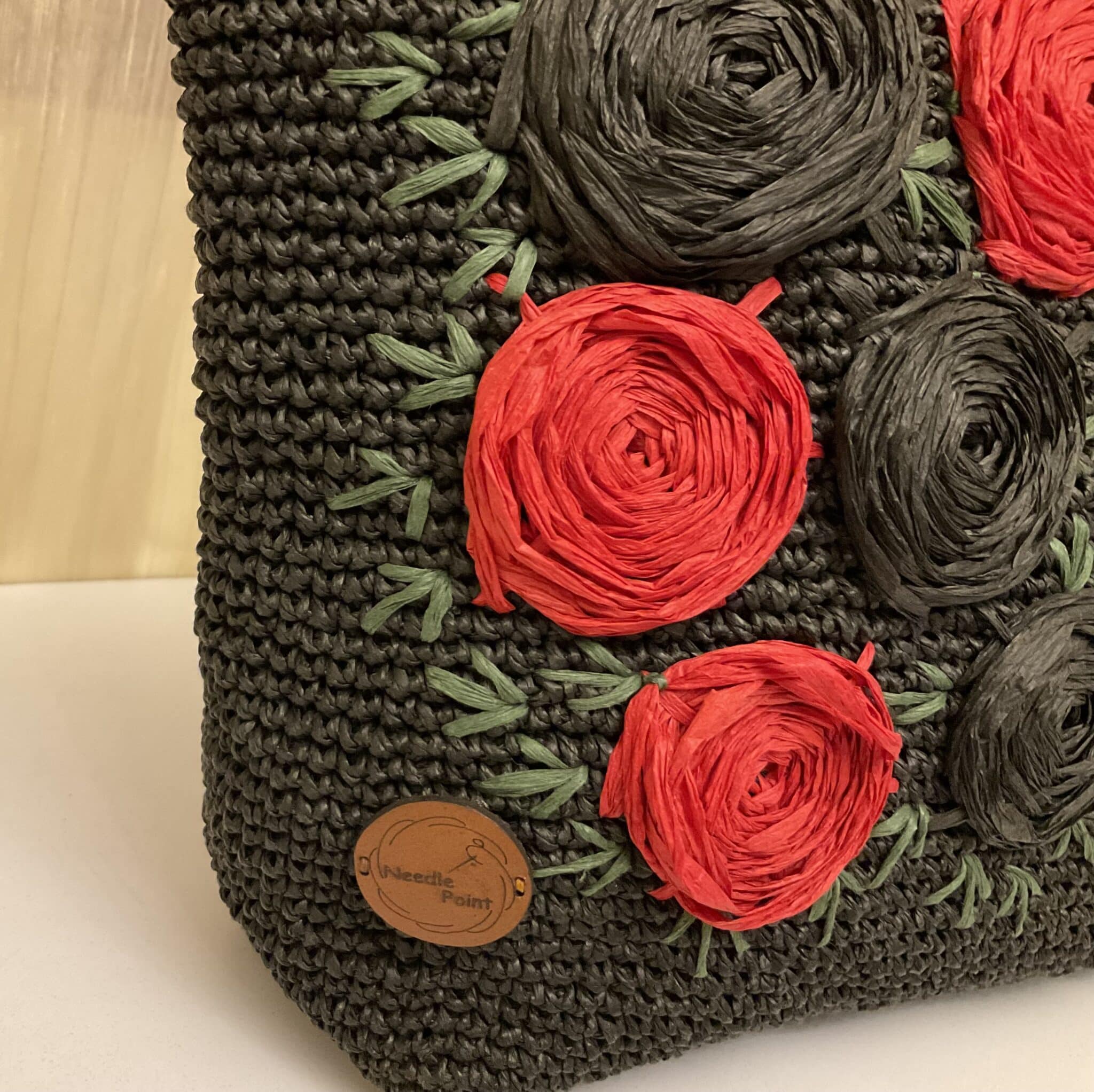 - Step into elegance with our handcrafted black raffia bag, delicately embroidered with black roses.