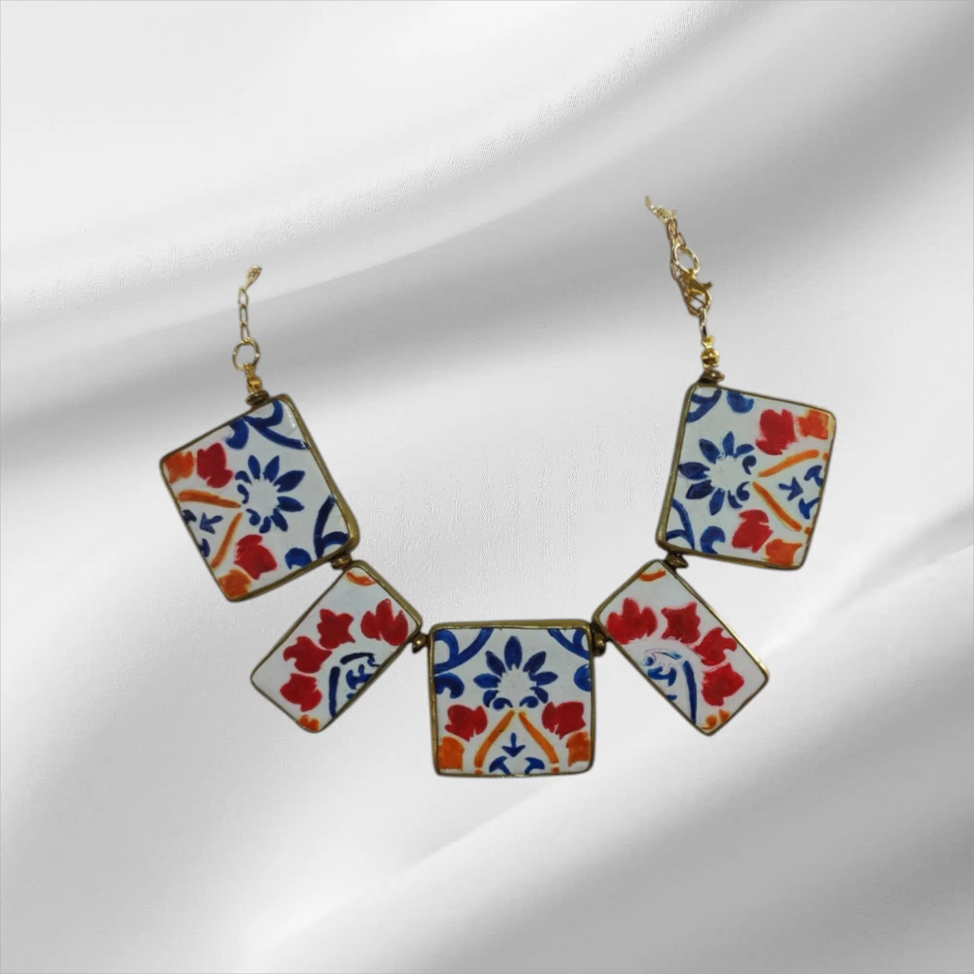 This handmade necklace features polymer clay pieces adorned with intricate floral patterns in vibrant red and blue hues. Inspired by traditional ceramic designs, the pieces are elegantly connected to create a unique artistic touch. Lightweight and comfortable, this statement piece is perfect for adding a pop of color and elegance to any outfit.