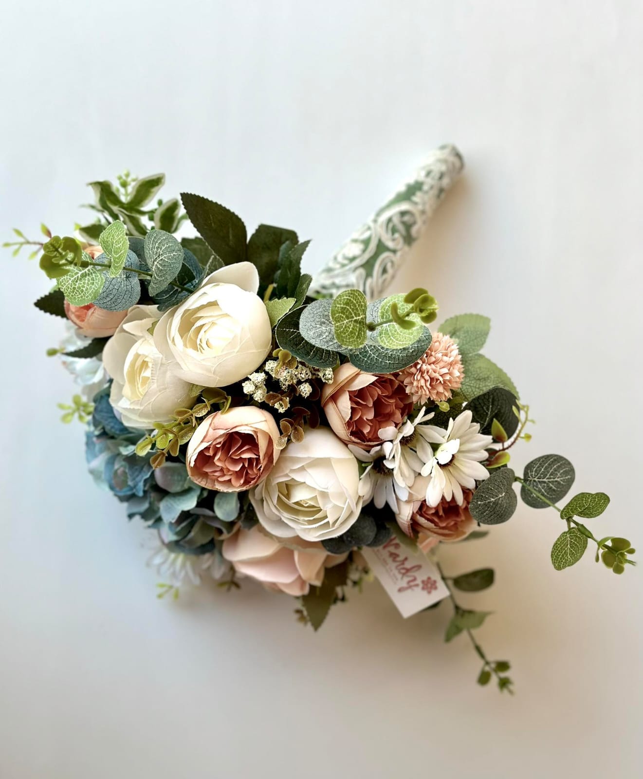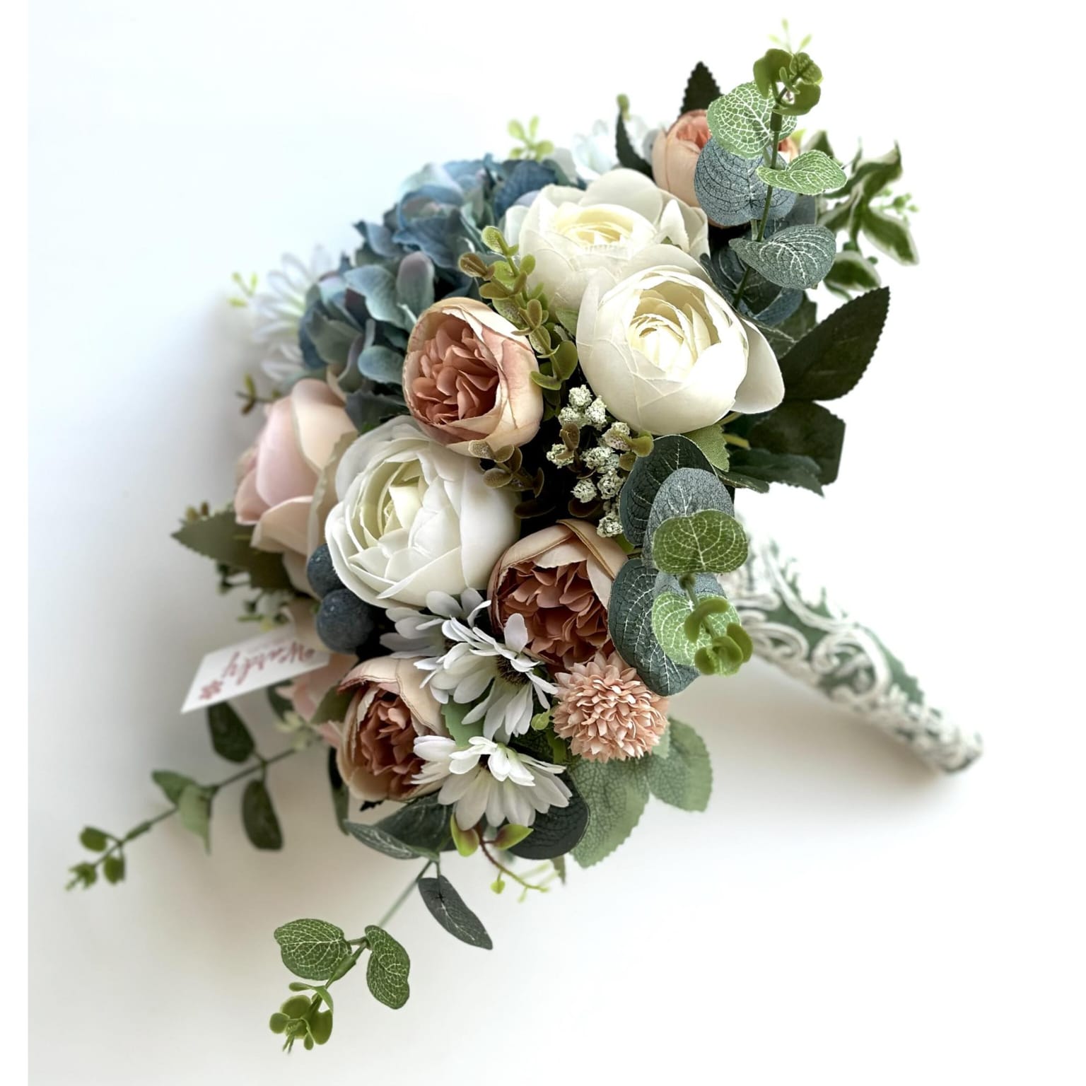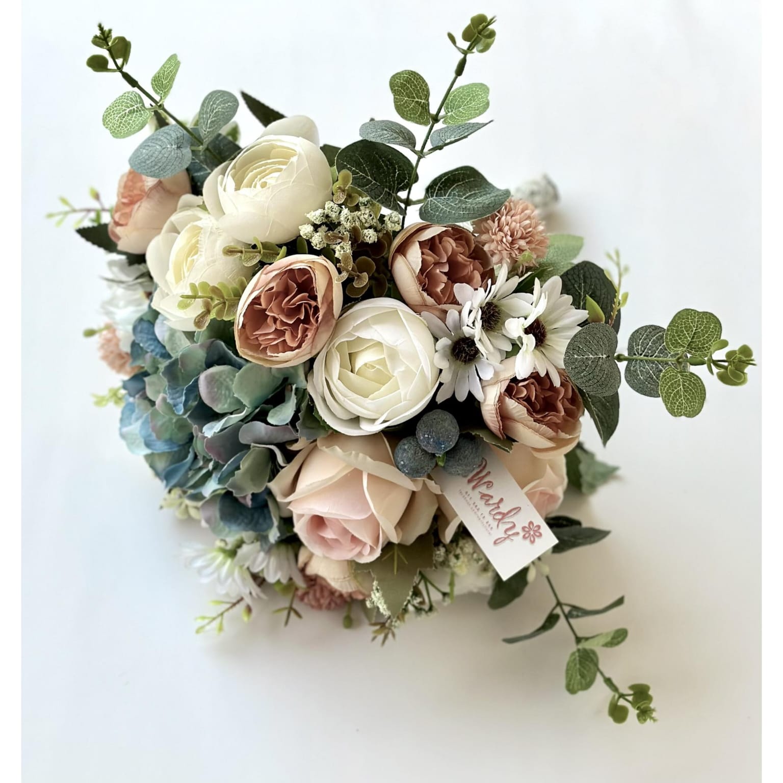 Dusty blue and golden rose mix in a round shape floral design.