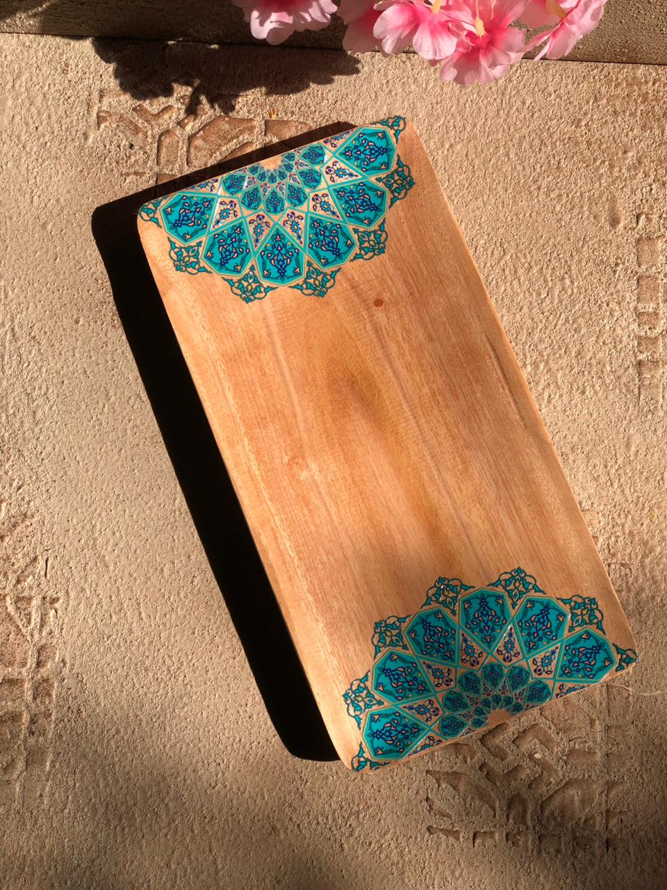 This piece is a 100% natural wooden serving tray, crafted with a smooth finish that highlights the unique grain and warm tones of the wood.