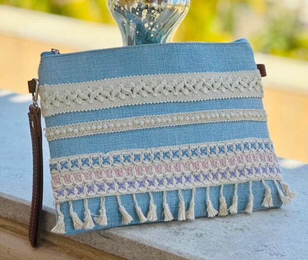 A charming clutch crafted in soft sky-blue fabric, with intricate woven trims, pastel embroidery, and delicate tassel details. Finished with a practical wrist strap, it’s the perfect accessory to elevate your casual and beachside looks.