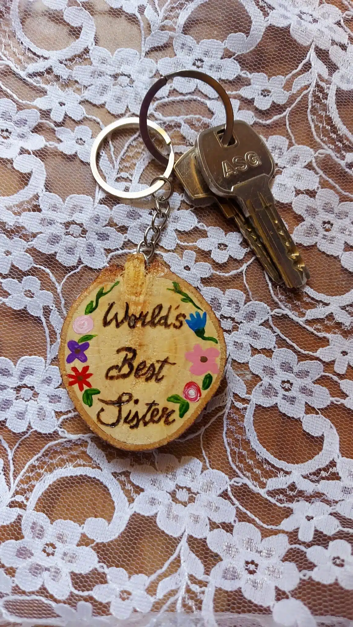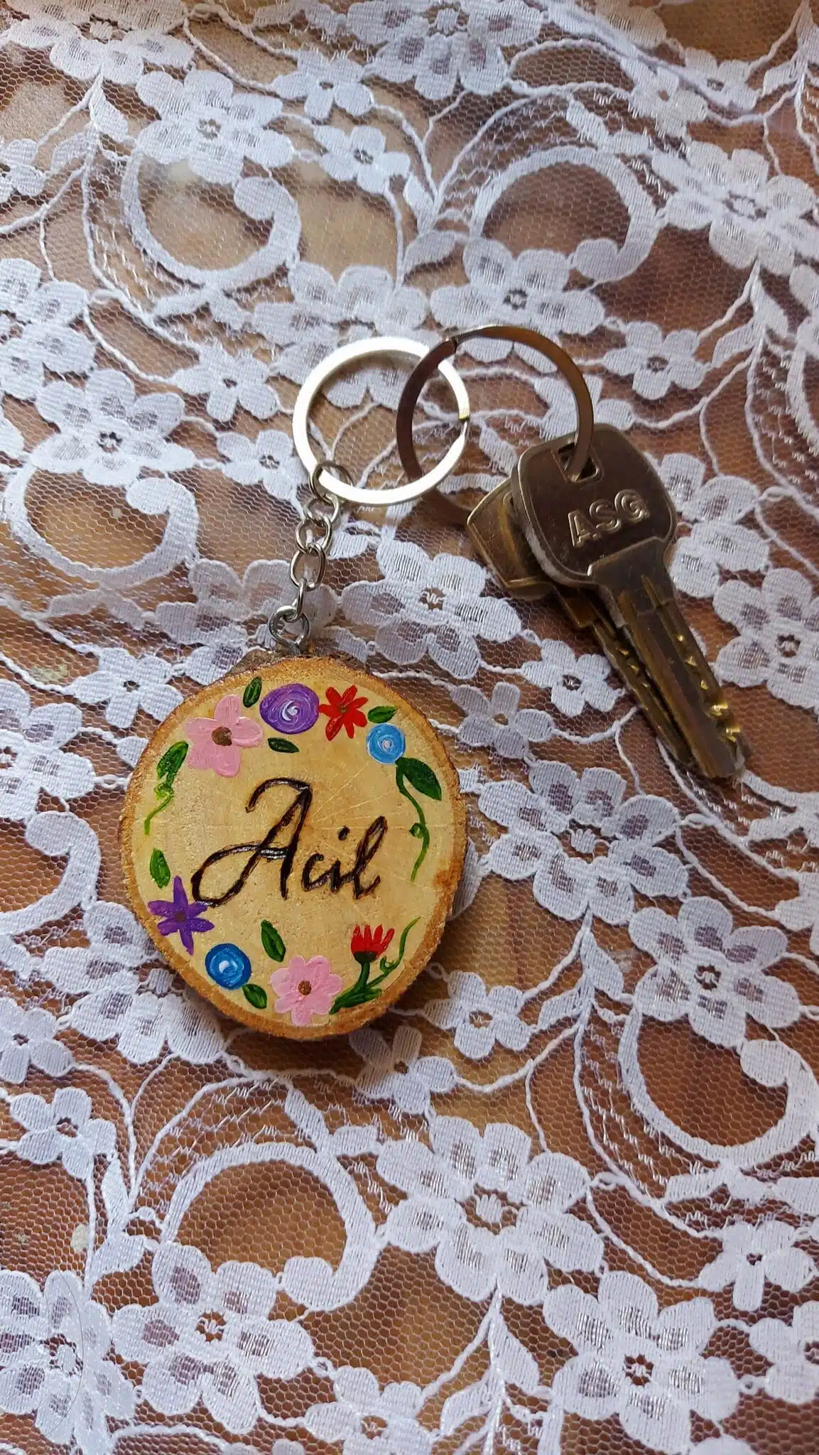 Materials: Wood Slice, Acrylic painting, stainless keyring, and *Coated with Varnish to protect the colors from scratches or water.*