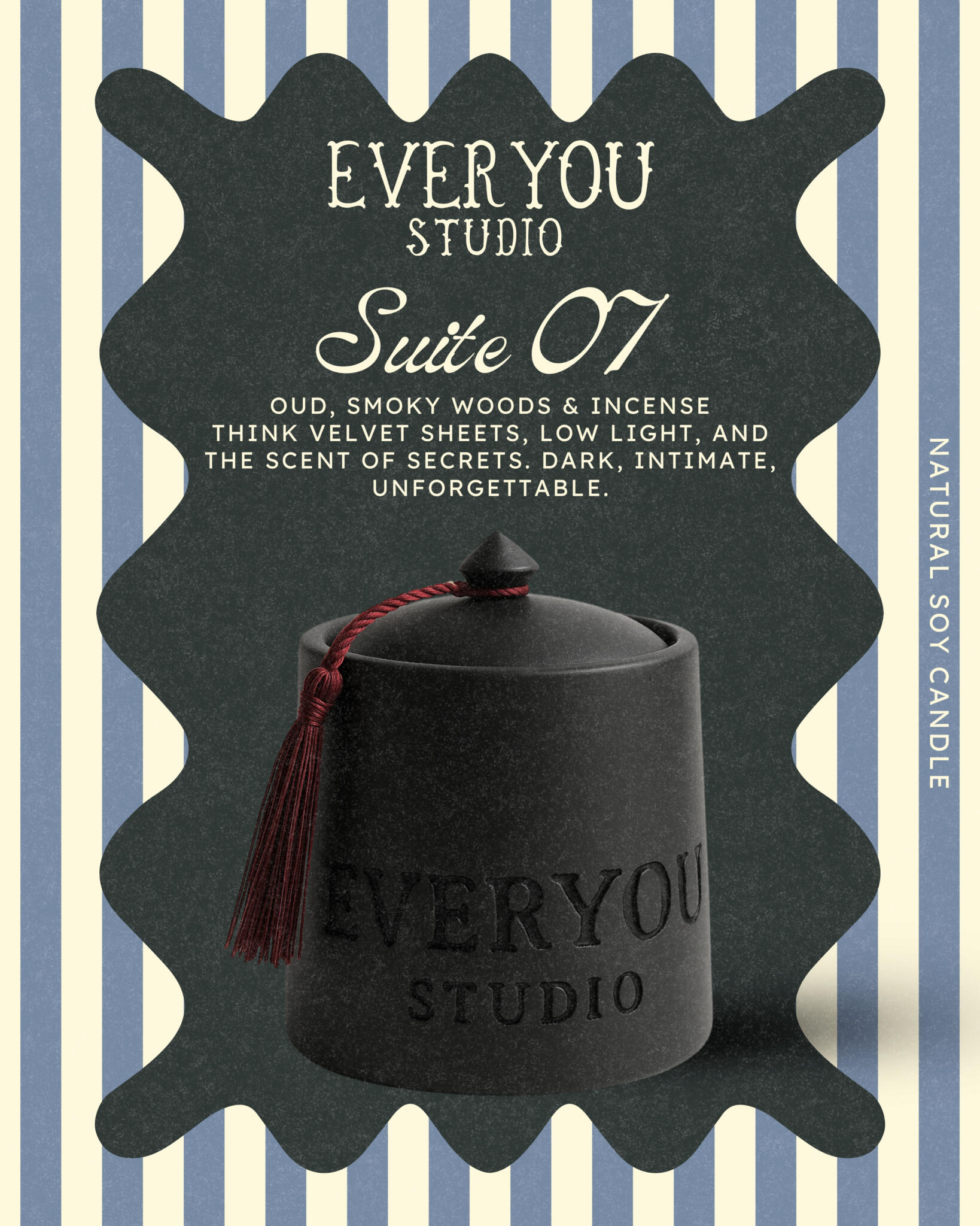 The scent opens with warm tobacco that immediately creates depth and elegance. As the candle burns, smooth vanilla begins to emerge, adding warmth and softness to the fragrance. The scent settles into a deep base of black oud, filling the room with a bold and refined aroma.