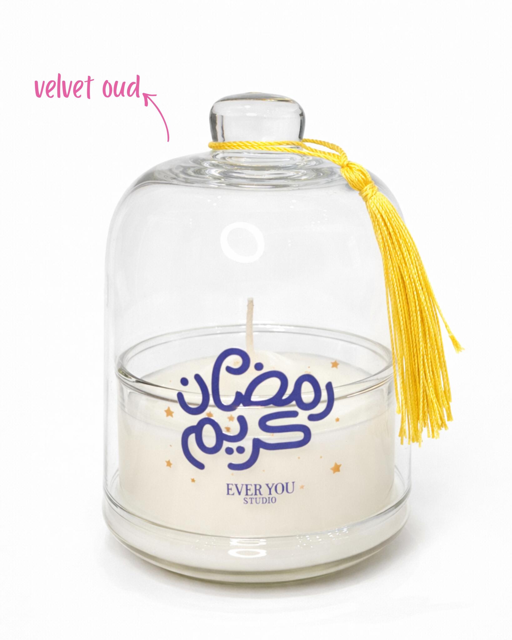 Hand-poured with soy wax and presented inside a clear glass dome, this candle becomes both a beautiful decorative piece and a meaningful seasonal accent. The design features the words “Ramadan Kareem” and is finished with a decorative tassel, making it perfect for Ramadan tables, hosting, or thoughtful gifting.