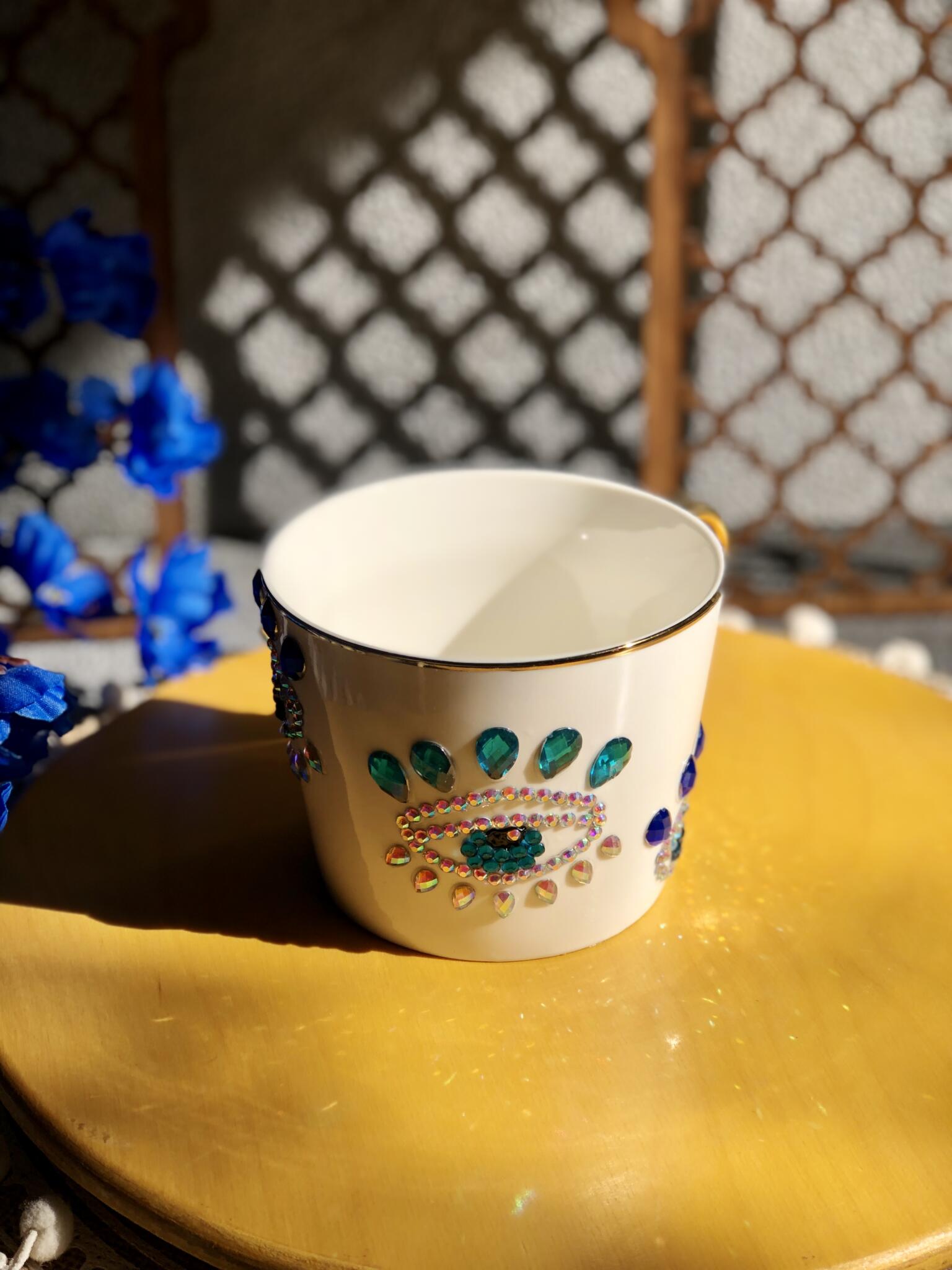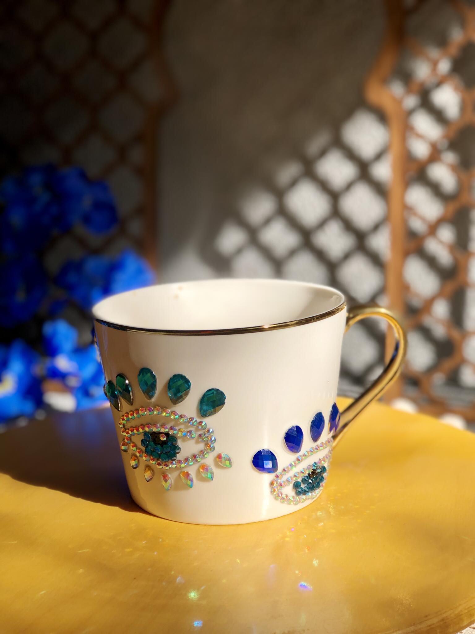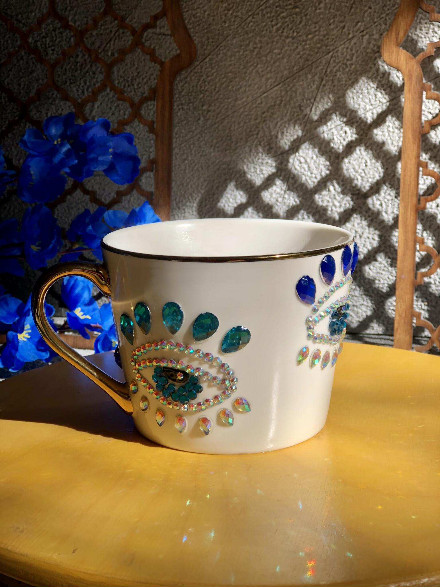 An elegant handmade mug decorated with sparkling crystal details and rich turquoise accents.