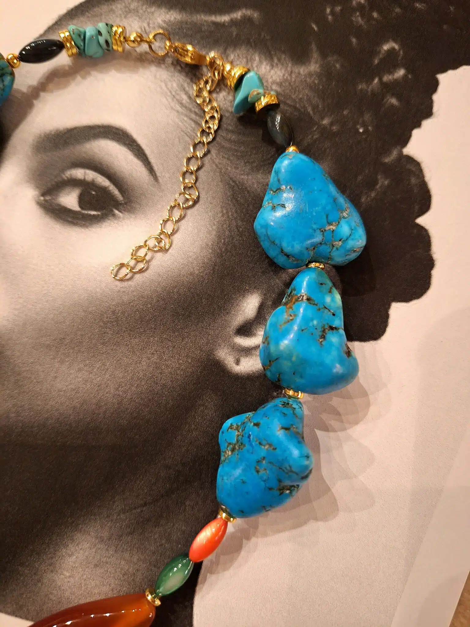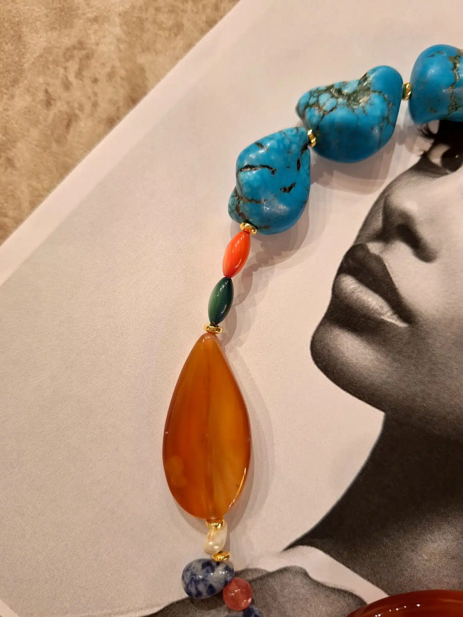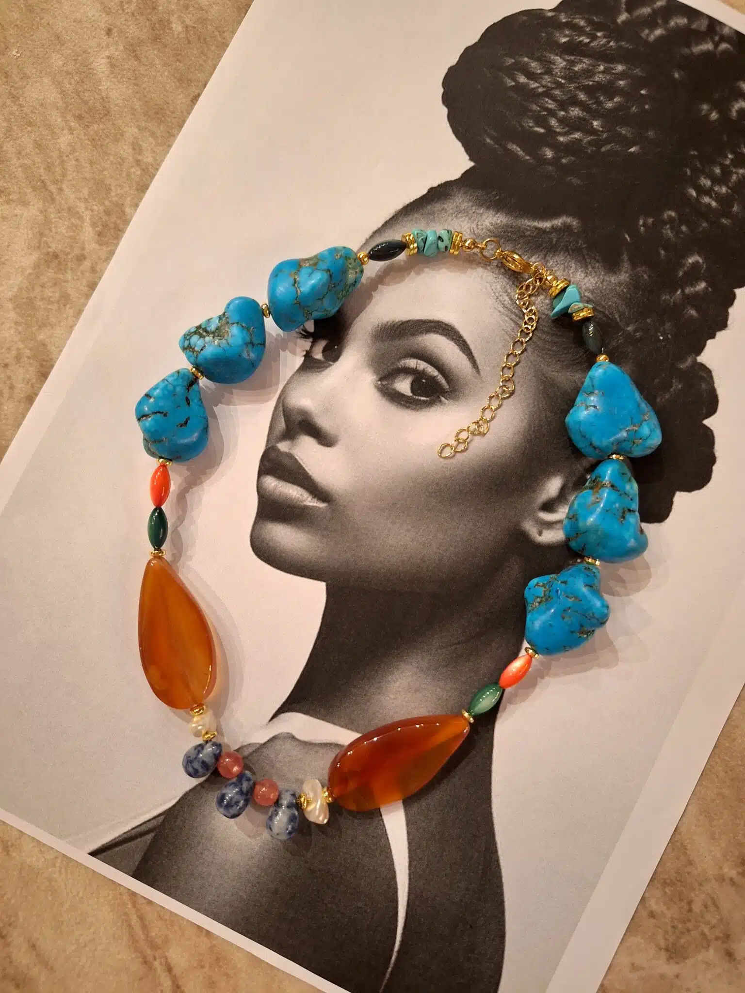 - كوليه مميز و فريد من نوعه من الأحجار الطبيعية (أحجار العقيق – و الفيروز الطبيعي – و أحجار سودالايت- مع الصدف)