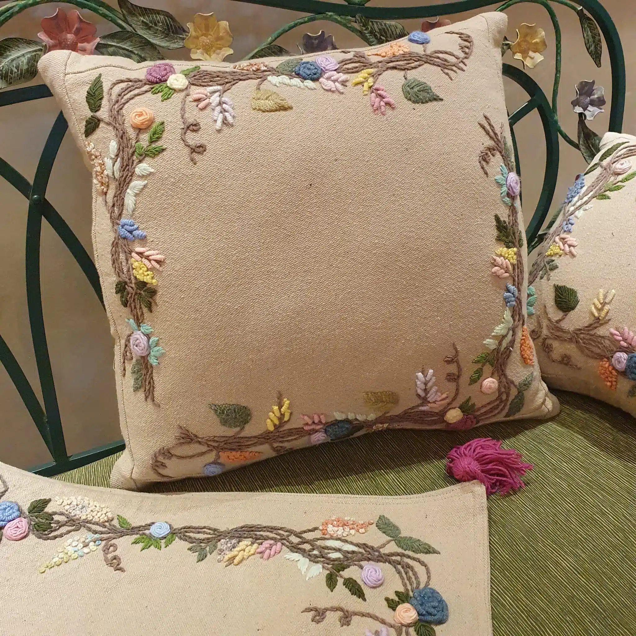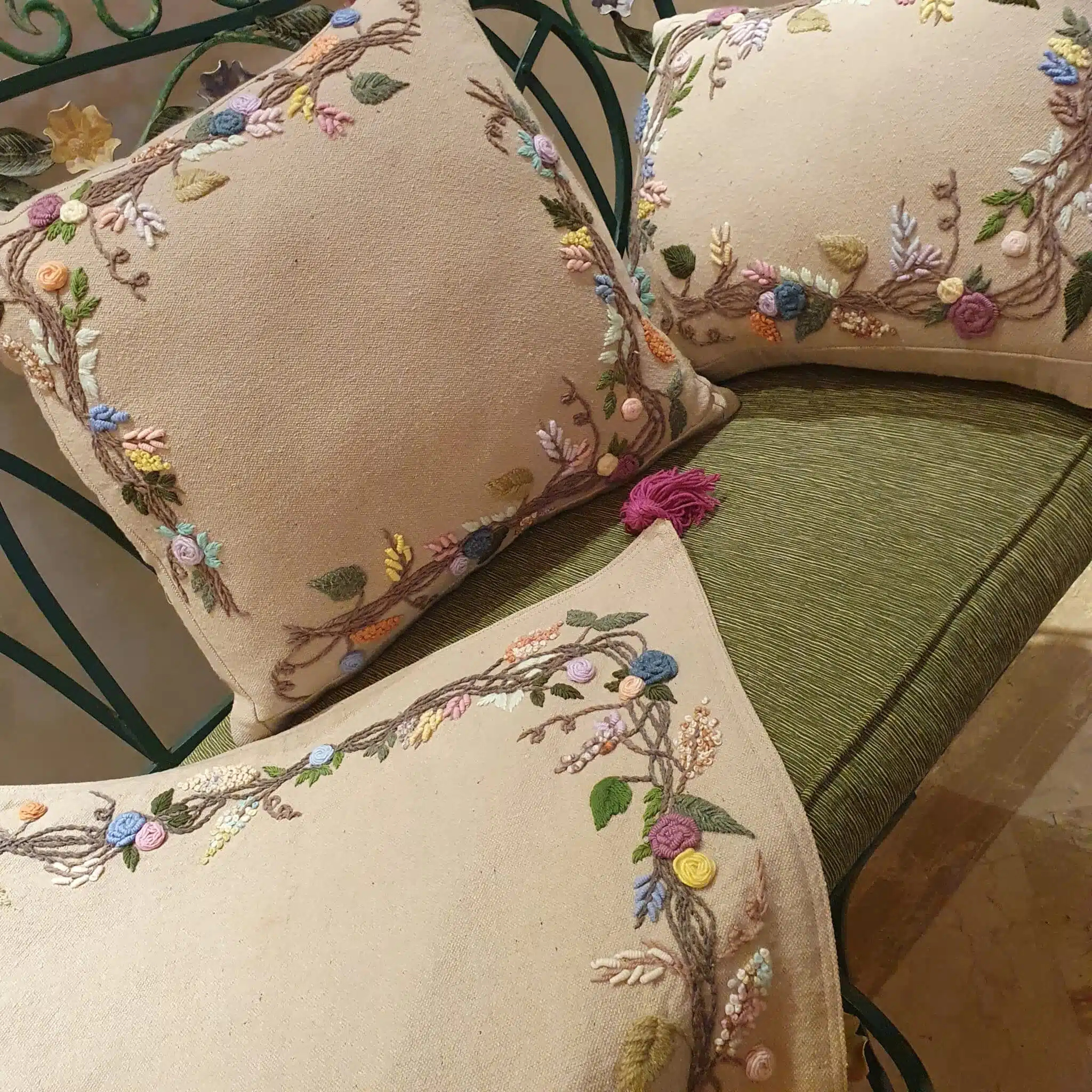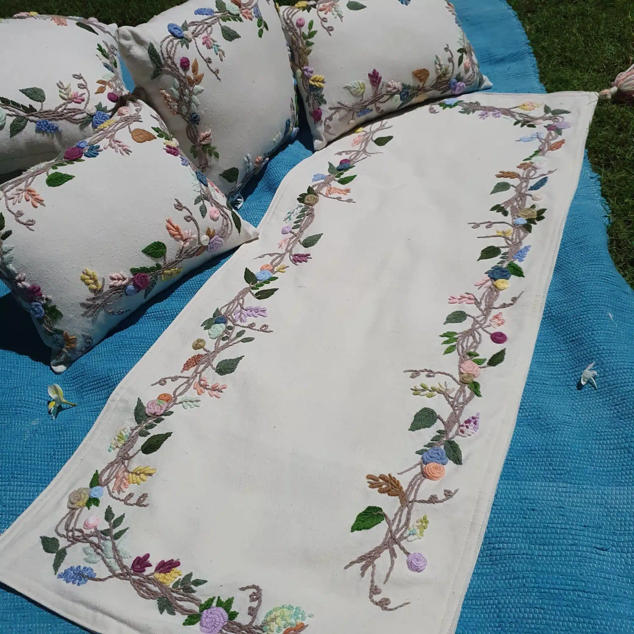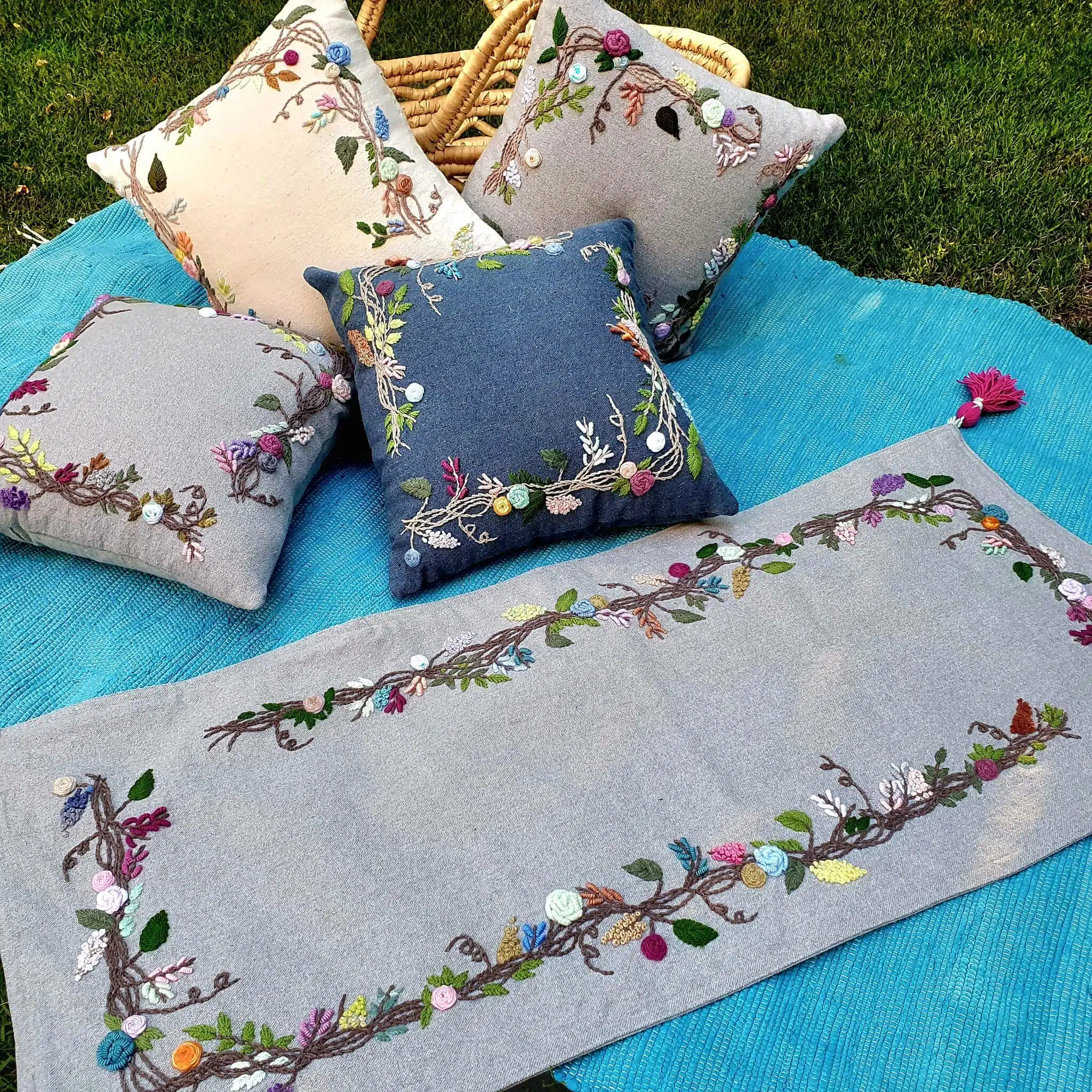 Handmade embroidery unique fairy design cushions and runner ,chose your preferred color: Off-white, Beij ,Grey or Jens fabric