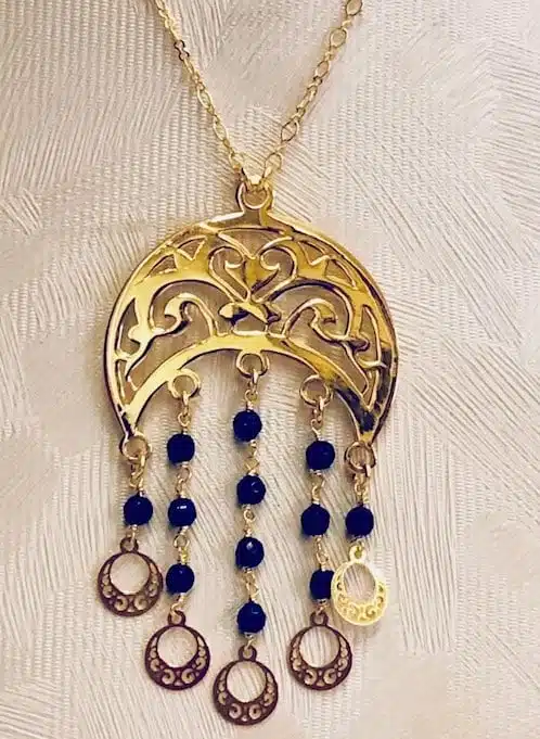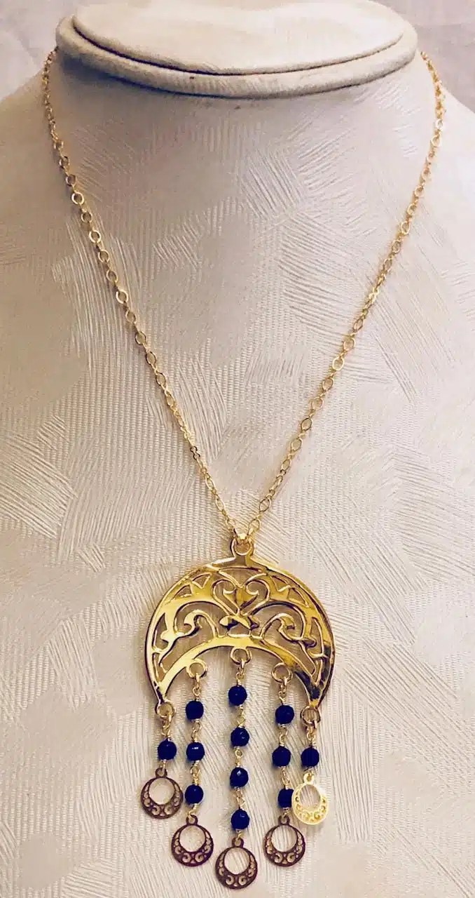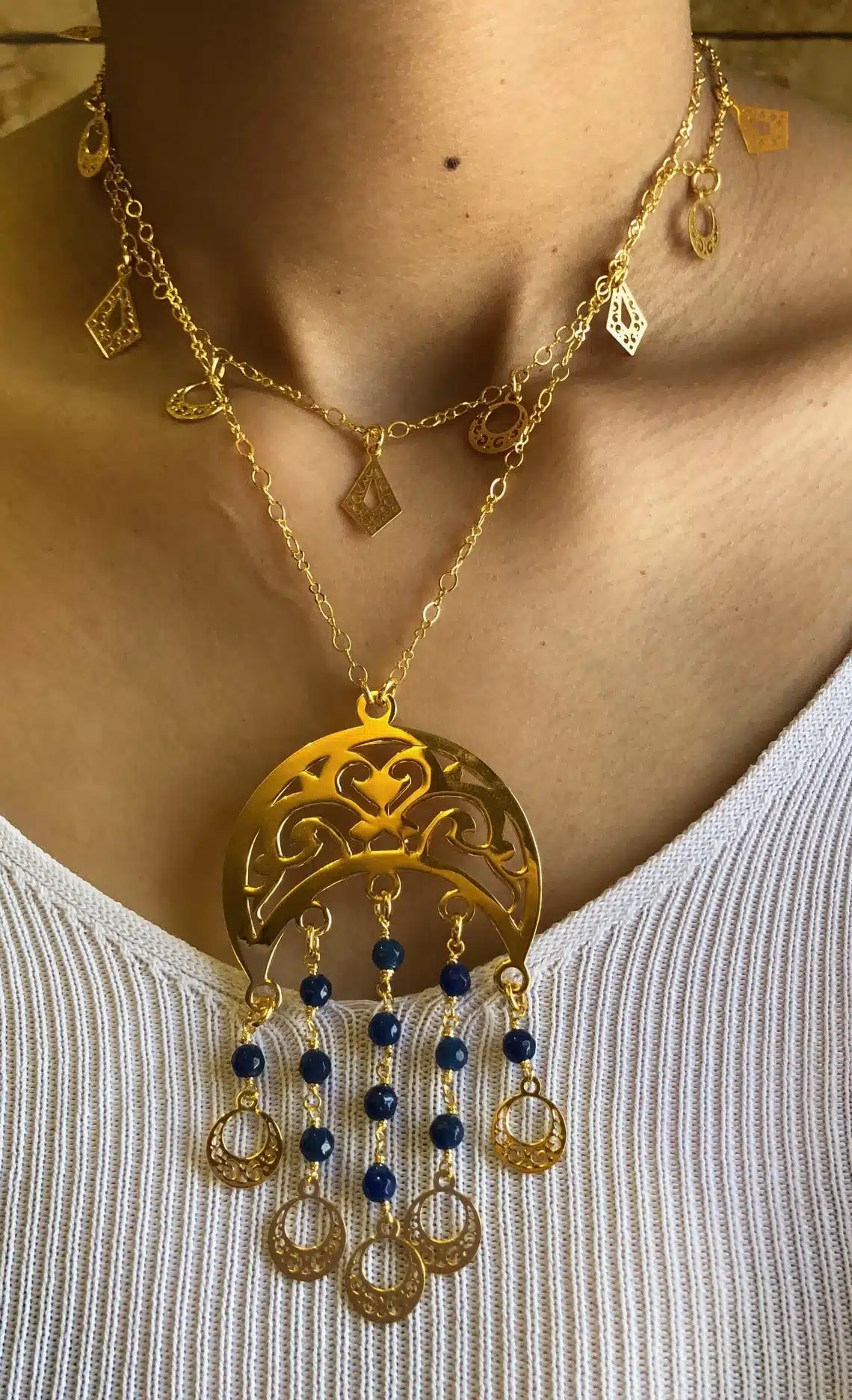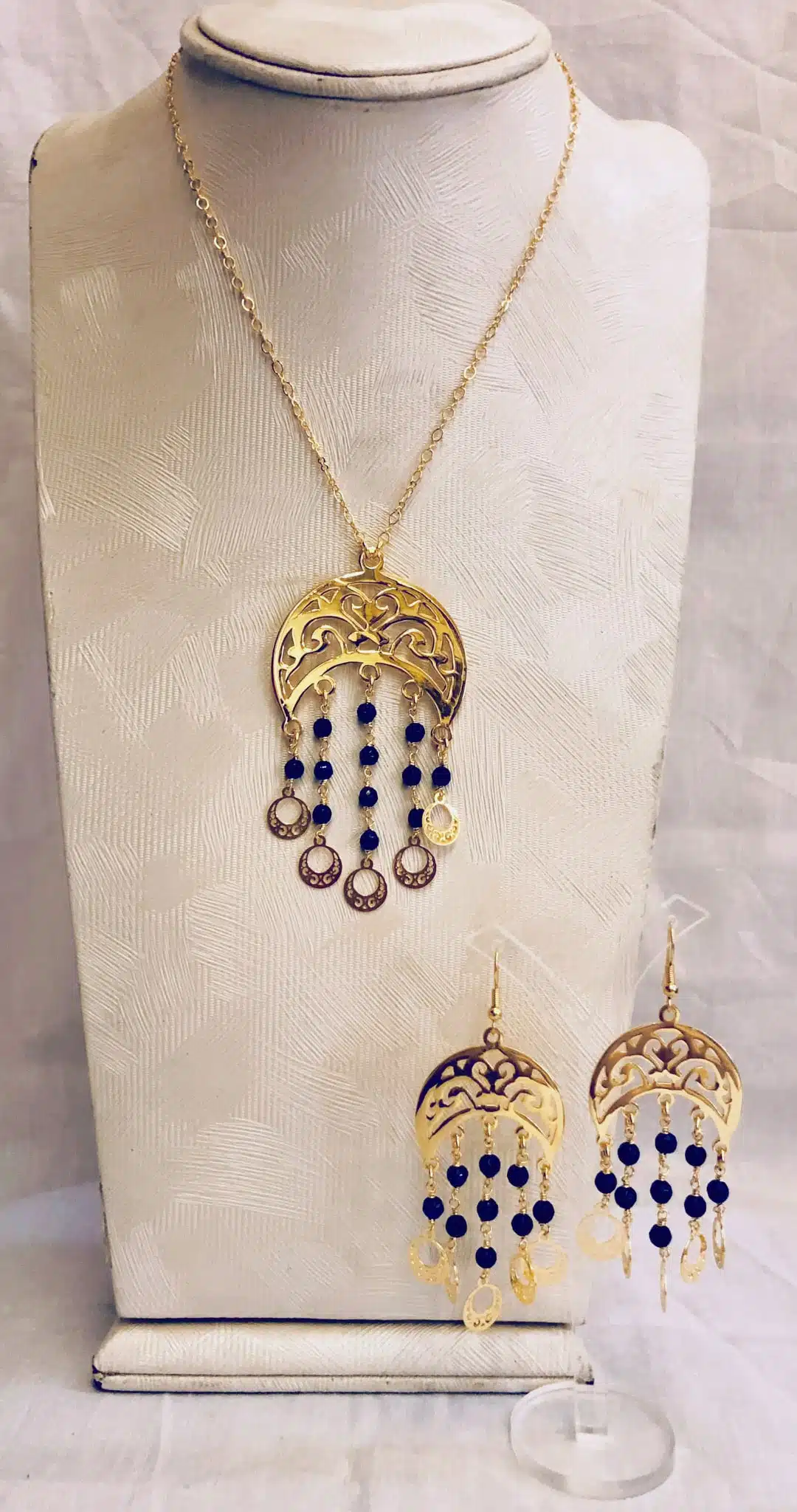 Brass plated with 18K, adorned with navy blue Agat & intricate brass danglings