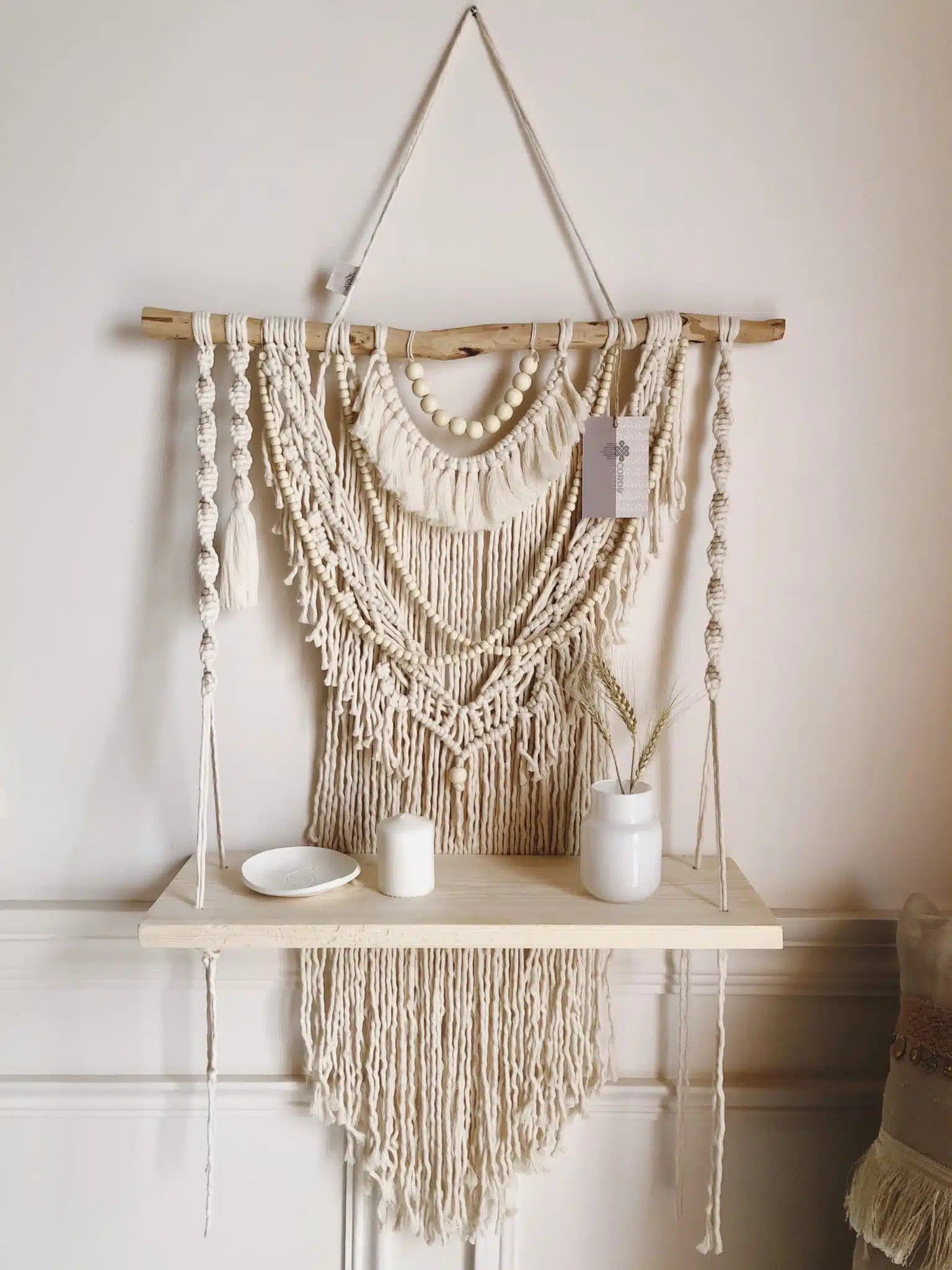 Macramé shelf hanger in delicate cotton yarns and high quality wooden beads