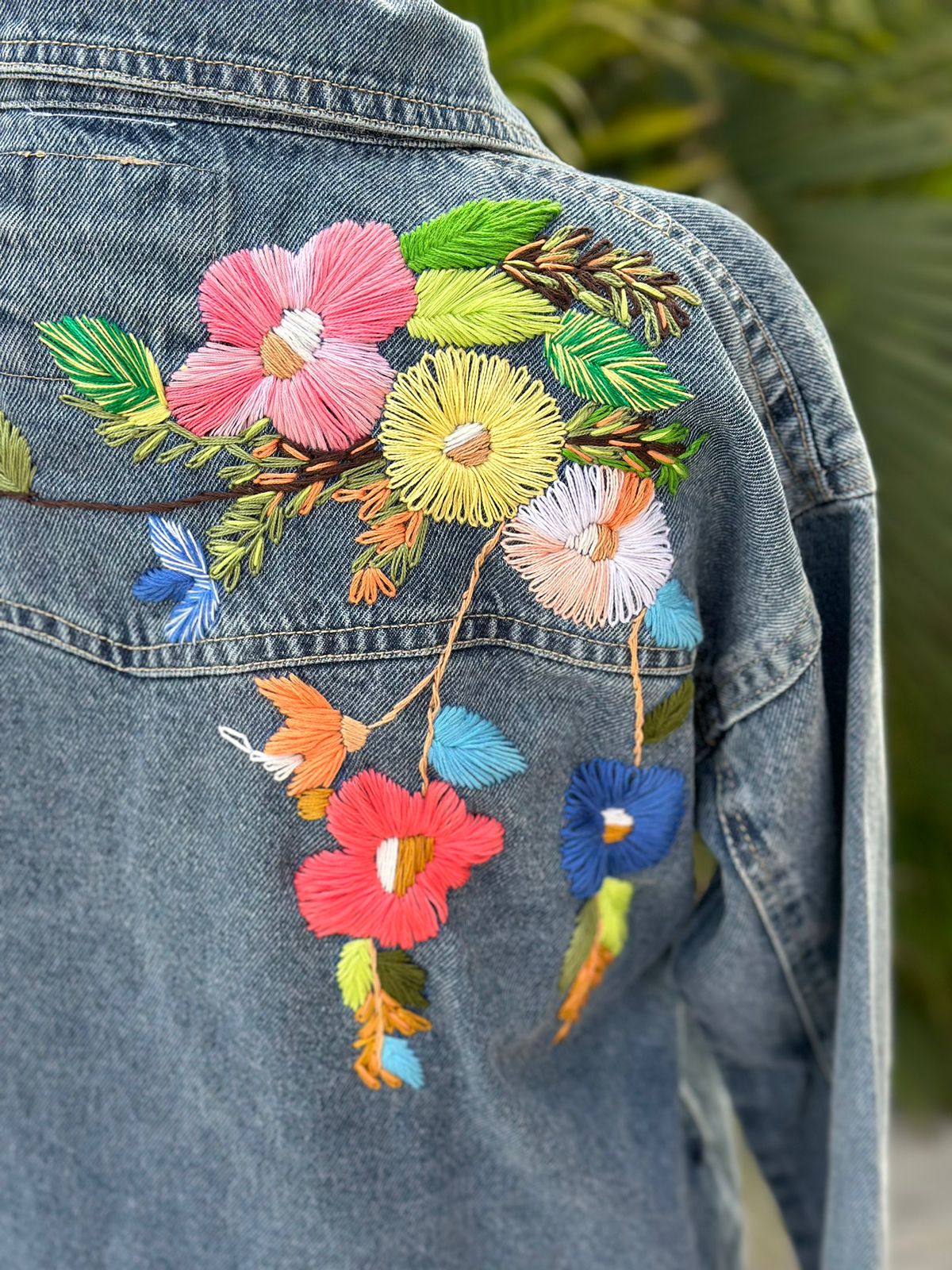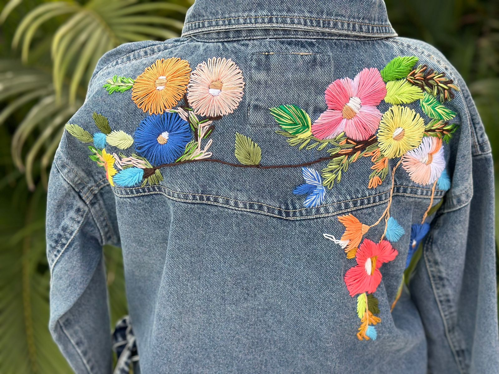 long jacket jeans with hand made flowers