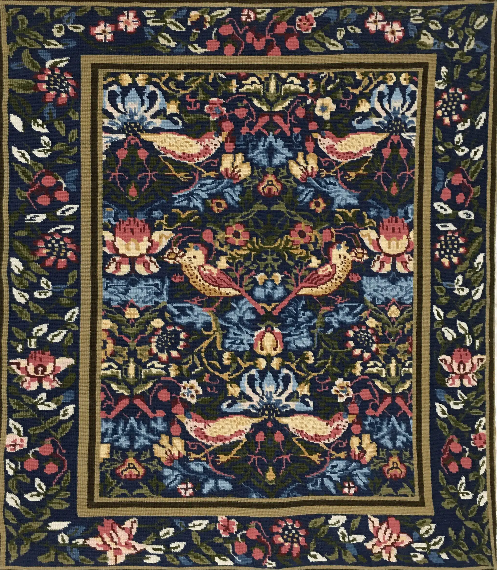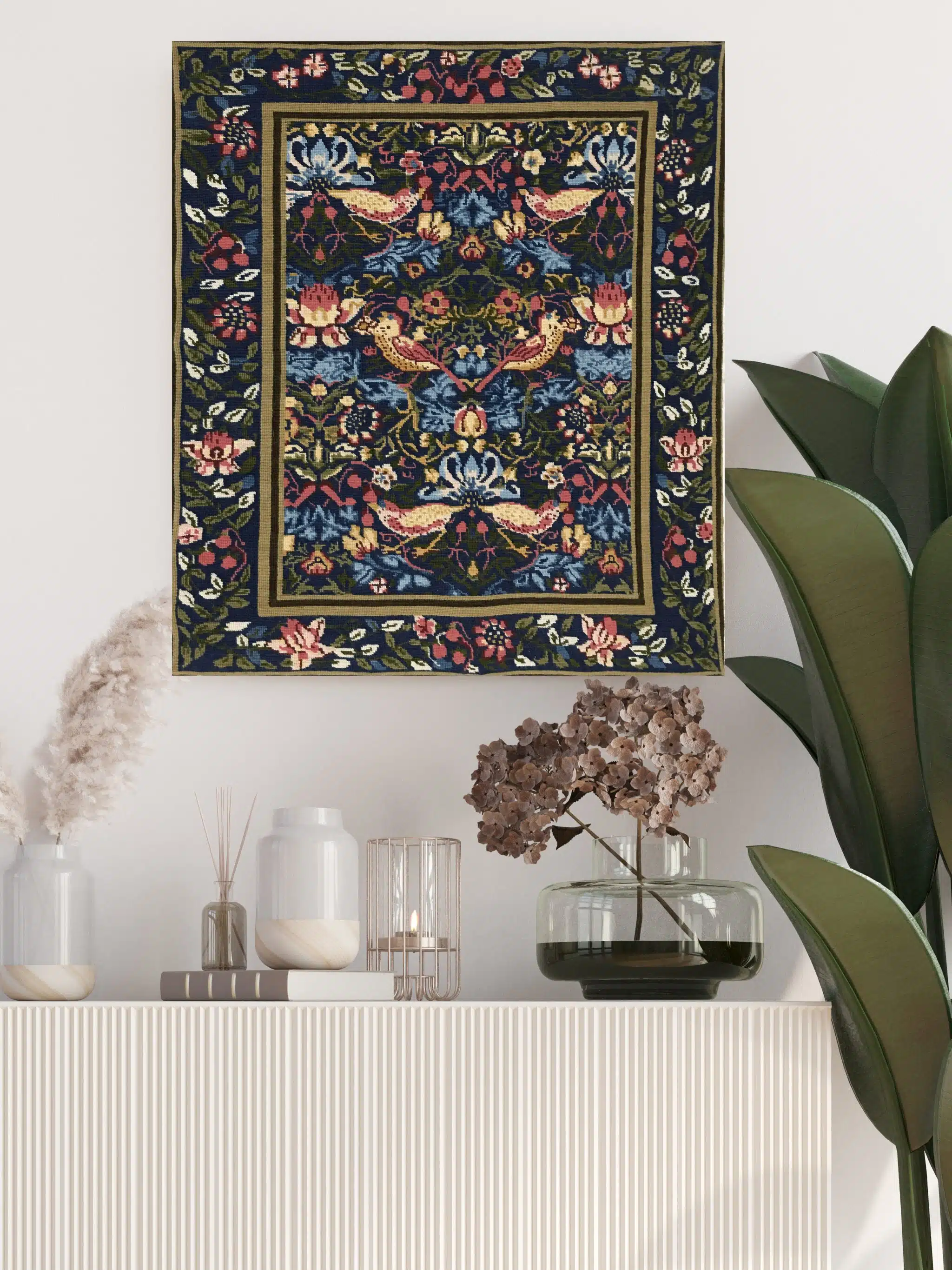 This art piece is an intricate celebration of nature, featuring a mesmerizing interplay of birds and flowers. The design is centered around two graceful birds perched among a lavish array of flora, surrounded by a rich tapestry of vibrant blooms and foliage. The deep blue background contrasts beautifully with the earthy reds, greens, and golds, adding a timeless elegance to the artwork.