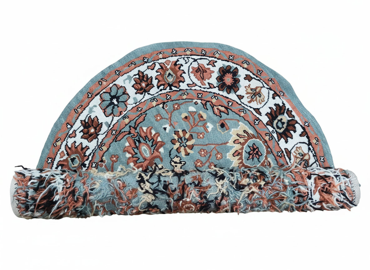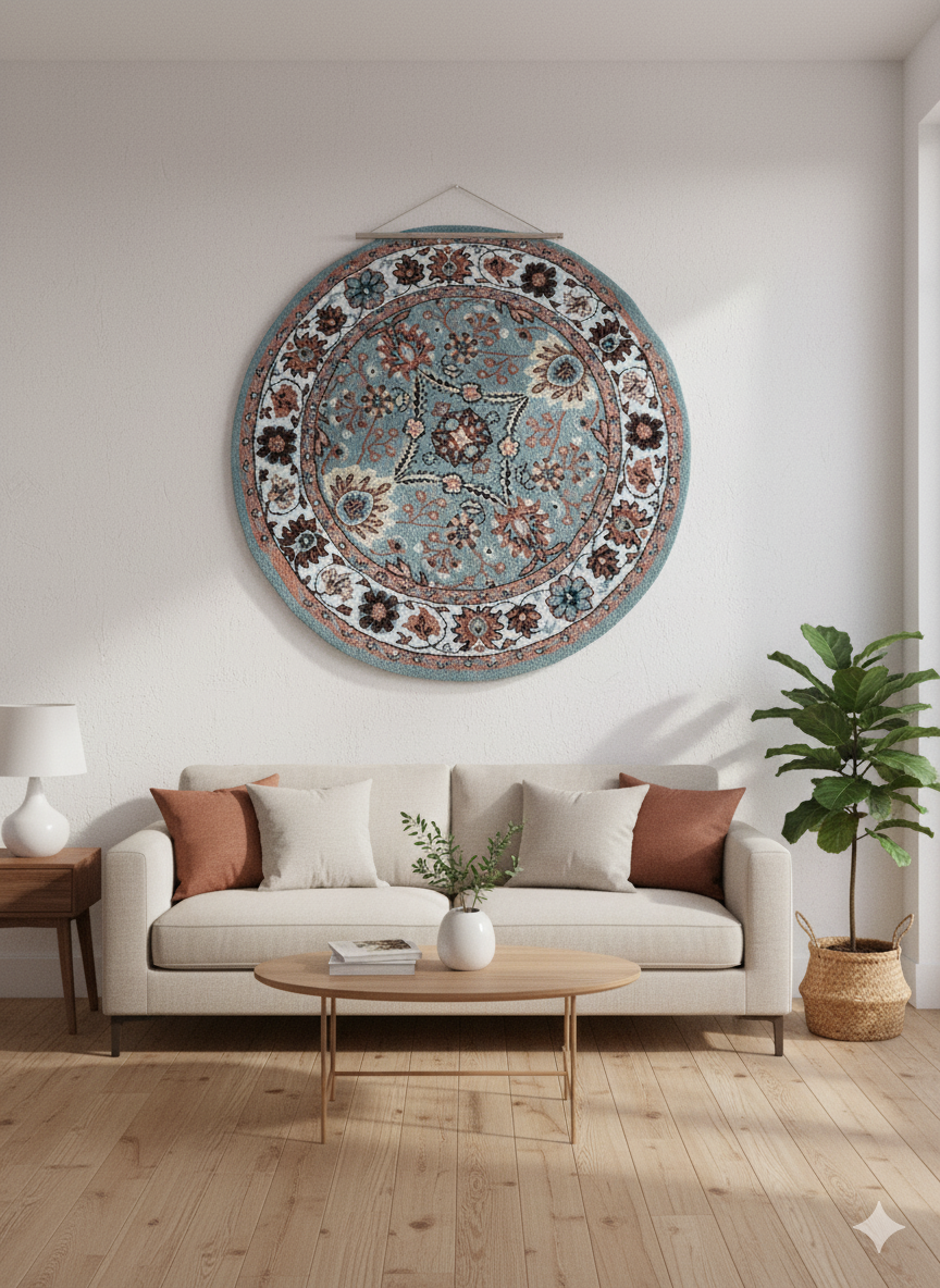 This needlepoint handwoven oval tapestry showcases a classic floral medallion design, featuring intricate patterns and harmonious tones of teal, rust, and cream. The symmetrical layout and delicate detailing make it a timeless piece, ideal for enhancing the elegance of living spaces or as a unique wall hanging.