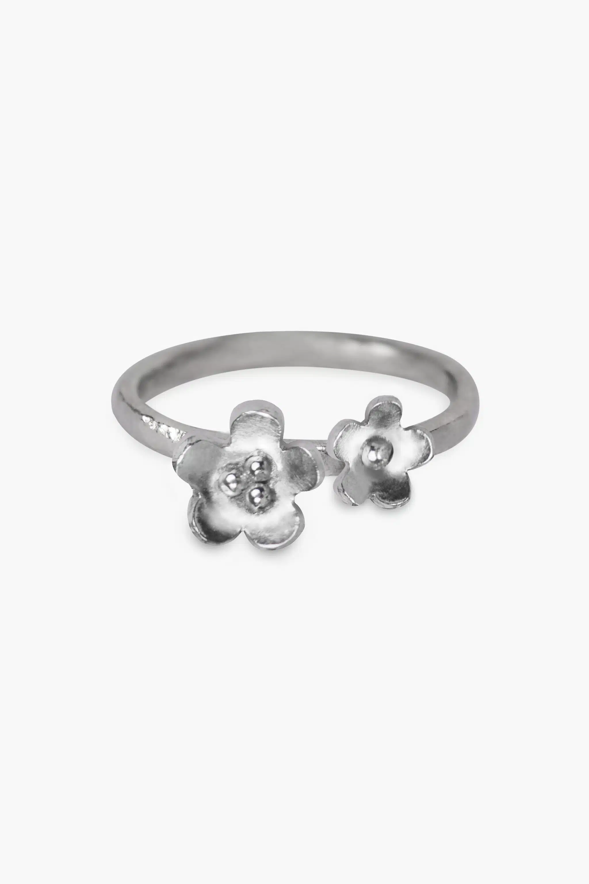 Silver ring with a luminous texture and a delicate flower detail. Accented with a small and a medium sized flower. Perfect for stacking.