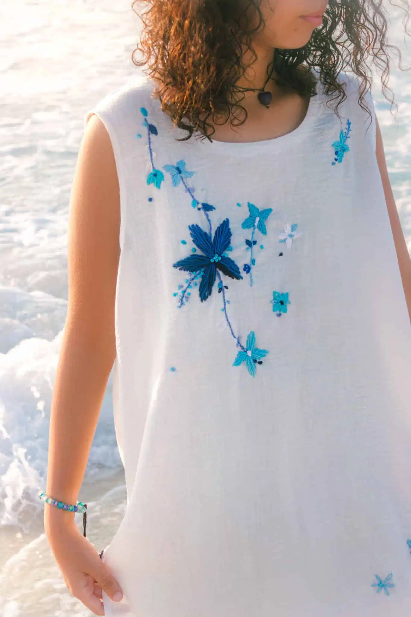 - Whitle cotton linen summer beach dress with hand embroidery.