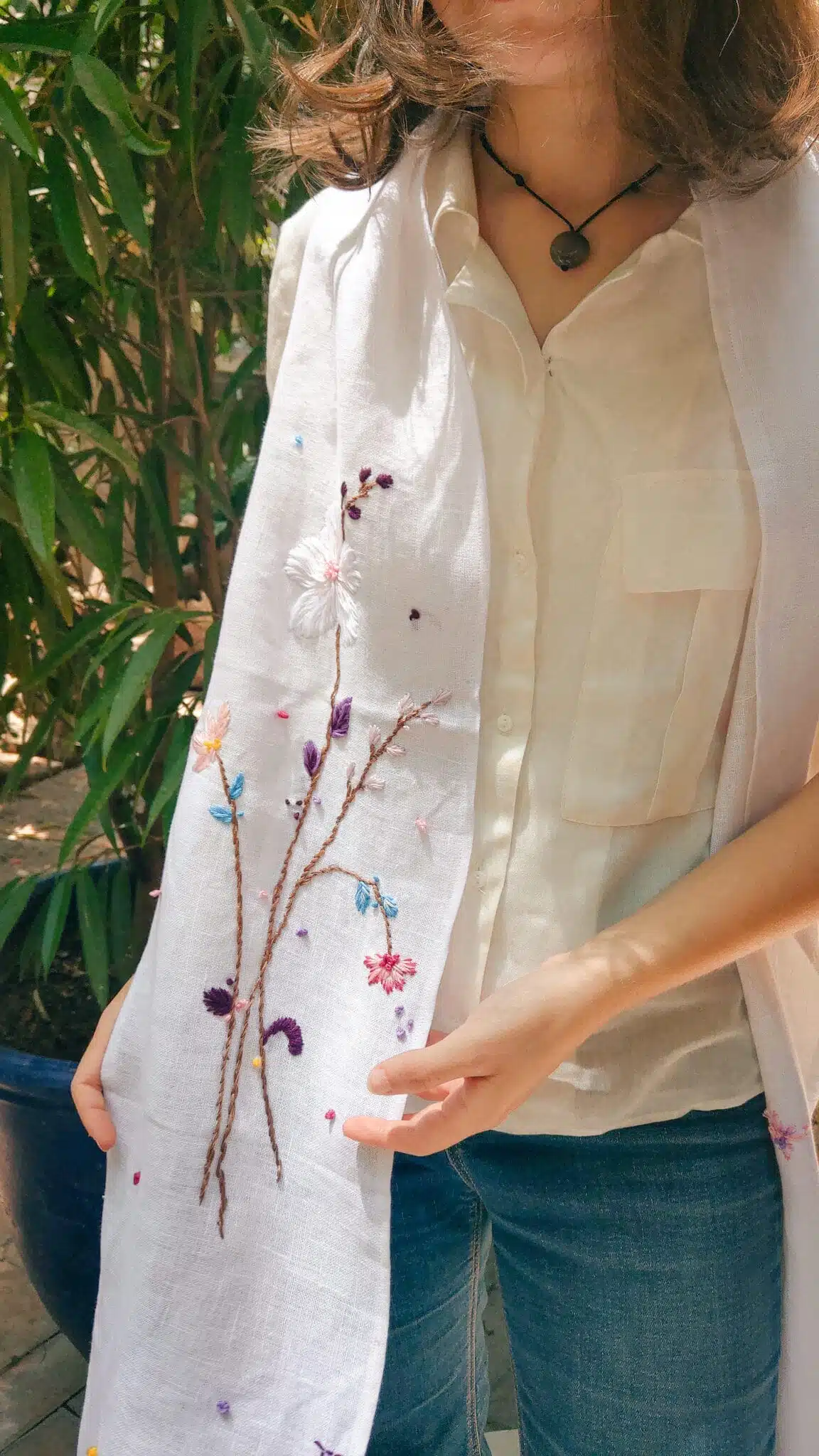White pure linen scarf with handmade embroidery