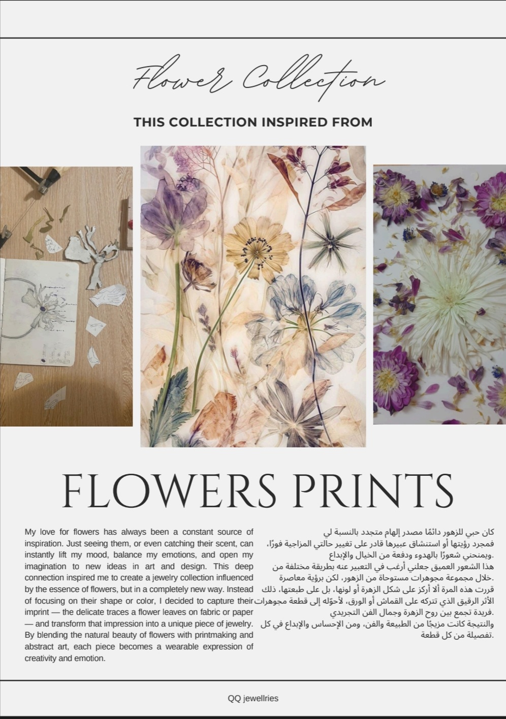 My love for flowers has always been a constant source of inspiration. Just seeing them, or even catching their scent, can instantly lift my mood, balance my emotions, and open my imagination to new ideas in art and design. This deep connection inspired me to create a jewelry collection influenced by the essence of flowers, but in a completely new way. Instead of focusing on their shape or color, I decided to capture their imprint — the delicate traces a flower leaves on fabric or paper — and transform that impression into a unique piece of jewelry. By blending the natural beauty of flowers with printmaking and abstract art, each piece becomes a wearable expression of creativity and emotion.