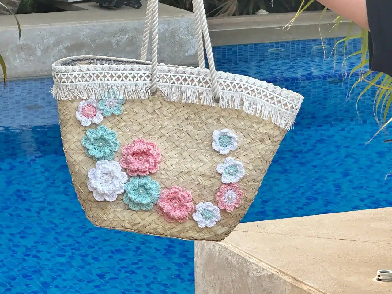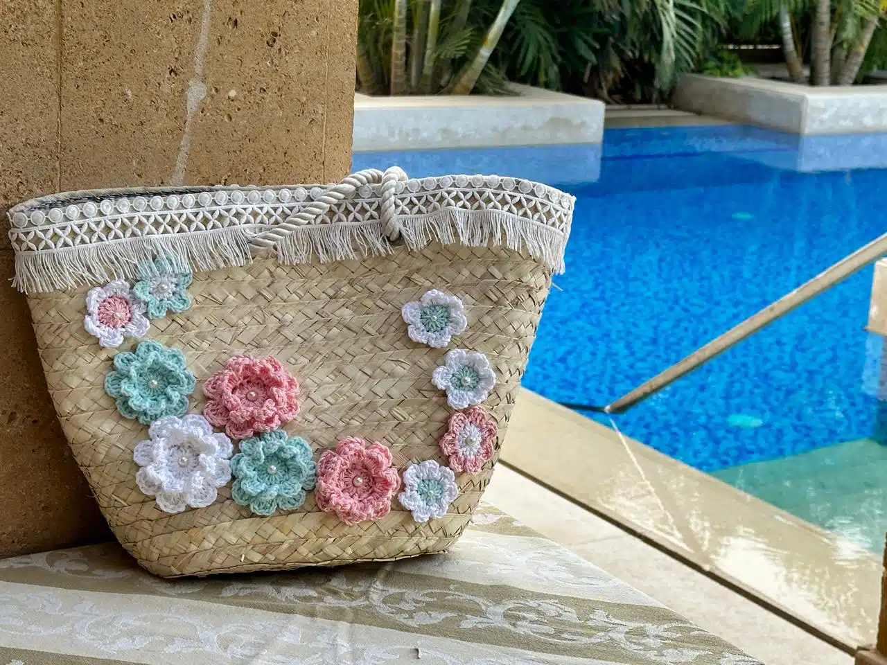 Palm leaves beach bag decorated with pastel colored Crochet flowers .lined from inside and has a zipper.
