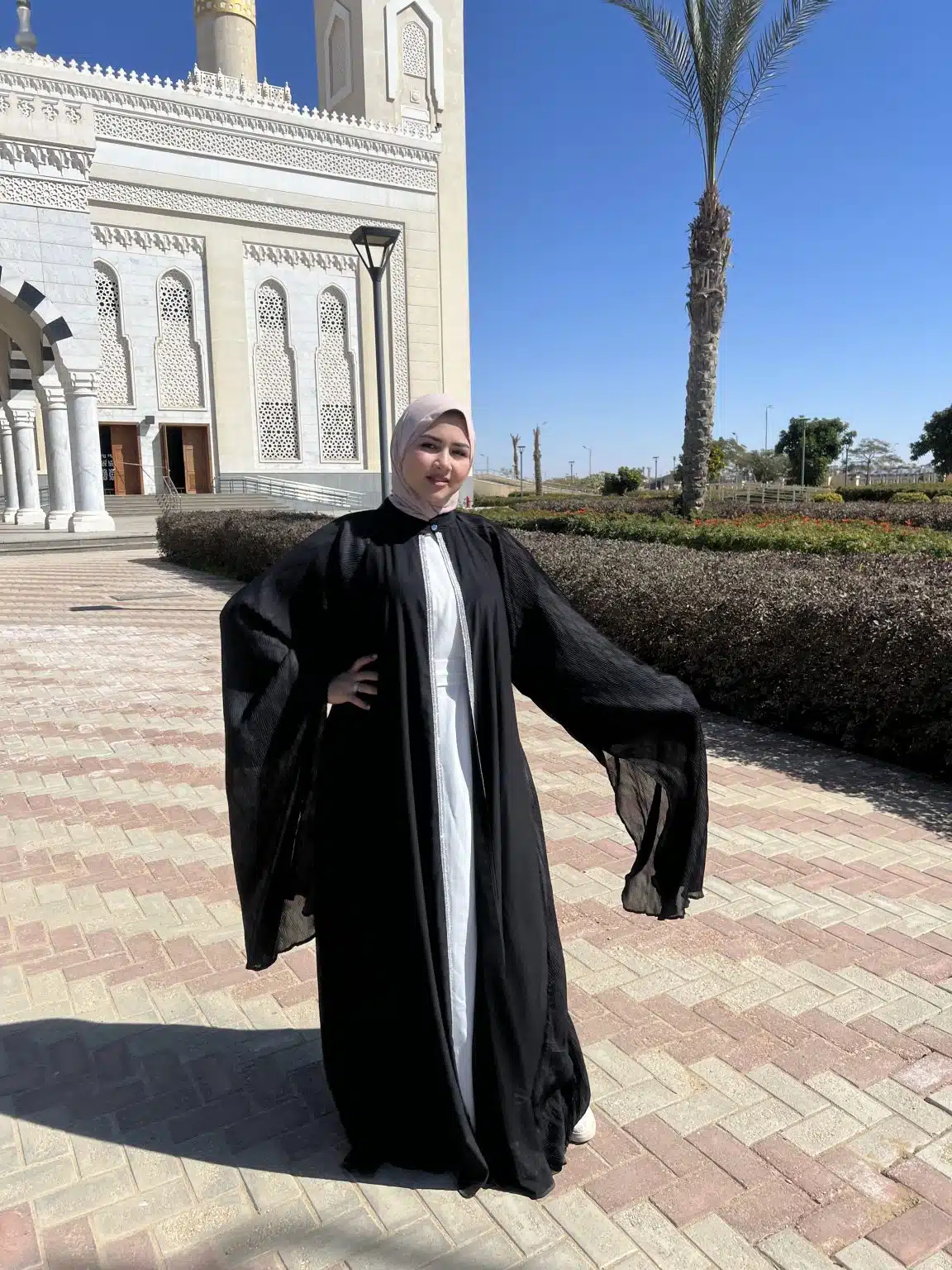The Flowy Black Kaftan is a perfect blend of elegance and comfort, designed for those who appreciate timeless style. Made from a cool, breathable black fabric, it drapes beautifully for a graceful and effortless look. Featuring pleated (pleisée) super-long sleeves and pleated sides, it adds movement and sophistication to any outfit. Delicate silver embroidery enhances its elegance, making it a versatile choice for Ramadan outings, prayers, family gatherings, and special occasions.