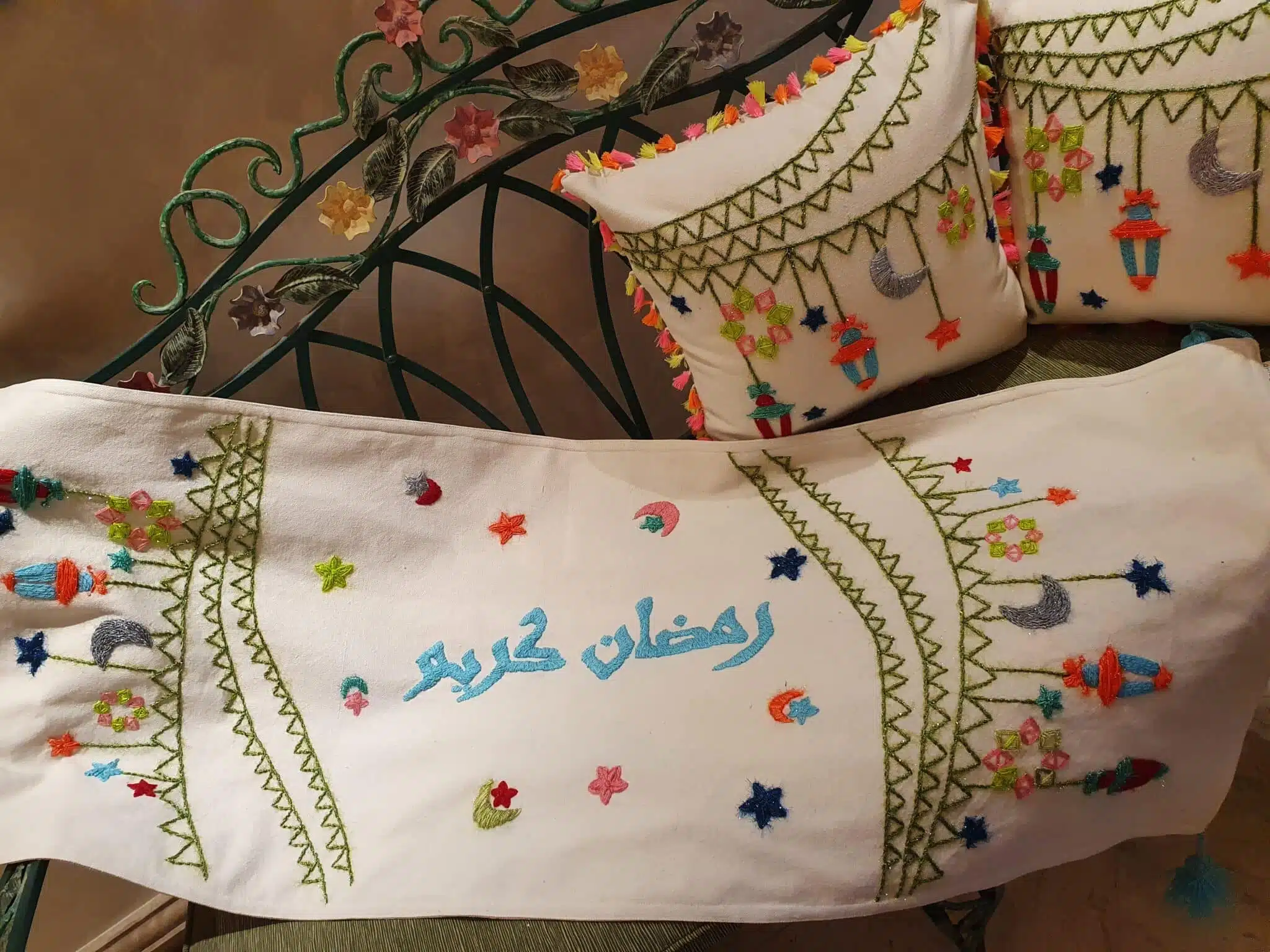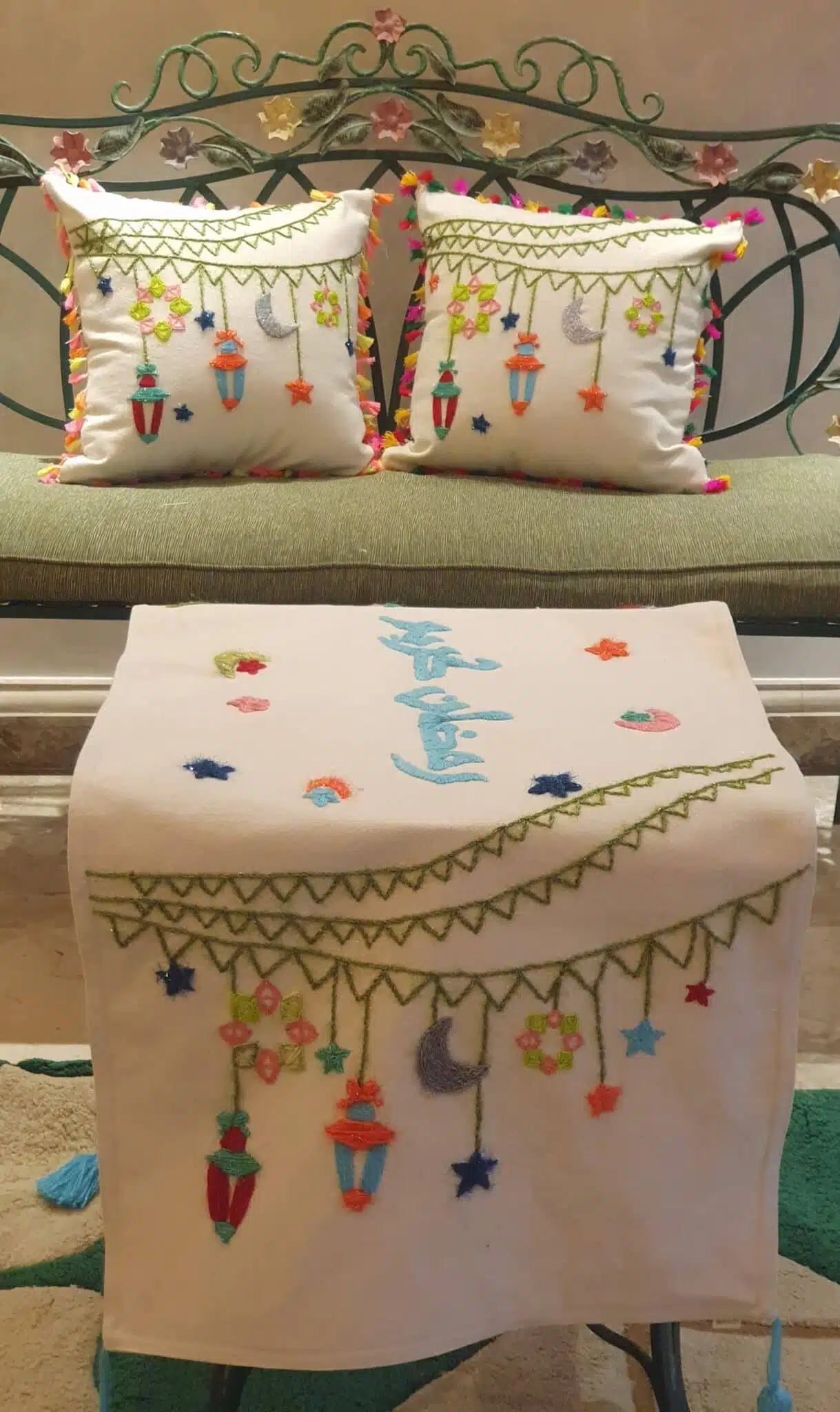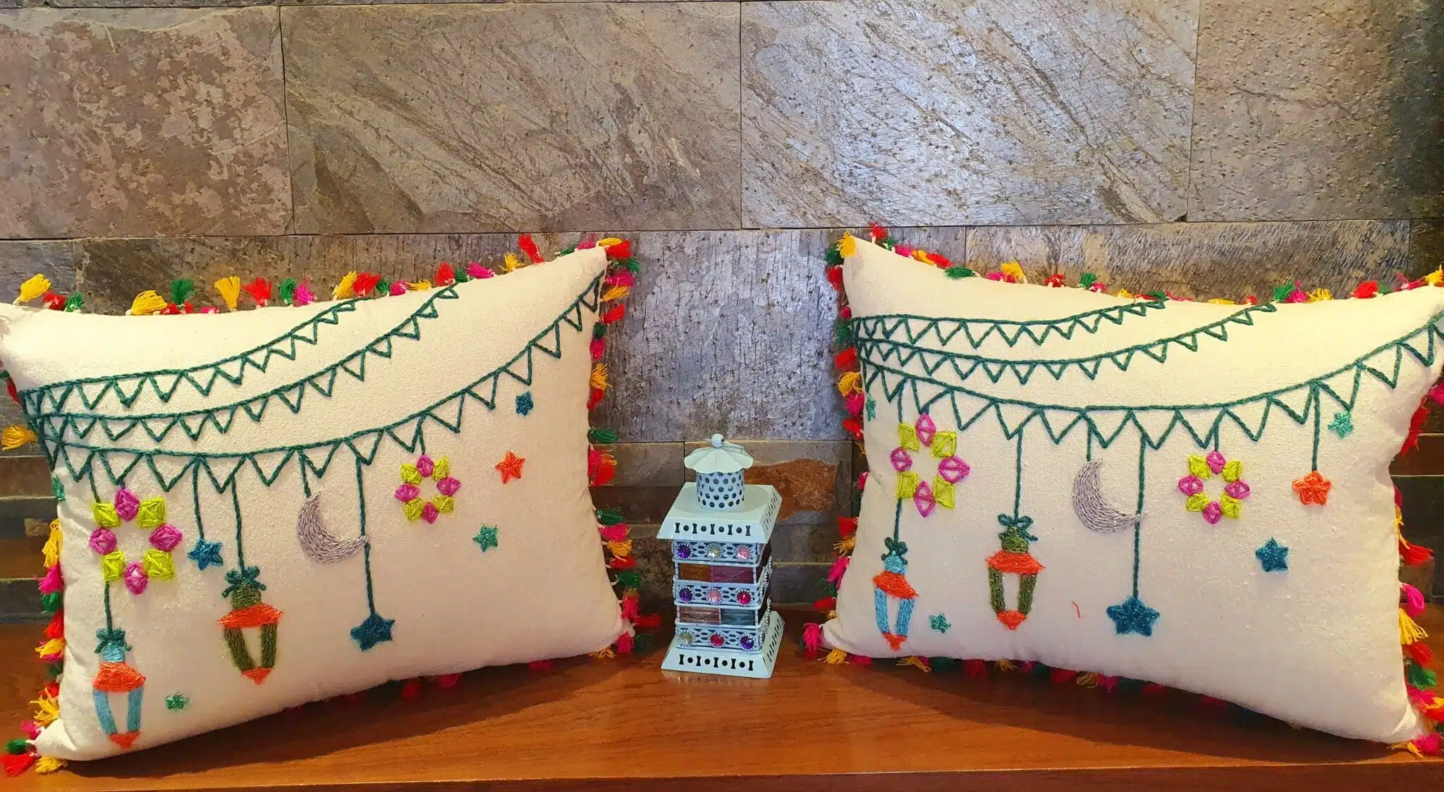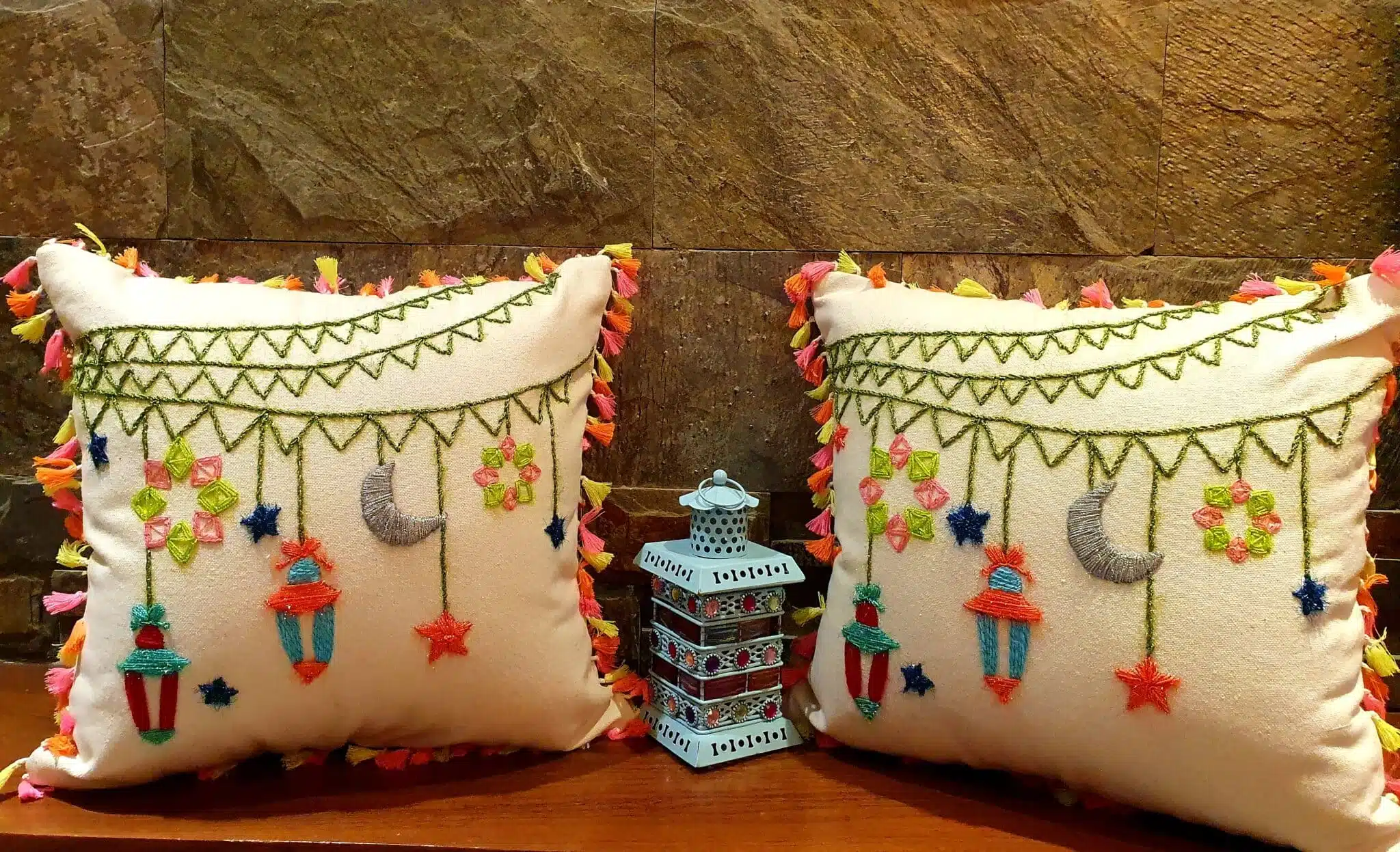 Handmade embroidery cushion 40×30 or 40×40 cm . Cordon franchet is depending on availability in the market or replaced by colorful bonbon.