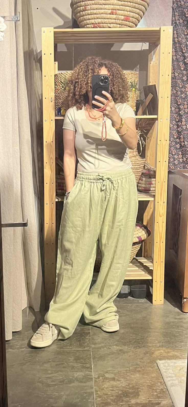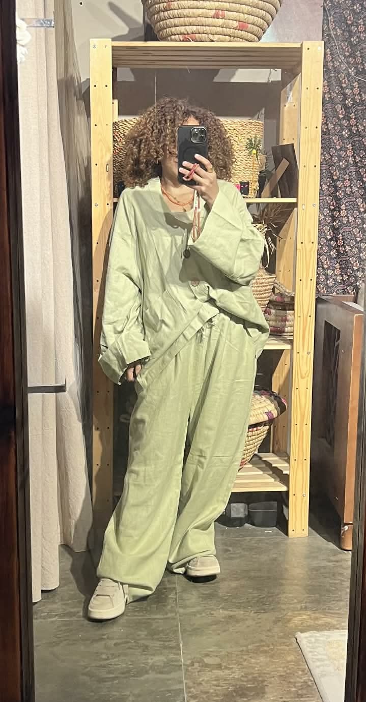 كارديجان و بنطلون لون زيتوني فاتح من الكتان