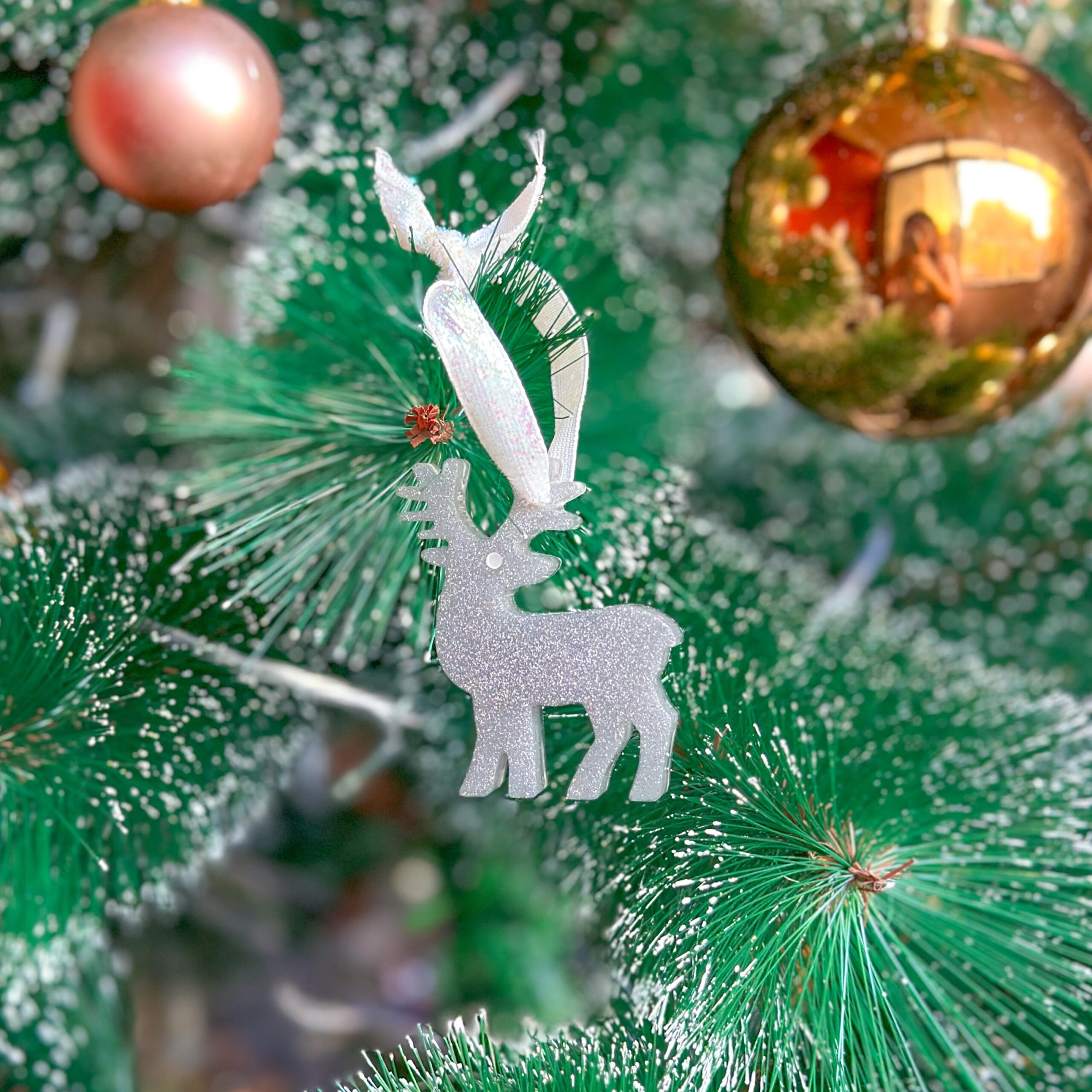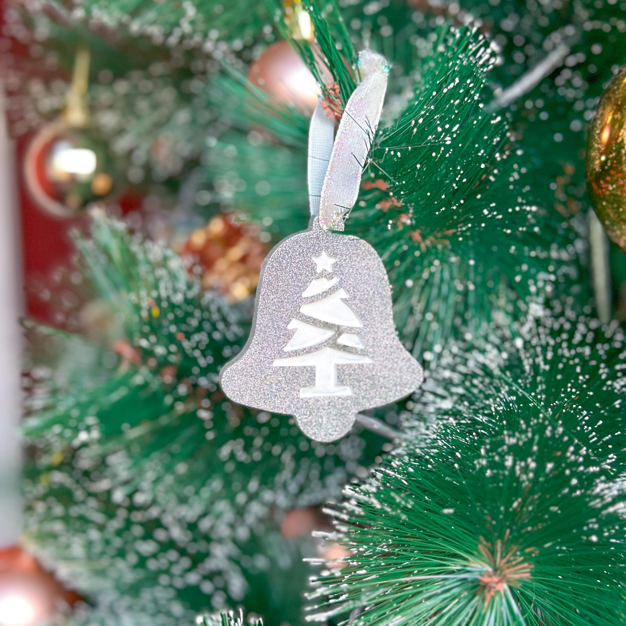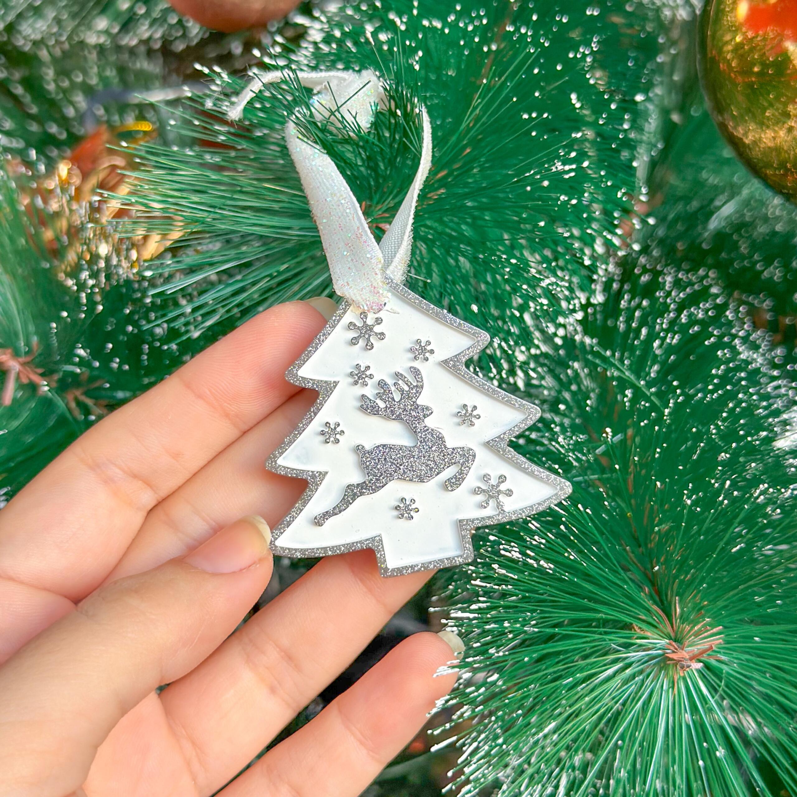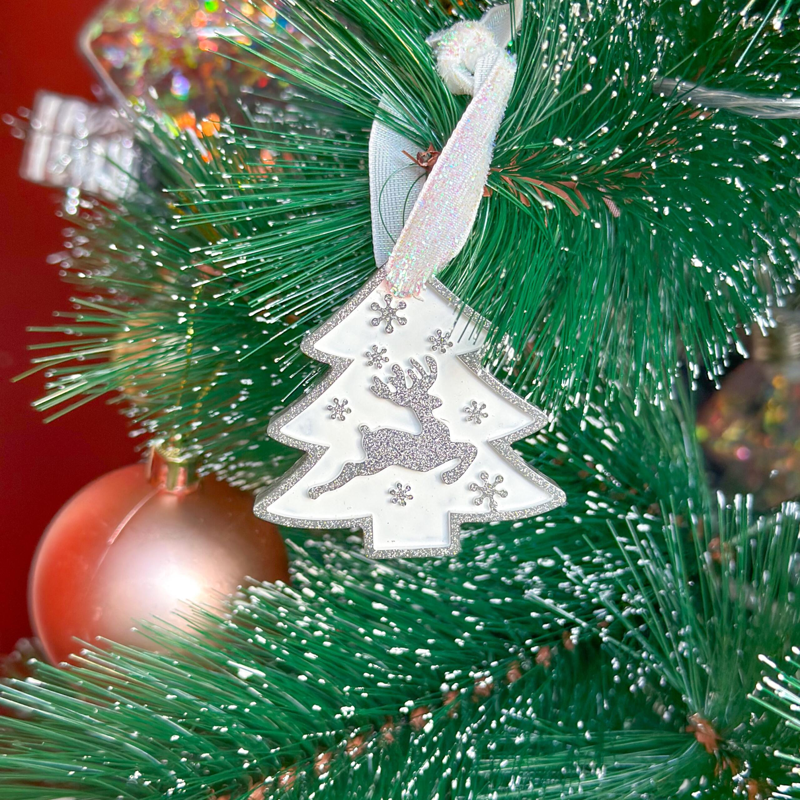 This curated set of 5 resin ornaments includes a reindeer, bells, snowflake and a tree — each sparkling with festive silver, white, and gold accents. Lightweight yet durable, they’re perfect for trees, gifts, or holiday decor. Comes ready to hang with iridescent ribbons.